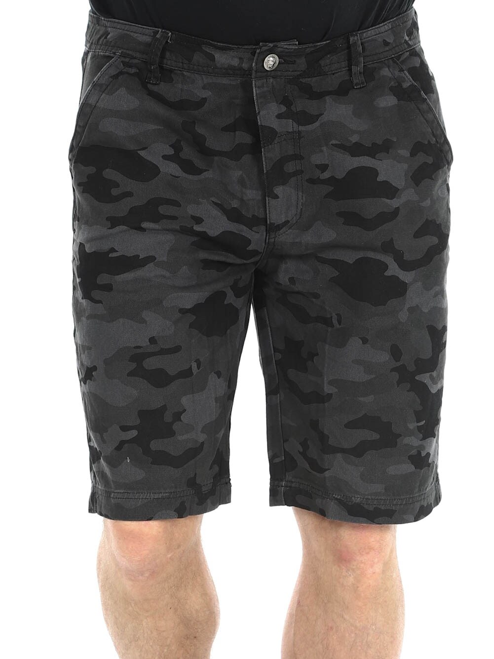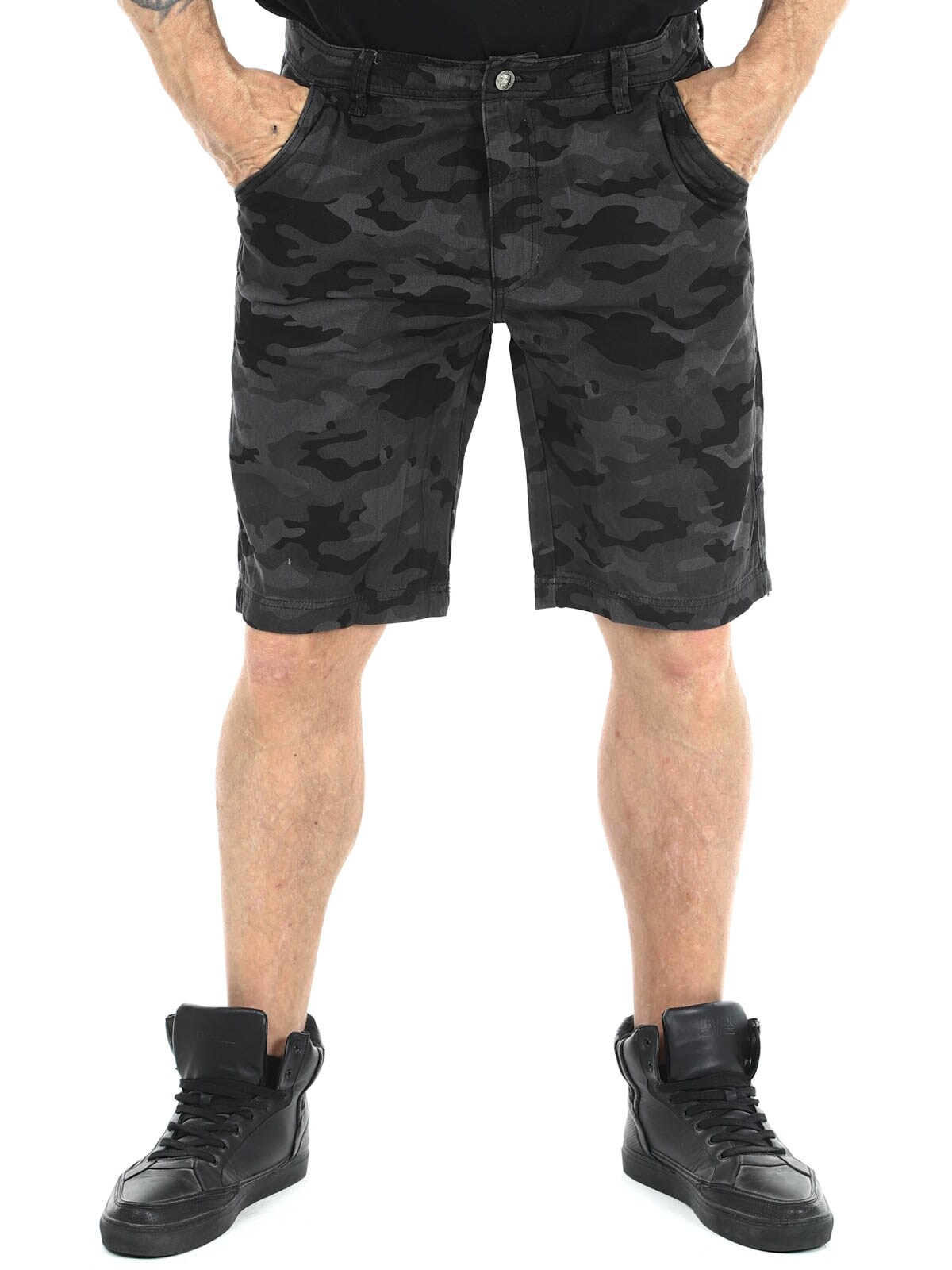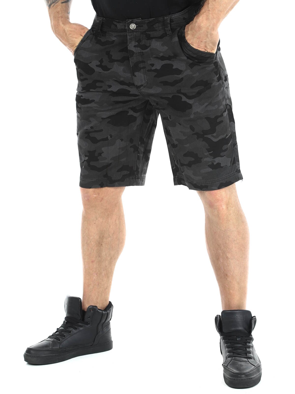 Shorts i denimmateriale med camomønster. De har fire lommer og beltehemper i midjen. Sølvknapper med hodeskallemotiv for ekstra attitude.