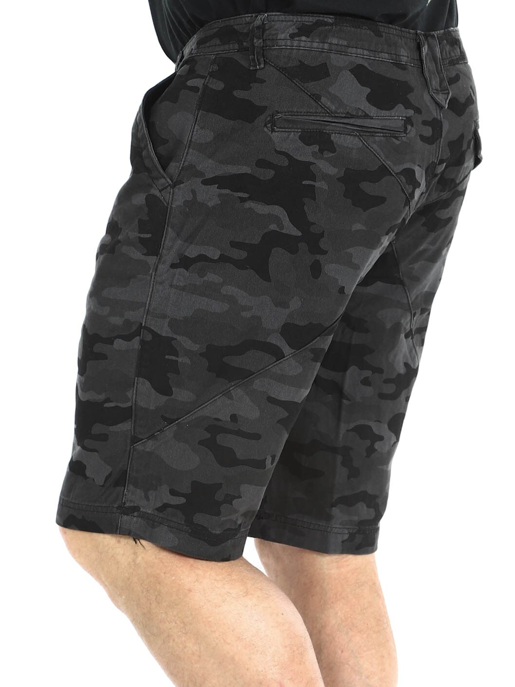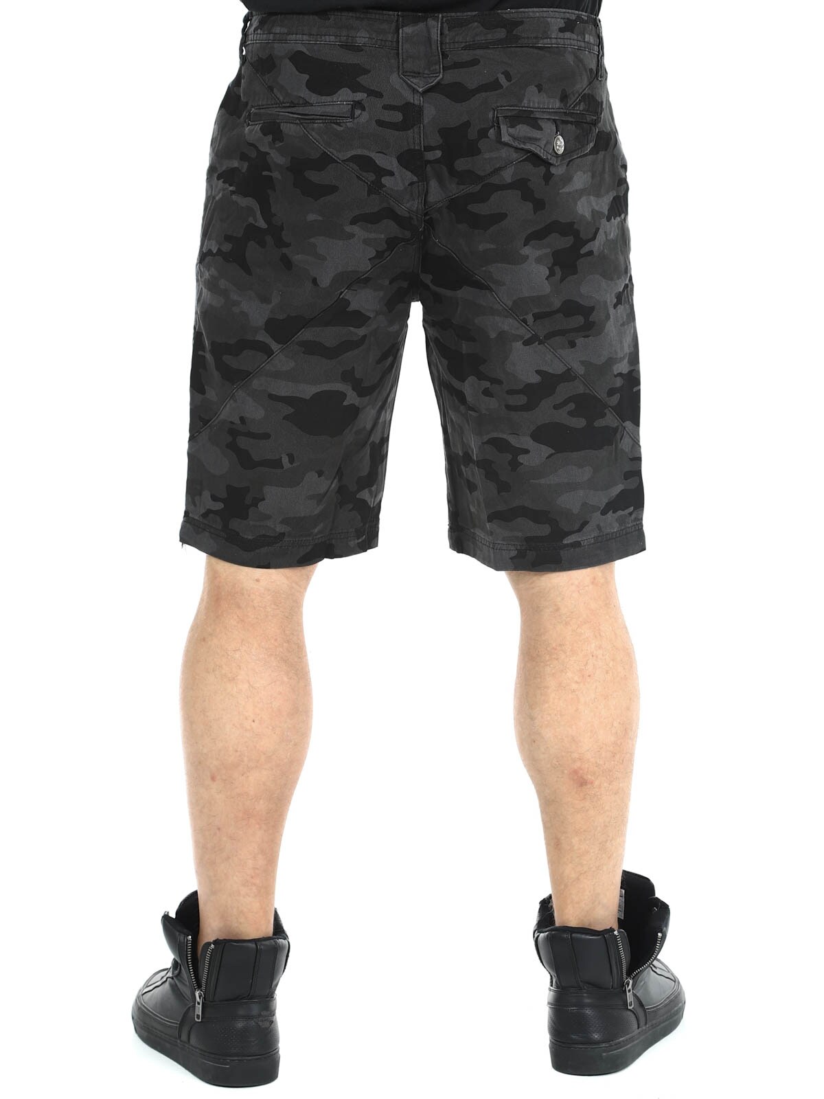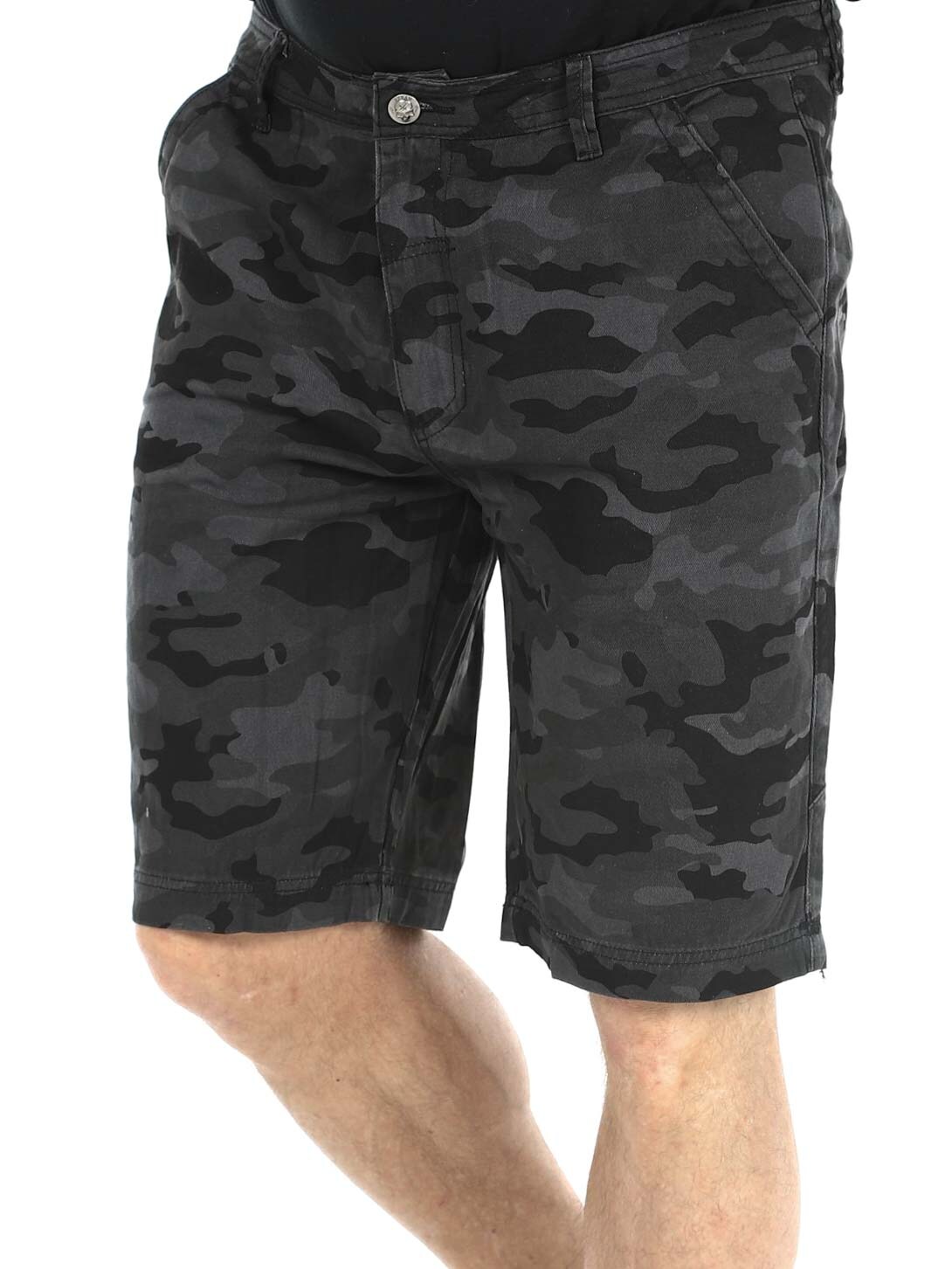 Shorts i denimmateriale med camomønster. De har fire lommer og beltehemper i midjen. Sølvknapper med hodeskallemotiv for ekstra attitude.