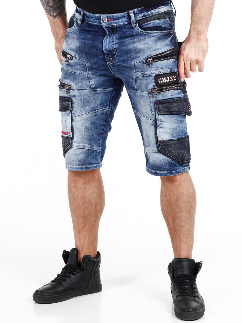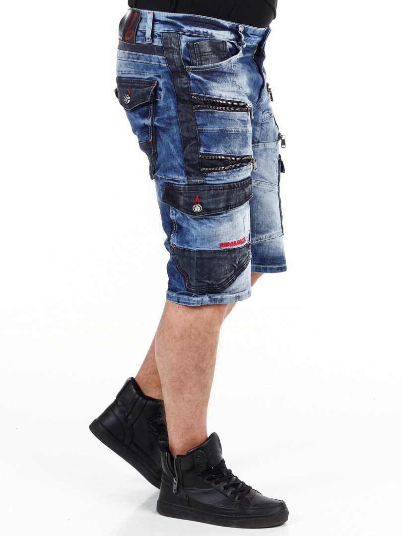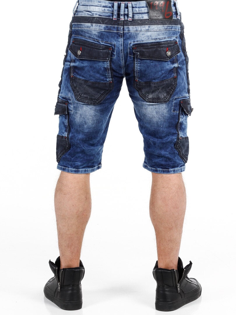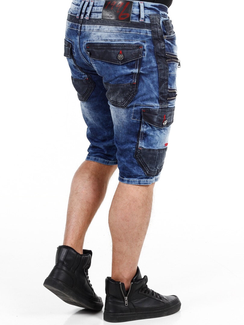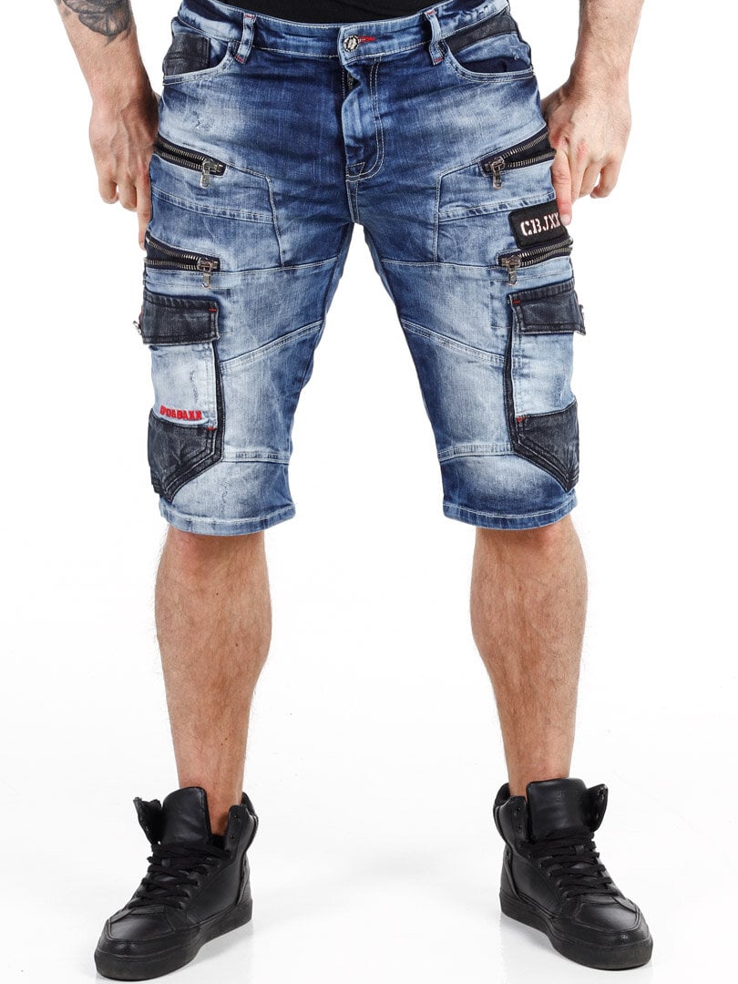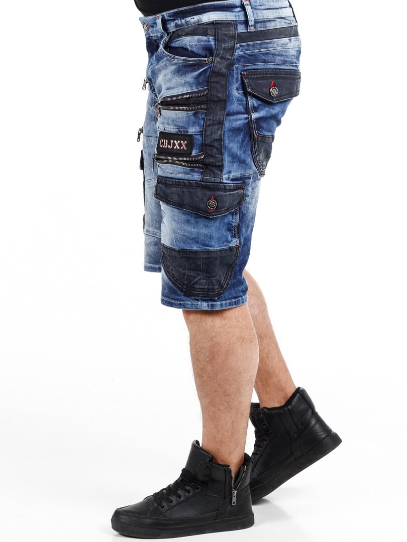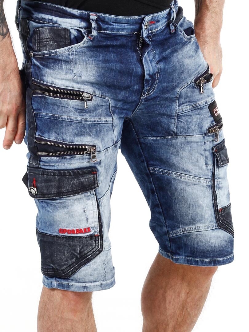 Denimshorts i svart og blått med rippede partier, glidelåser og patch. De har lukkbare cargolommer, tre åpne lommer foran og to baklommer.
