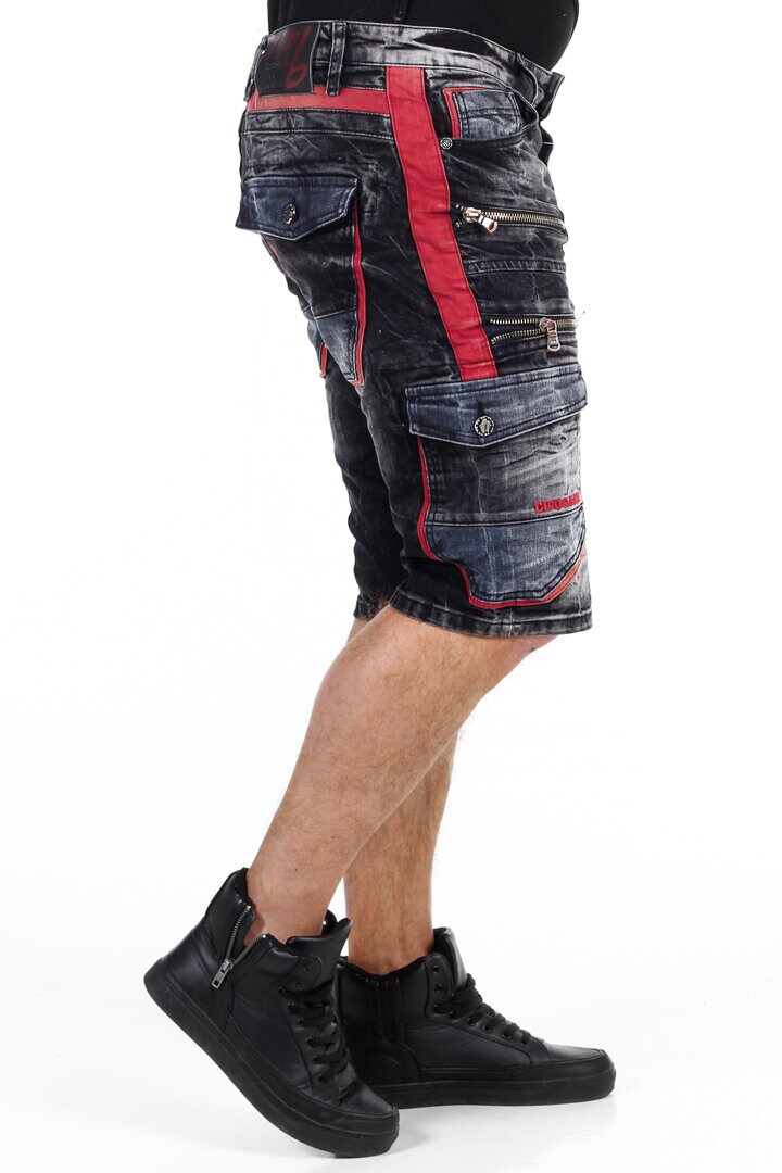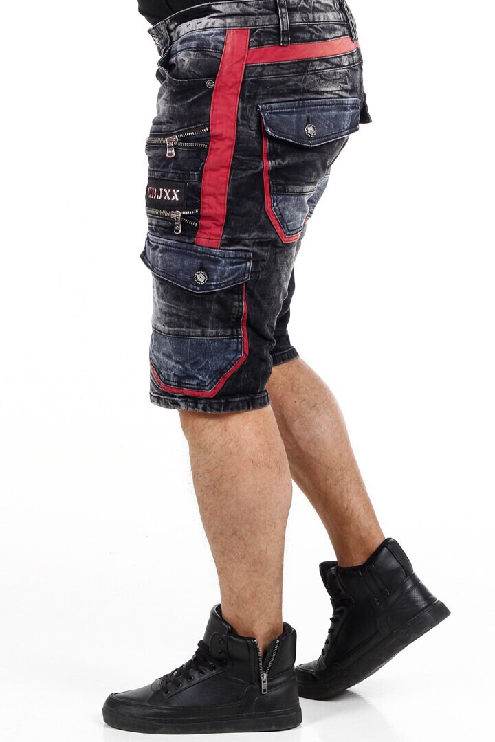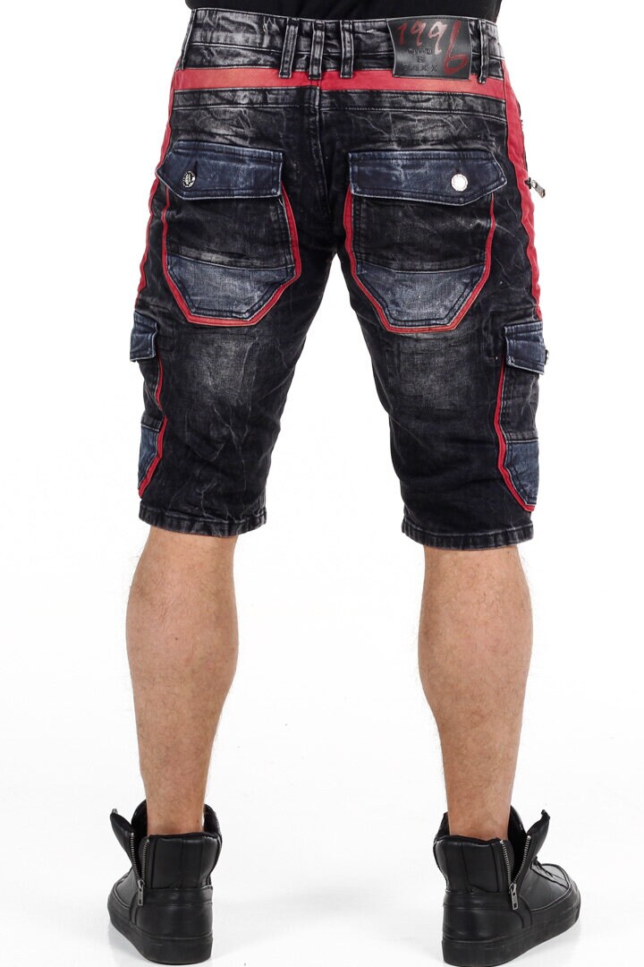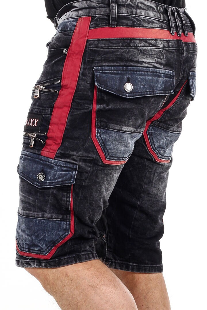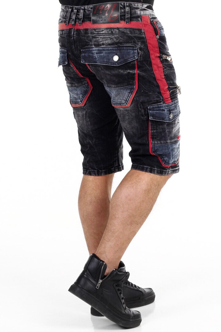 Stretchy denimshorts i en utvasket svart nyanse med røde effekter og chunky glidelåser. De har cargolommer på sidene, lommer som kan lukkes bak og tre åpne lommer foran. En stor lapp med logoen i svart skinnimitasjon sitter i linningen bak på shortsen.