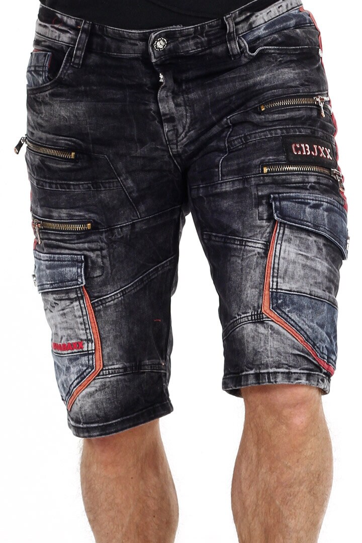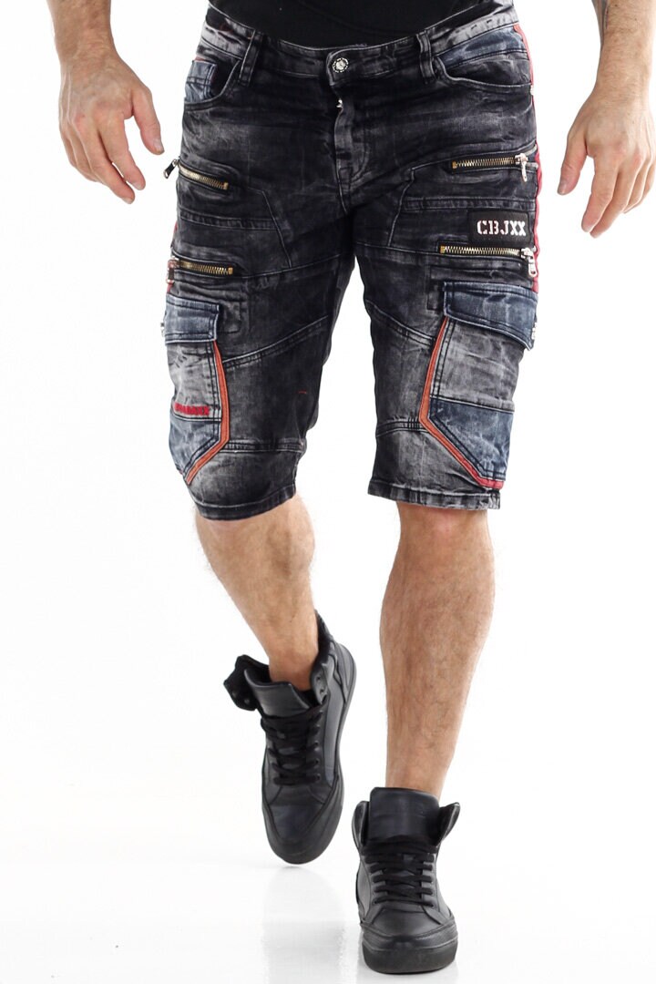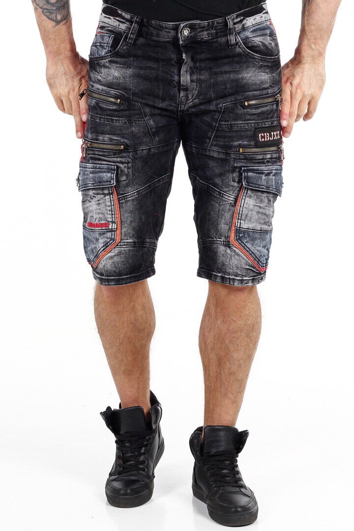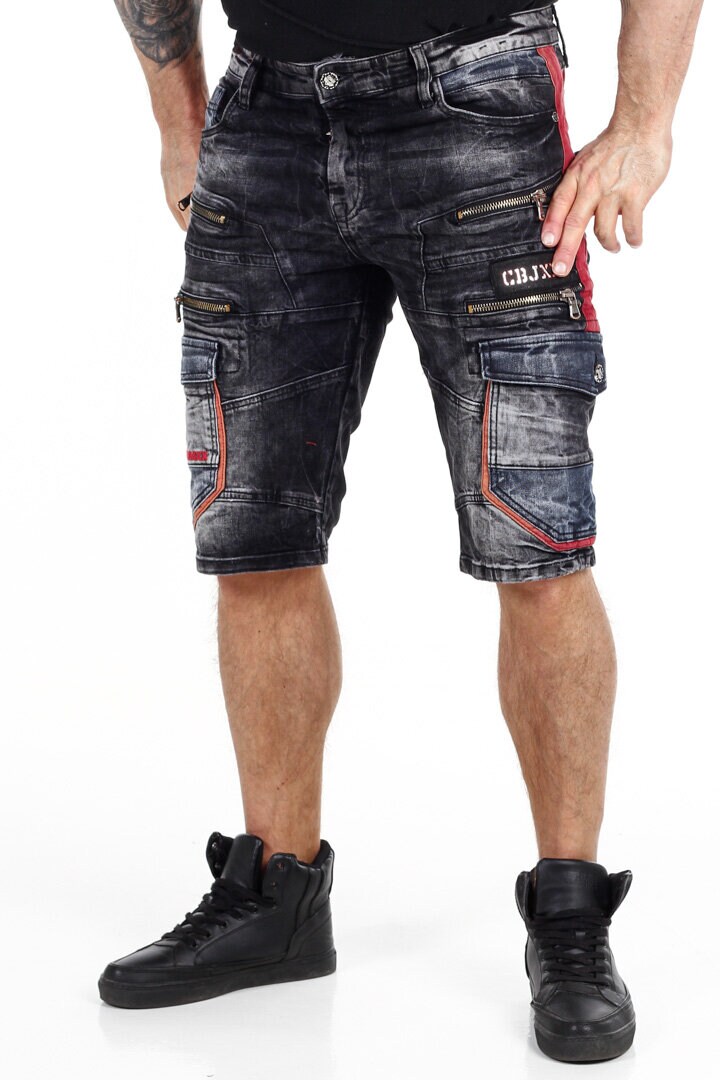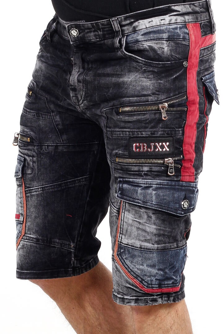 Stretchy denimshorts i en utvasket svart nyanse med røde effekter og chunky glidelåser. De har cargolommer på sidene, lommer som kan lukkes bak og tre åpne lommer foran. En stor lapp med logoen i svart skinnimitasjon sitter i linningen bak på shortsen.