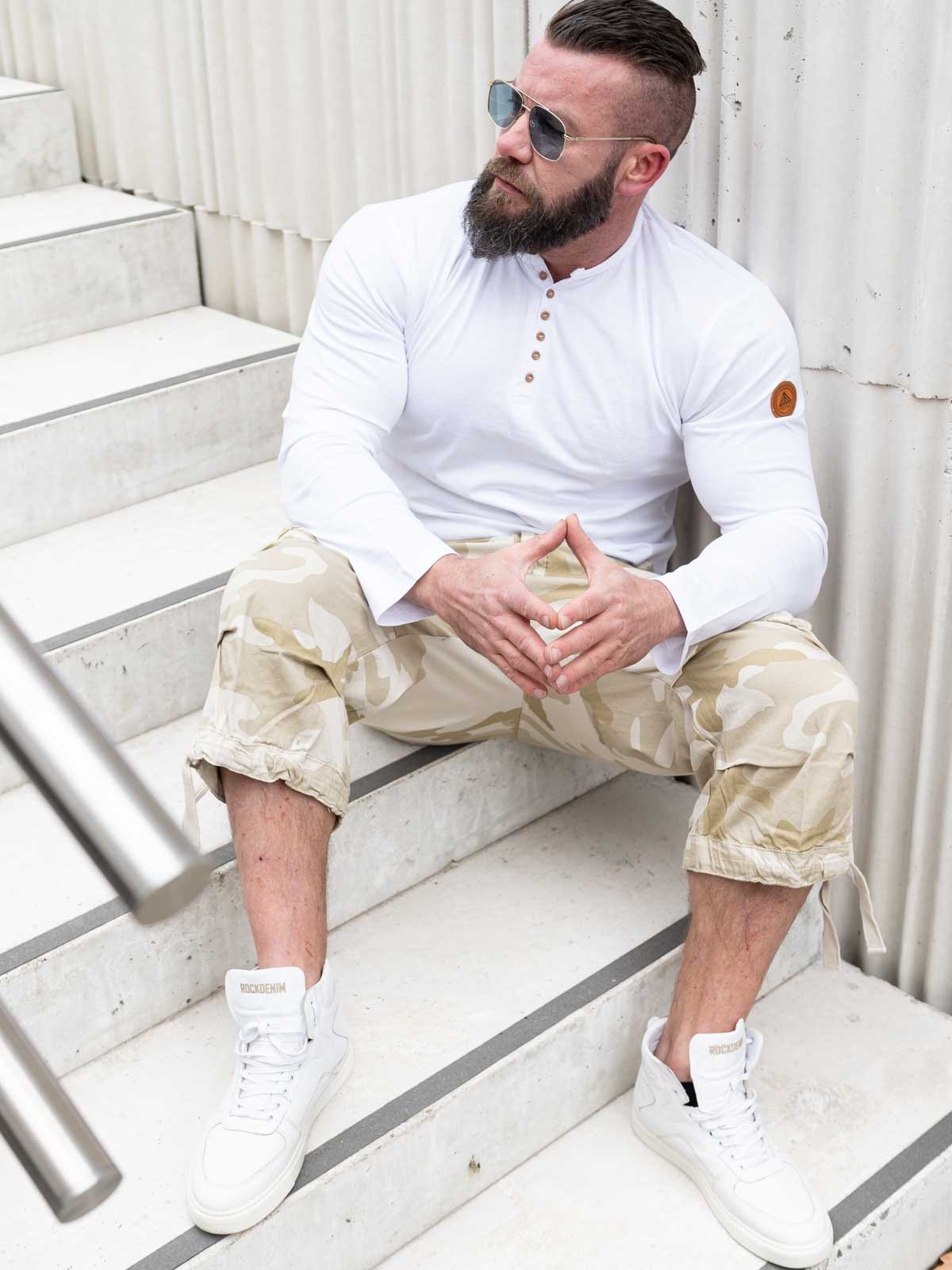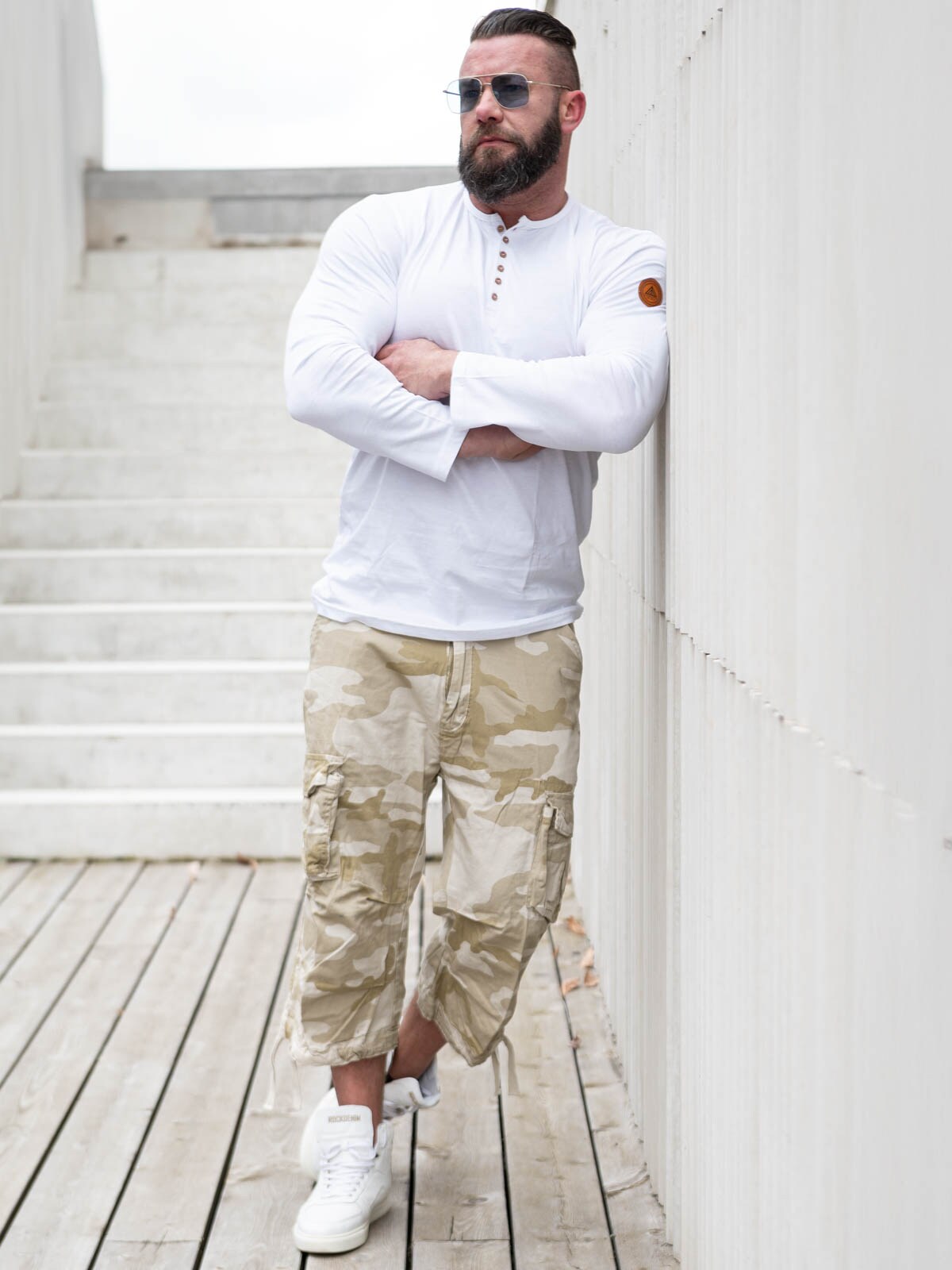 Bukse i 3/4-dels lengde med baggy passform. To lommer foran, to baklommer med trykknapper, samt to store lommer på sidene med trykknapper, i tillegg til en mindre åpen lomme. Snorer som kan strammes nederst på beina.