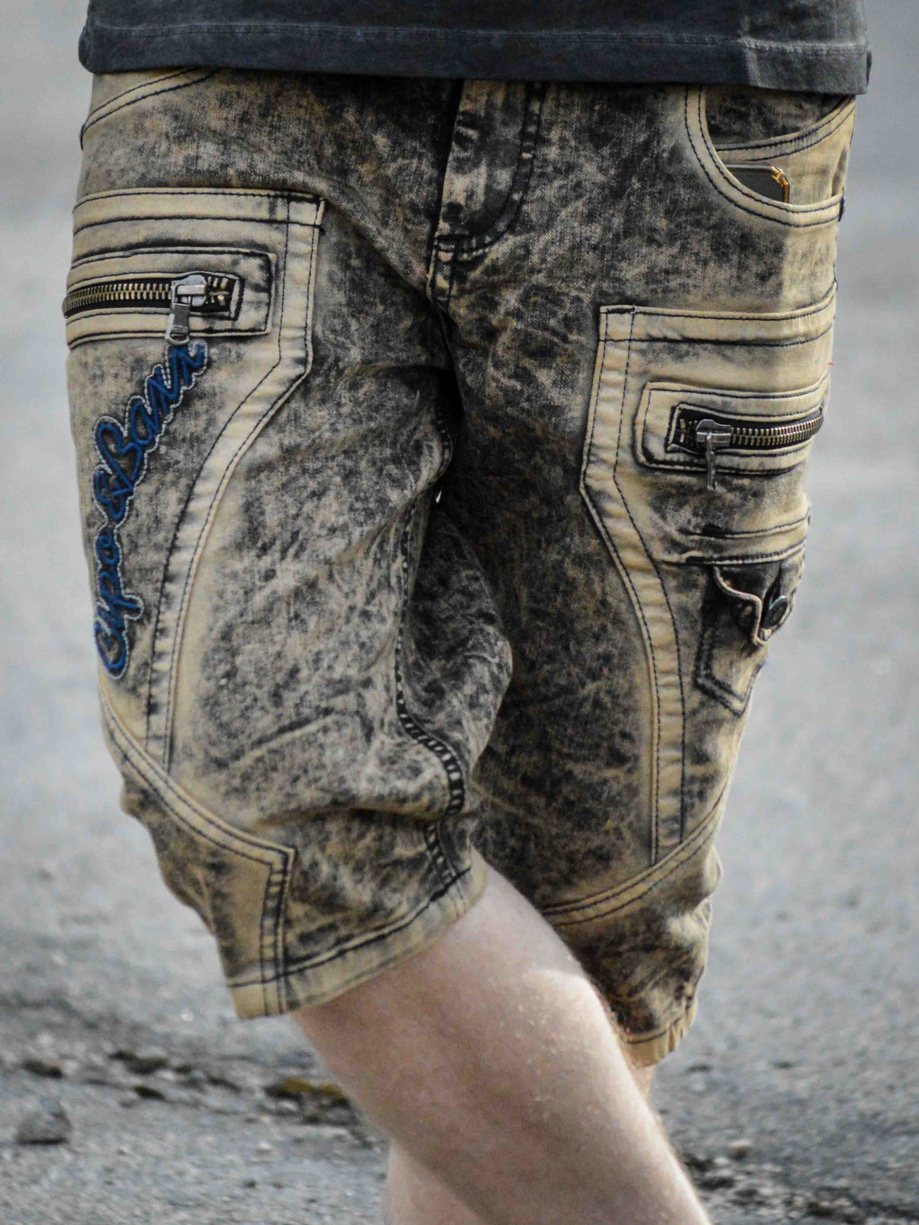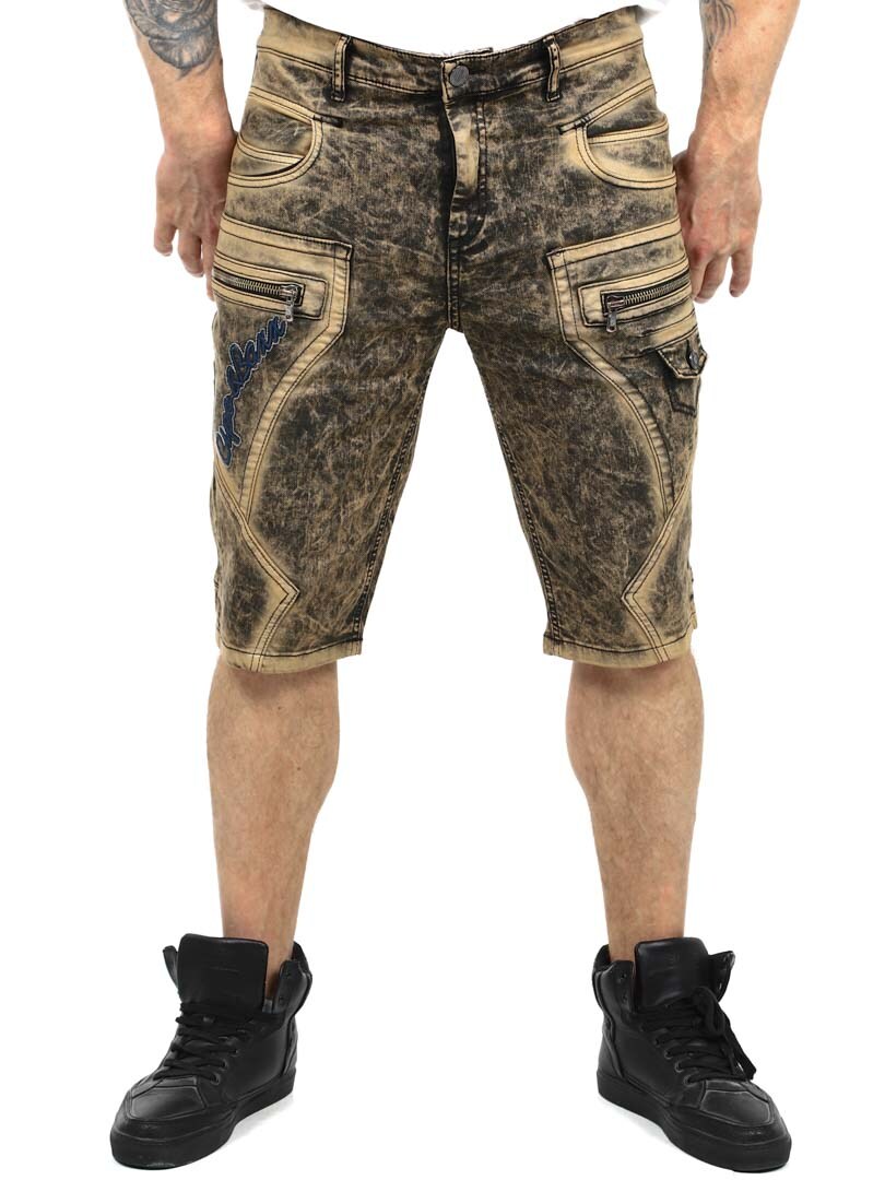 Gi streetwear-stilen din en oppgradering med disse unike shortsene. Laget av slitesterk denim med en kraftig vasket finish for en tøff look. De har flere funksjonelle lommer, brodert logo og grove sømmer for ekstra kant. Glidelåsene foran er kun til pynt og ikke funksjonelle.