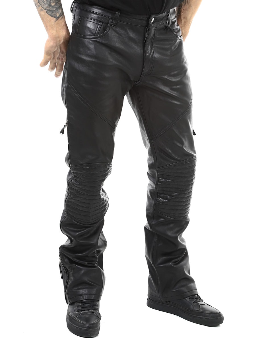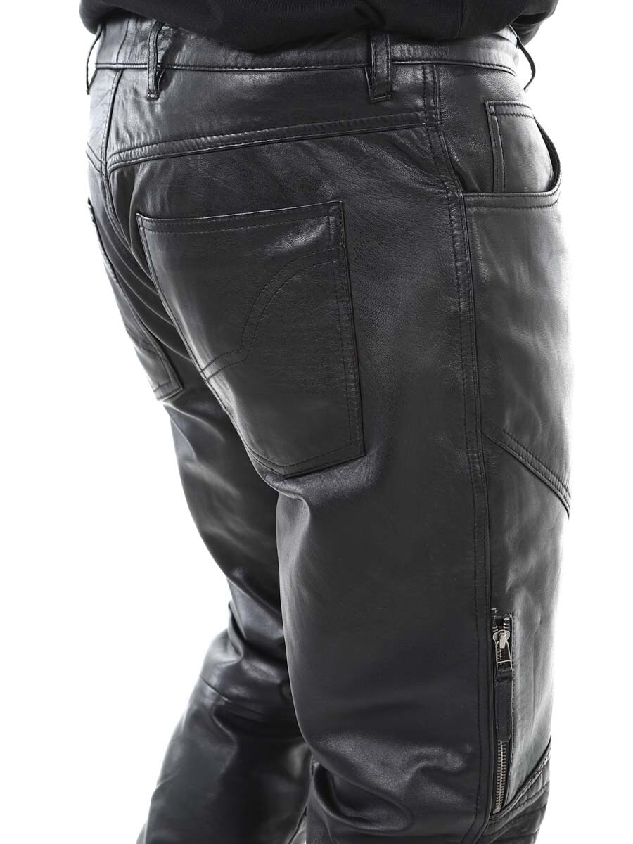Stilig bukse i ekte saueskinn som gir en myk og smidig følelse, samtidig som den er slitesterk og har lang holdbarhet. Buksen har fem klassiske lommer og glidelås i sømmen for å tilpasse passformen. Detaljerte glidelåser og polstrede knær. Designet for motorsykkelentusiaster og de som ønsker en edgy look!