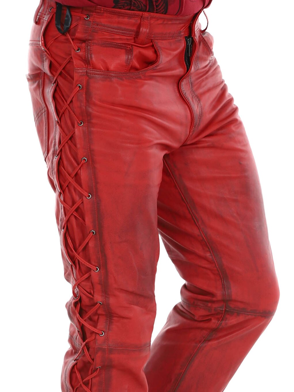 Bukser i ekte skinn med tynt fôr og lisser på sidene som regulerer vidden. De har tre lommer foran, to lommer bak og splitt i midjen. Lukkes med glidelås og metallknapp.