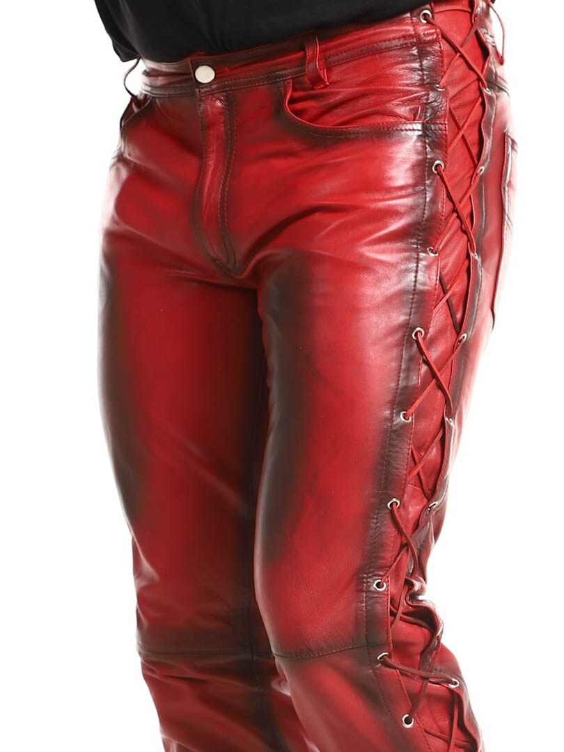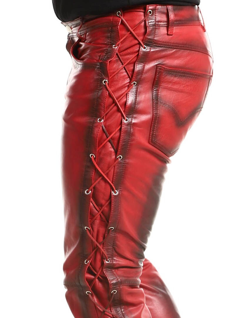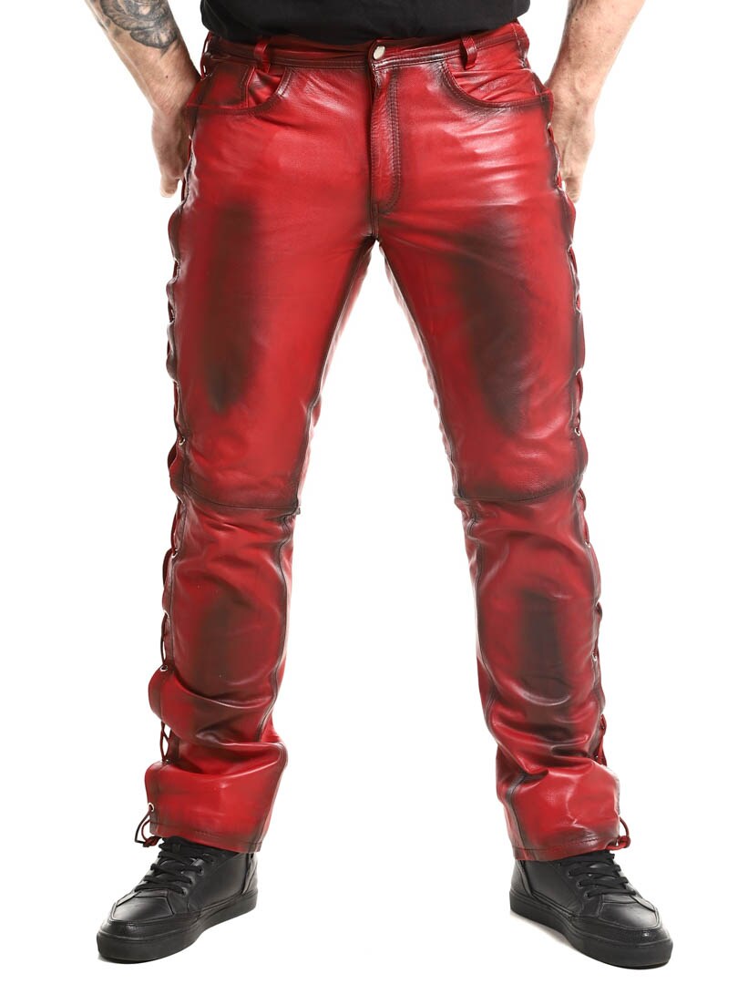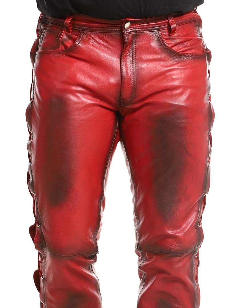 Bukser i ekte skinn med tynt fôr og lisser på sidene som regulerer vidden. De har tre lommer foran, to lommer bak og splitt i midjen. Lukkes med glidelås og metallknapp.
