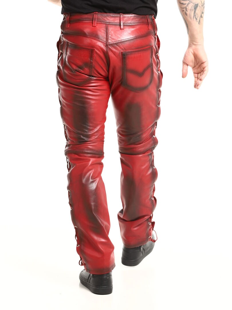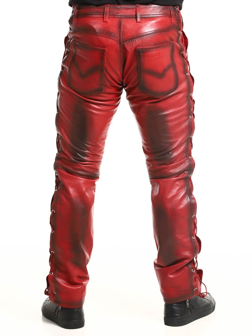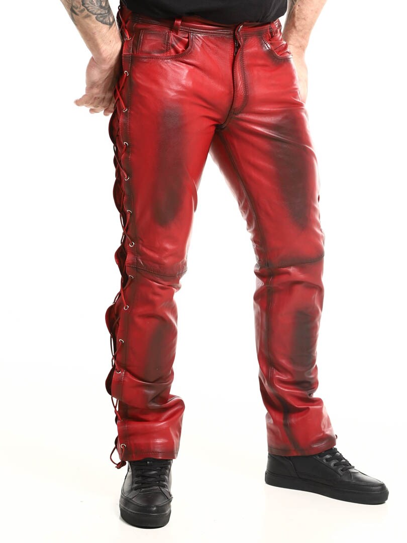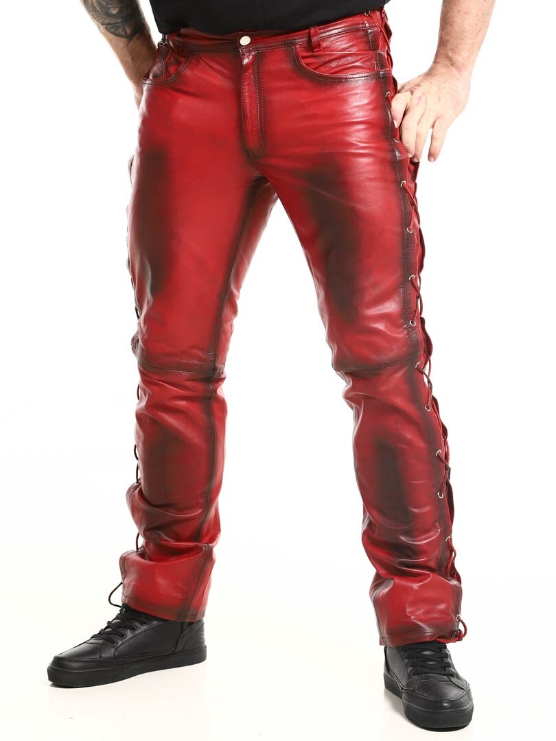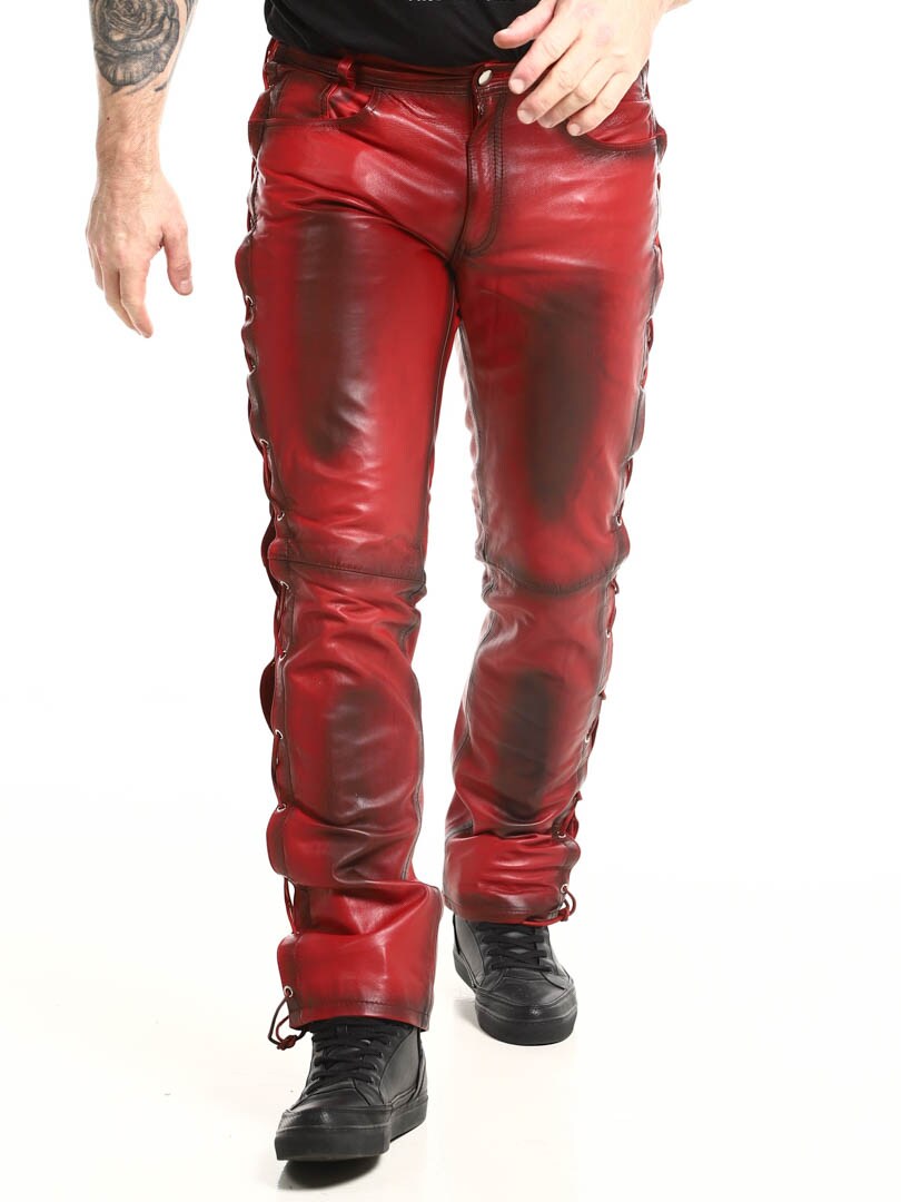 Bukser i ekte skinn med tynt fôr og lisser på sidene som regulerer vidden. De har tre lommer foran, to lommer bak og splitt i midjen. Lukkes med glidelås og metallknapp.