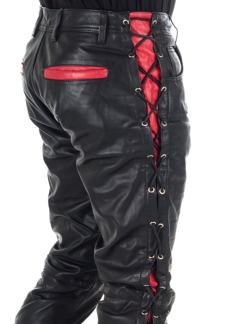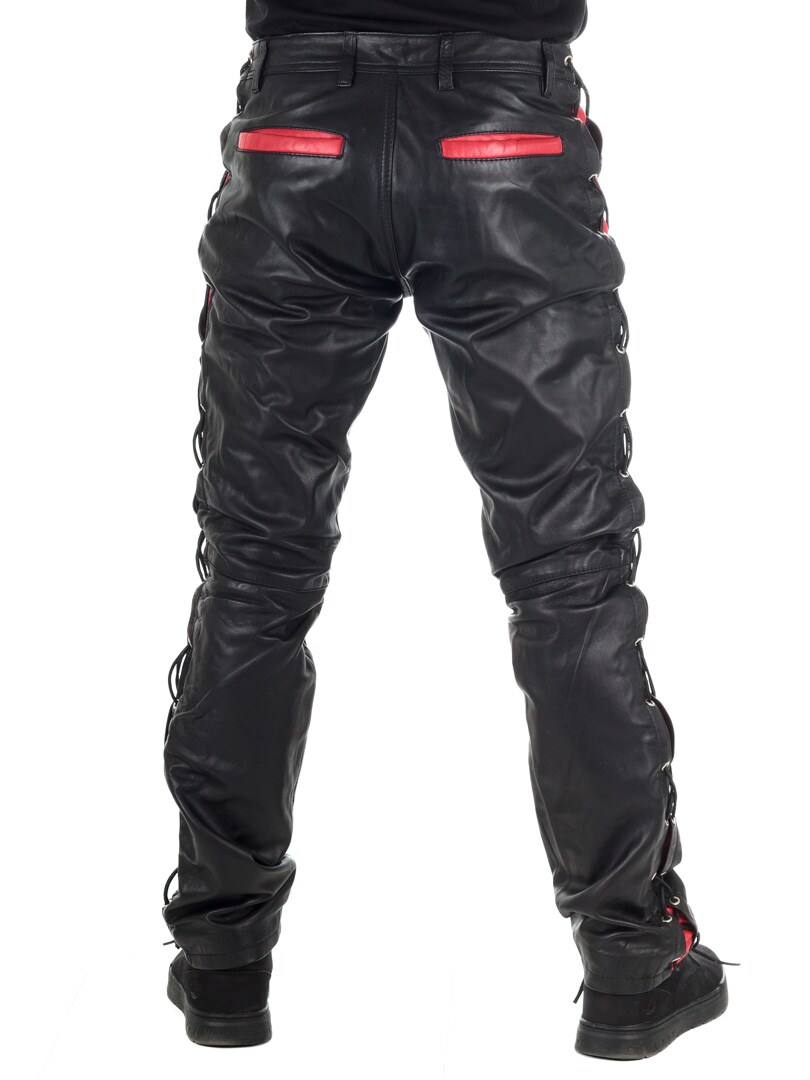 Bukser i ekte skinn med tynt fôr og lisser på sidene som regulerer vidden. De har tre lommer foran, to lommer bak og splitt i midjen. Lukkes med glidelås og metallknapp.