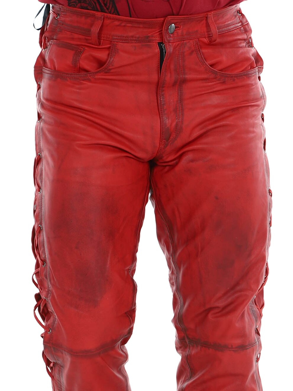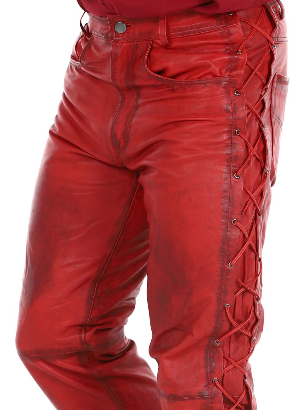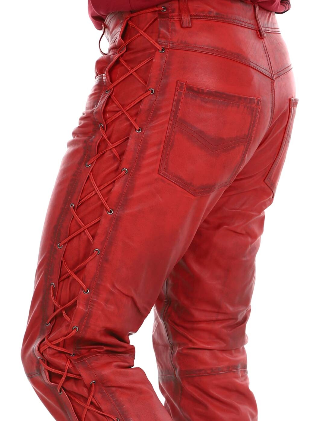Bukser i ekte skinn med tynt fôr og lisser på sidene som regulerer vidden. De har tre lommer foran, to lommer bak og splitt i midjen. Lukkes med glidelås og metallknapp.