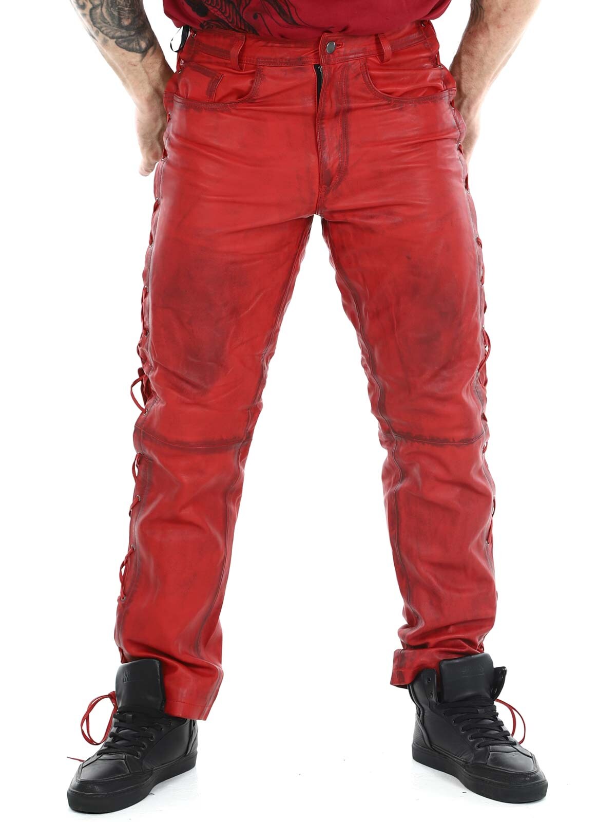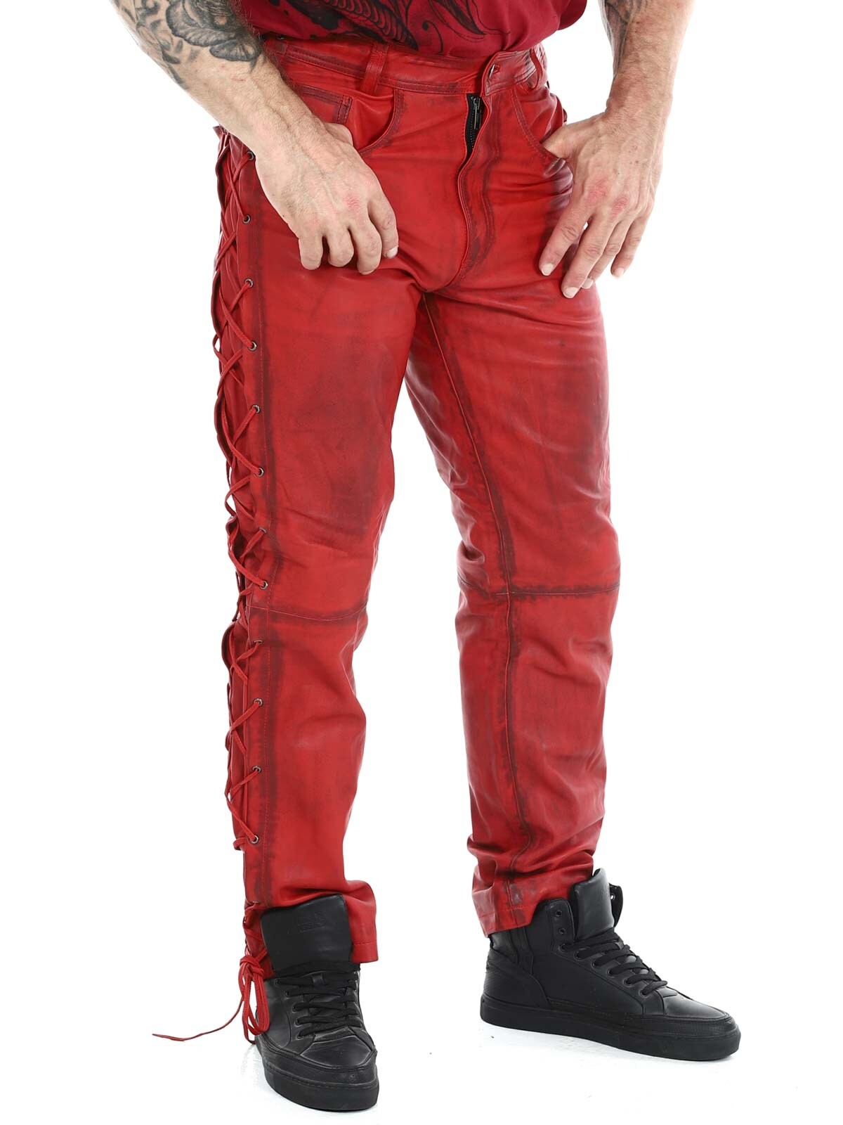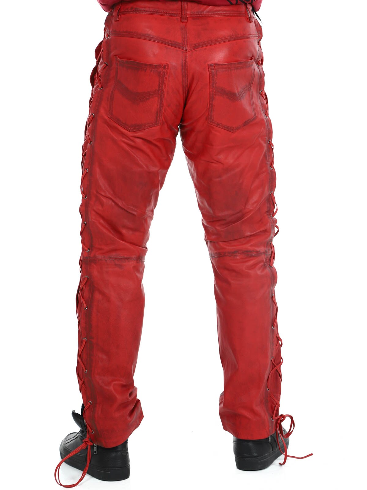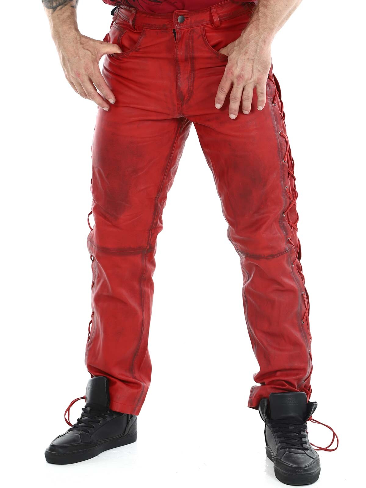 Bukser i ekte skinn med tynt fôr og lisser på sidene som regulerer vidden. De har tre lommer foran, to lommer bak og splitt i midjen. Lukkes med glidelås og metallknapp.
