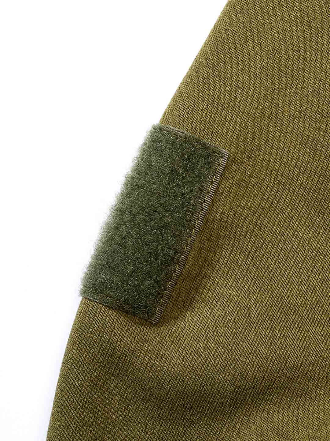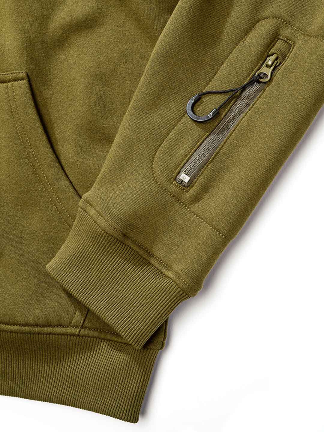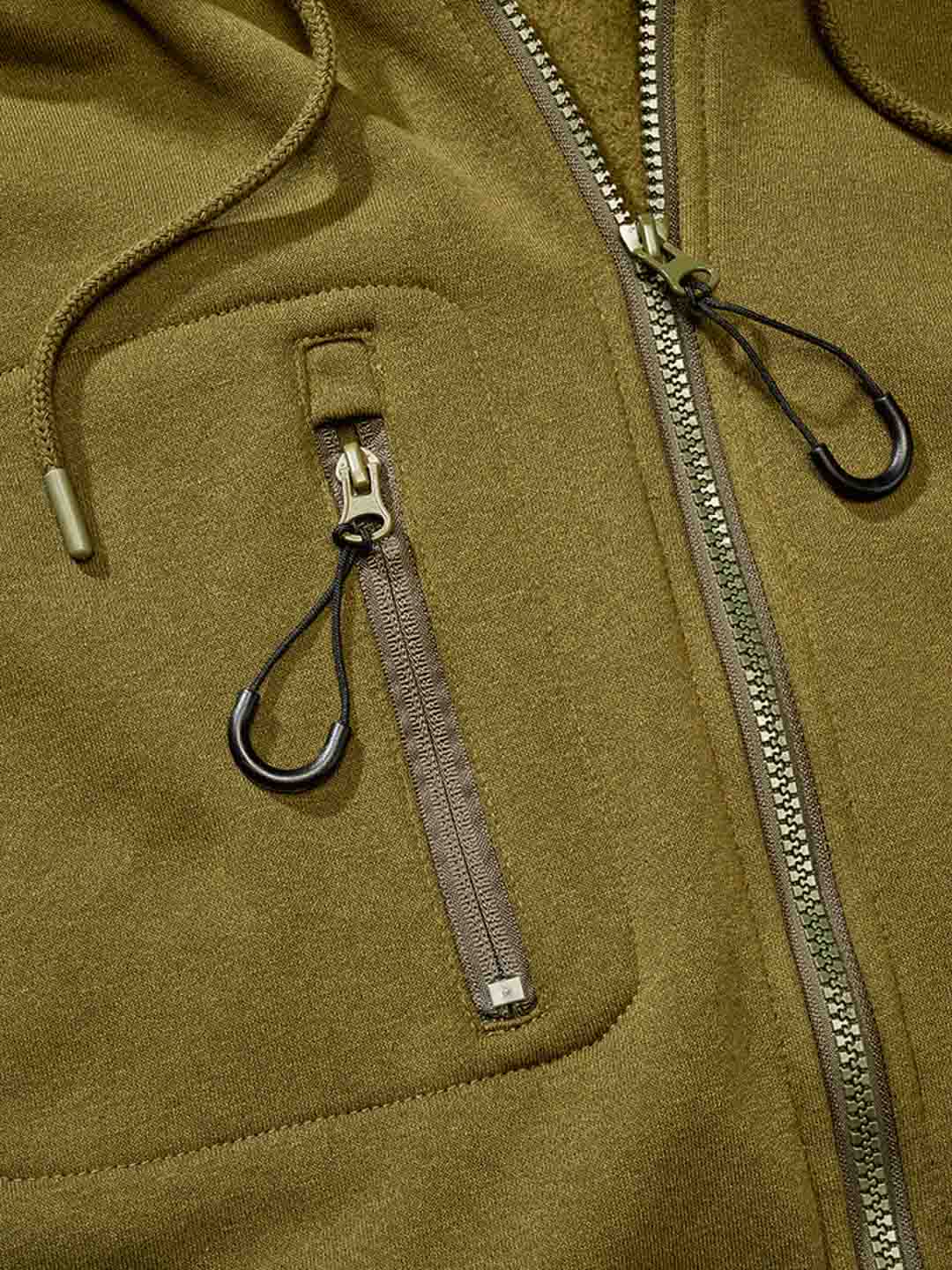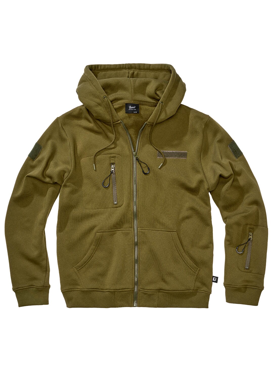 Praktisk hettegenser i en mørkere grønn farge. Genseren har glidelås foran og en justerbar hette med snøring. Den er utstyrt med en brystlomme, en lomme på armen samt to lommer foran. Ribbestrikkede mansjetter ved ermene og nederkanten gir en behagelig passform, mens den børstede innsiden gjør genseren myk og varm å bruke.