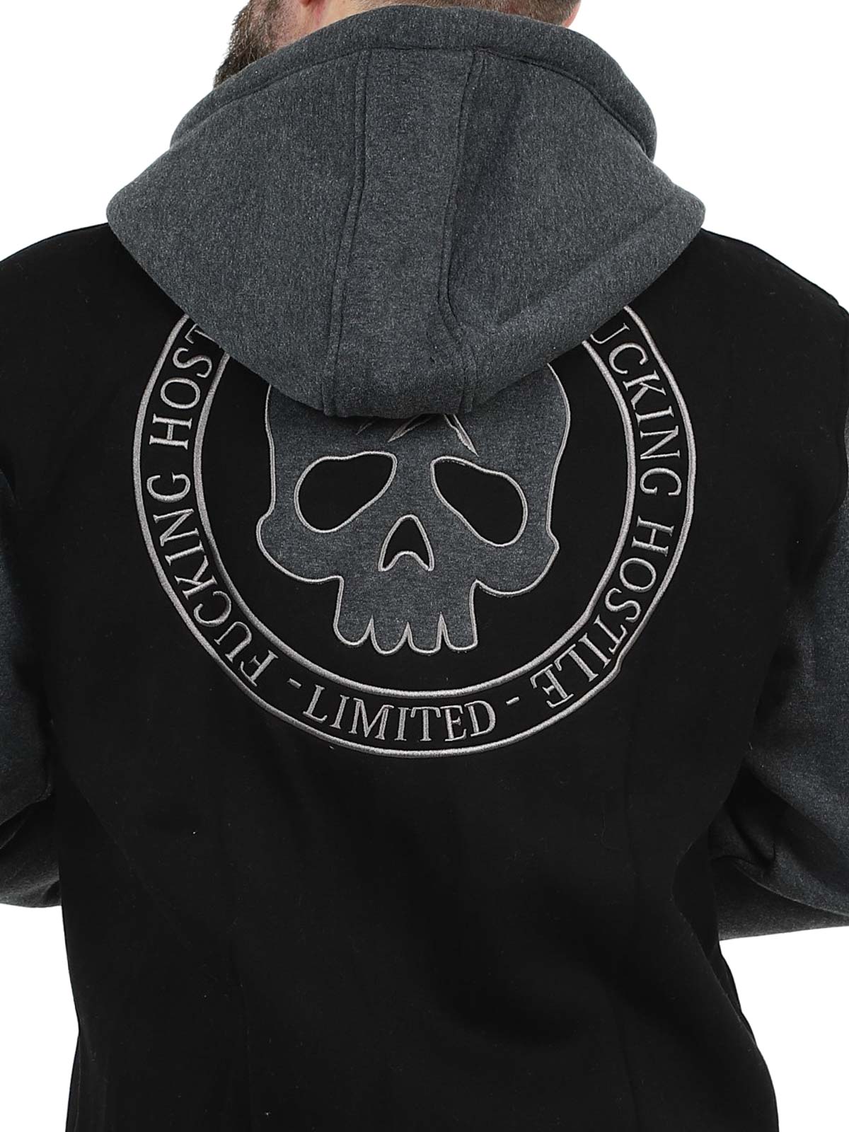 Svart genser med mørkegrå hette og ermer. Designet med brodert trykk på brystet, ryggen og ermene. Den har børstet innside, to lommer med glidelås og ribbestrikkede mansjetter i ermeavslutning og nederkant.