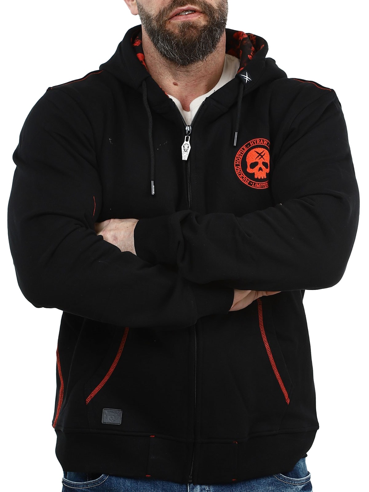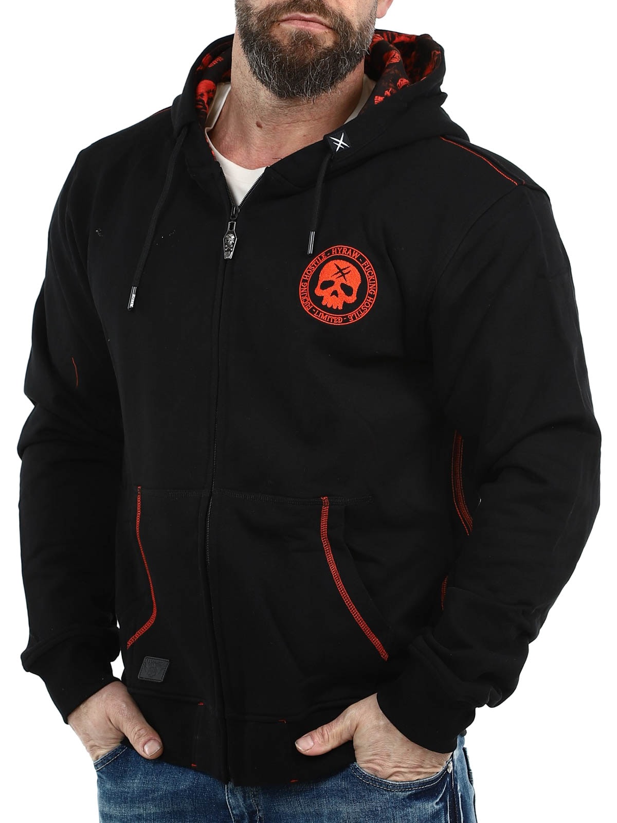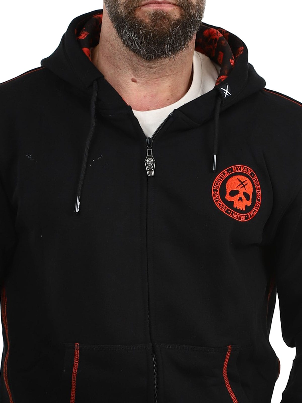 Tøff hettegenser designet med et stort rødt brodert trykk på ryggen samt et mindre trykk på brystet. Den har hette med snøring og to åpne lommer på magen. Hettegenseren har også et unikt motiv trykket på innsiden av hetten som virkelig skiller seg ut når hetten brukes og gir plagget en ekstra kul detalj.