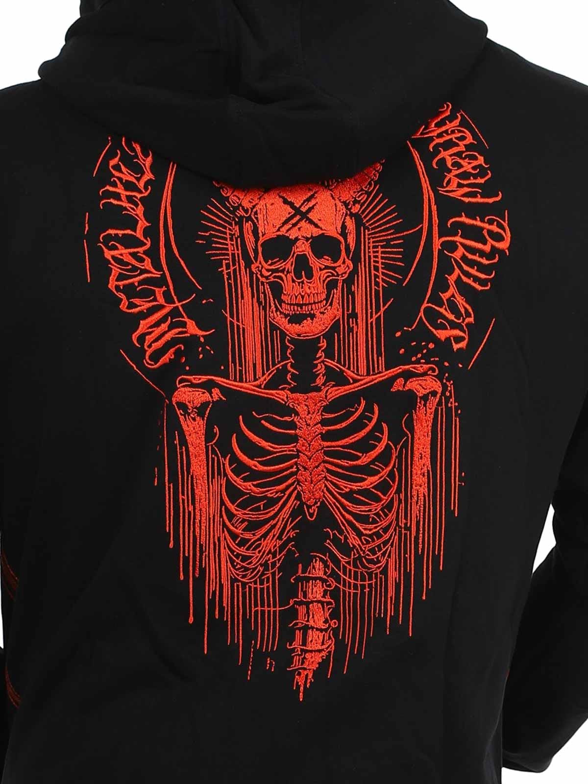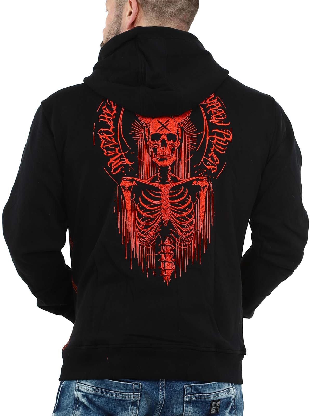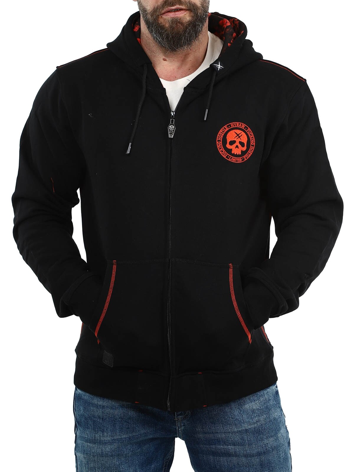Tøff hettegenser designet med et stort rødt brodert trykk på ryggen samt et mindre trykk på brystet. Den har hette med snøring og to åpne lommer på magen. Hettegenseren har også et unikt motiv trykket på innsiden av hetten som virkelig skiller seg ut når hetten brukes og gir plagget en ekstra kul detalj.