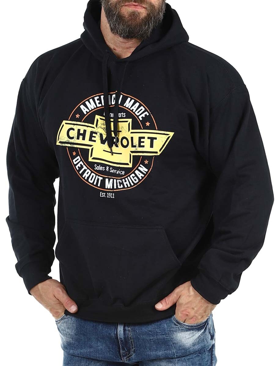 Svart hettegenser med stort Chevrolet-trykk på forsiden. Den har ribbestrikkede mansjetter, hette med snøring og kengurulomme. Myk og behagelig genser med børstet innside. Perfekt for bilentusiaster som ønsker å vise sin passion for amerikansk bilkultur!