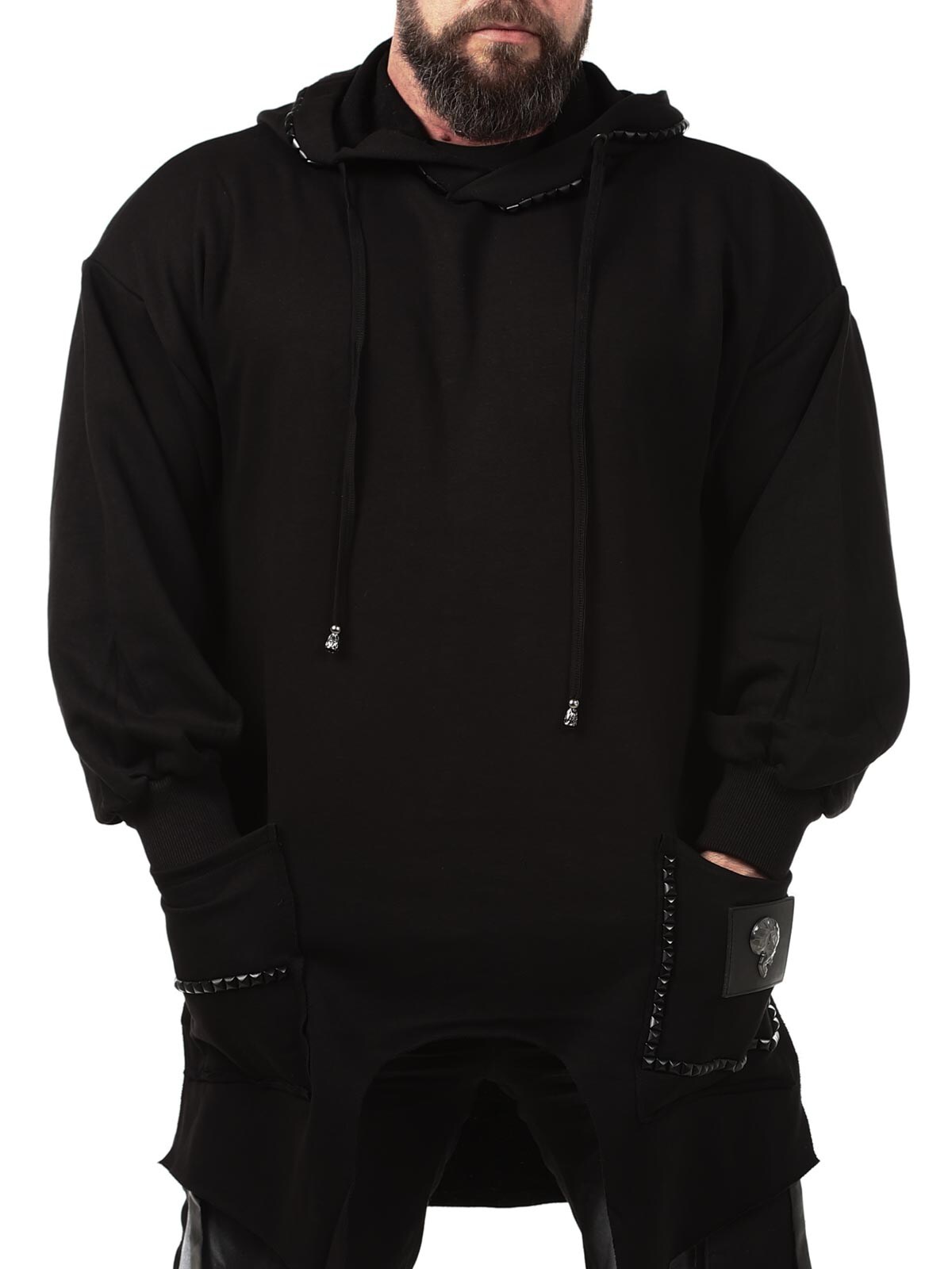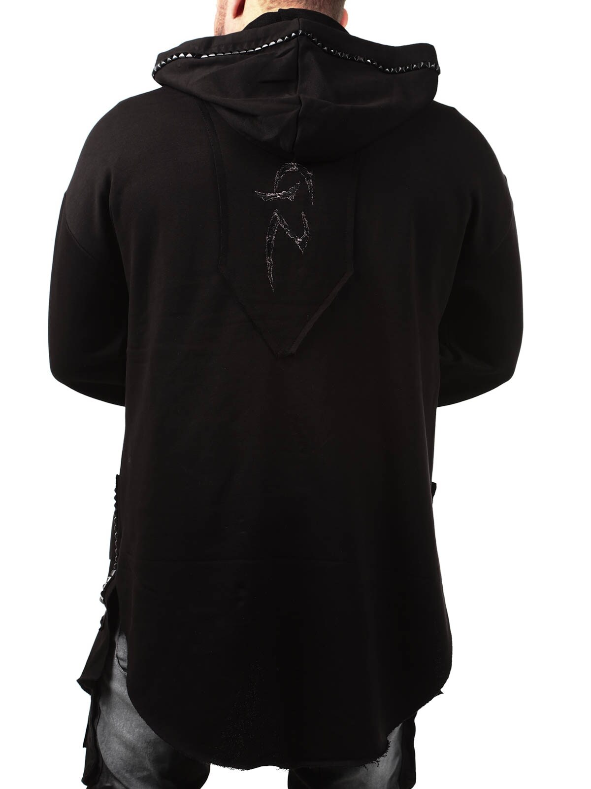 Hettegenser i lengre modell med utskjæring nederst. Detaljert med svarte nagler, lapp og skreddersydd logo bak. Den har hette med snøring og to åpne frontlommer.