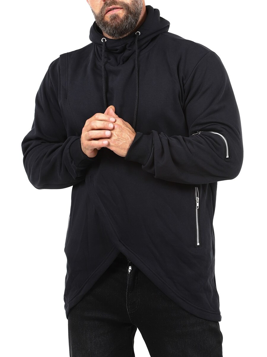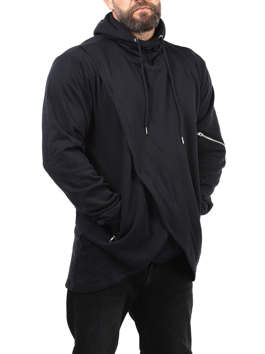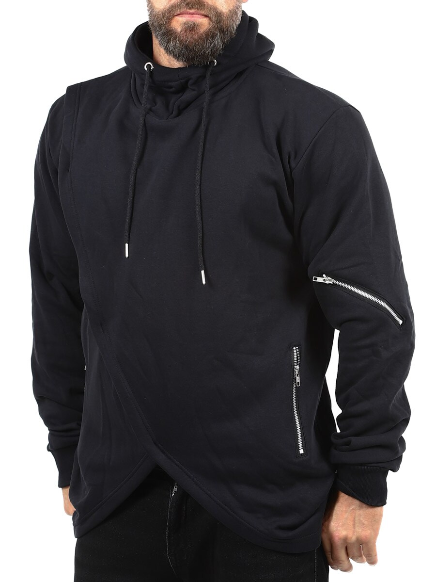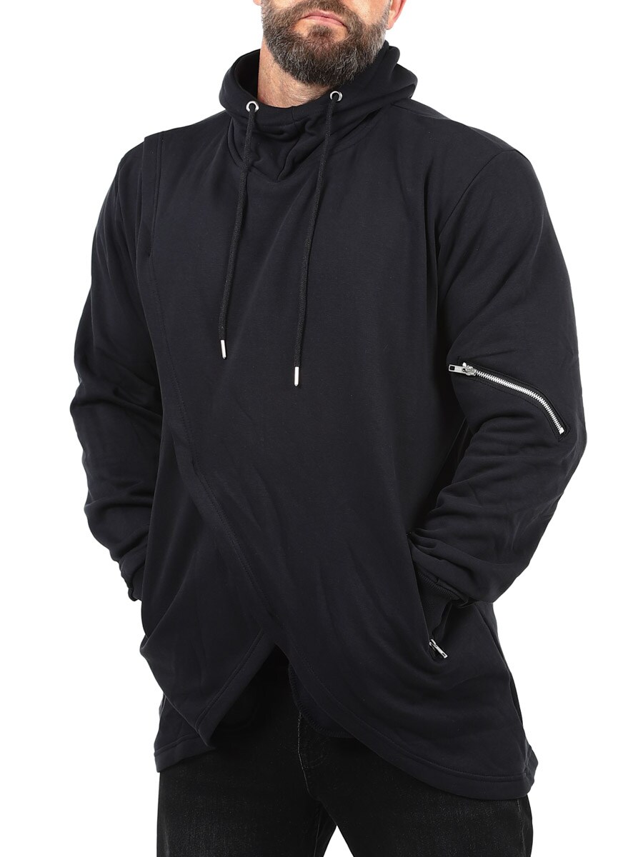 Hettegenser i en lengre modell med utskjæring nederst. Designet med dekorative glidelåser på ermene, hette med snøring og ribbestrikkede mansjetter. Den har to lommer foran som kan lukkes og børstet innside. Denne genseren finner du bare hos Rockdenim!