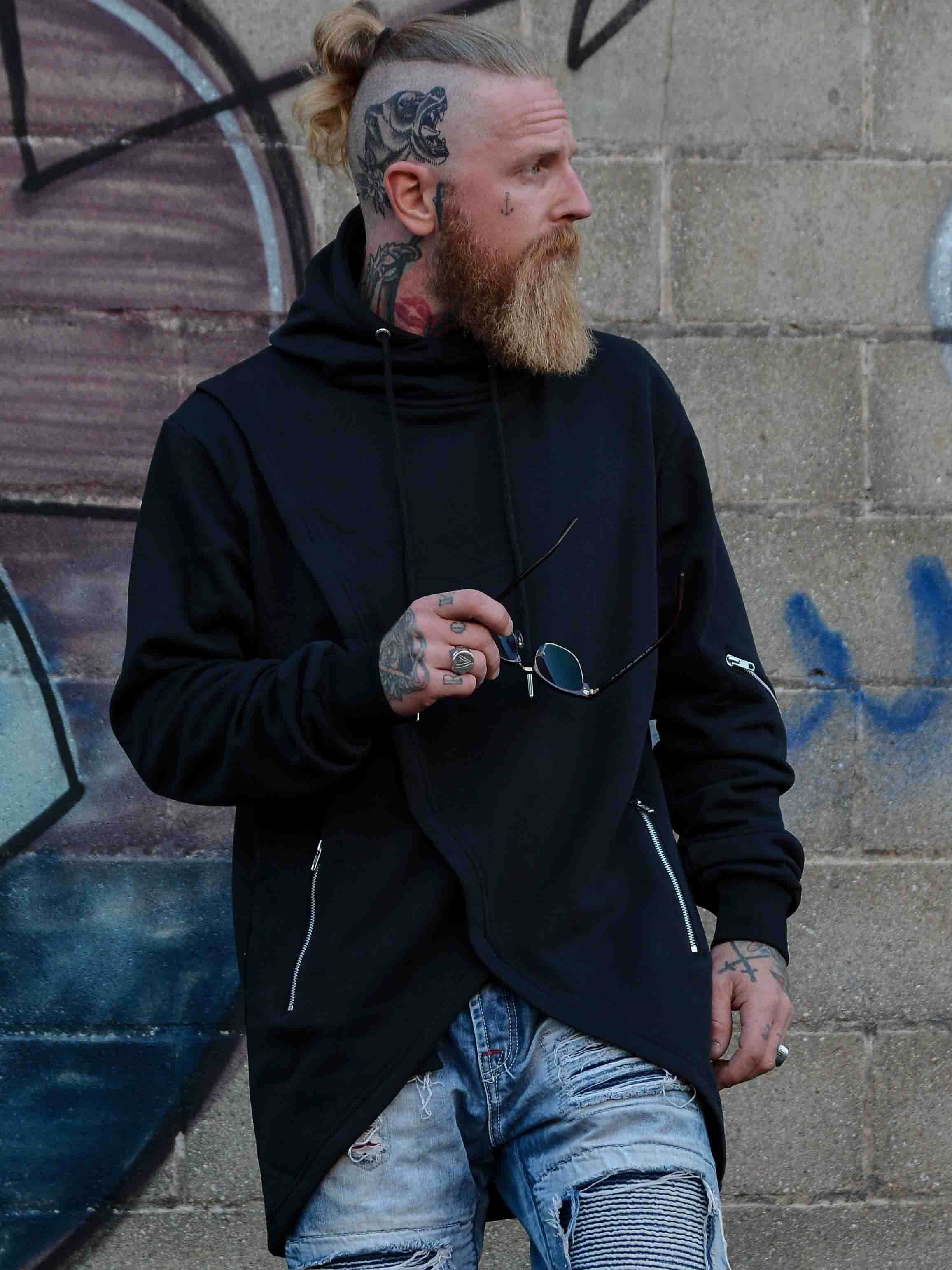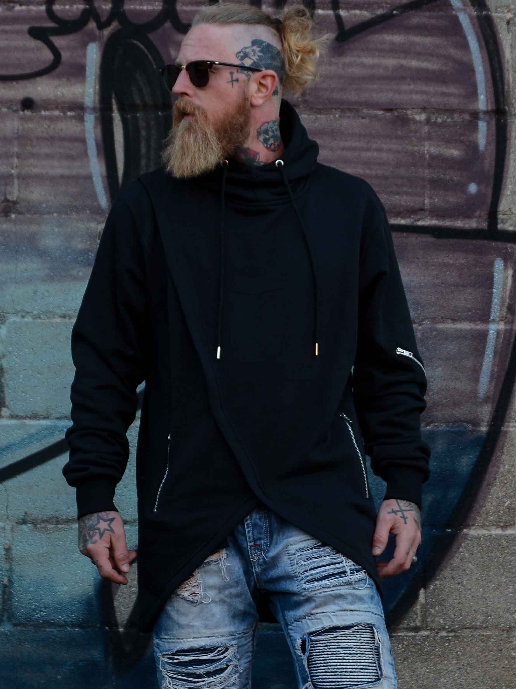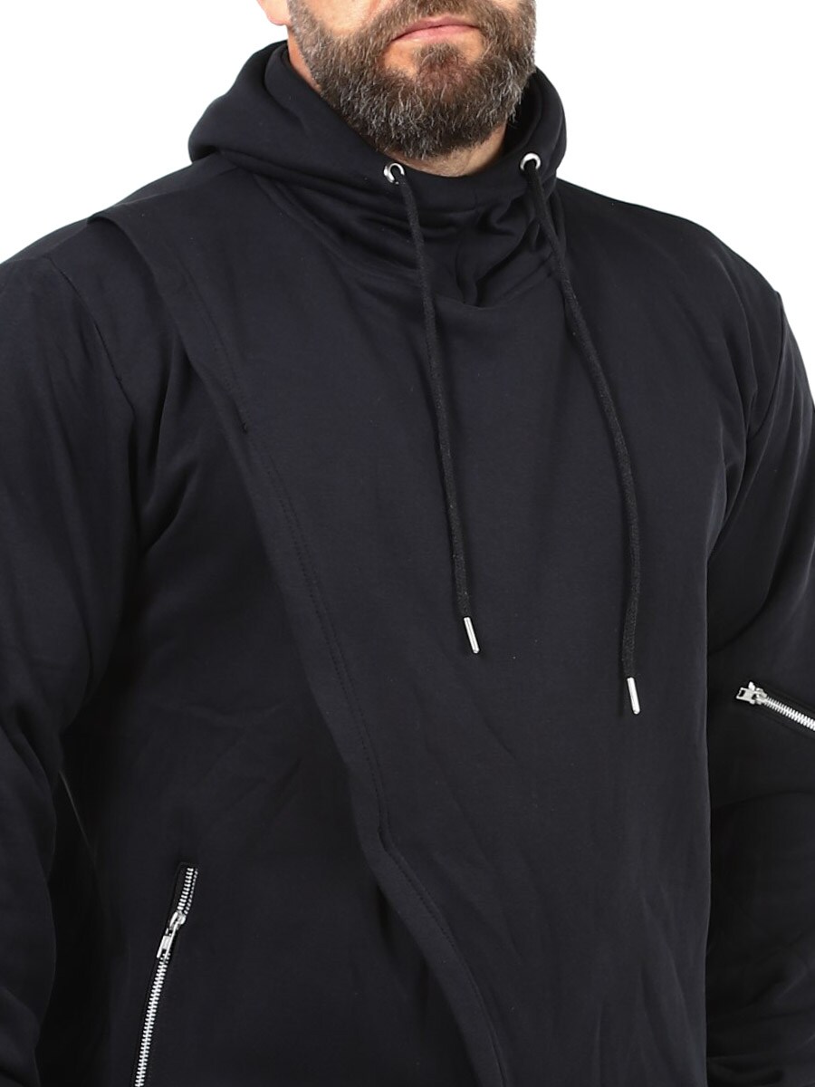 Hettegenser i en lengre modell med utskjæring nederst. Designet med dekorative glidelåser på ermene, hette med snøring og ribbestrikkede mansjetter. Den har to lommer foran som kan lukkes og børstet innside. Denne genseren finner du bare hos Rockdenim!