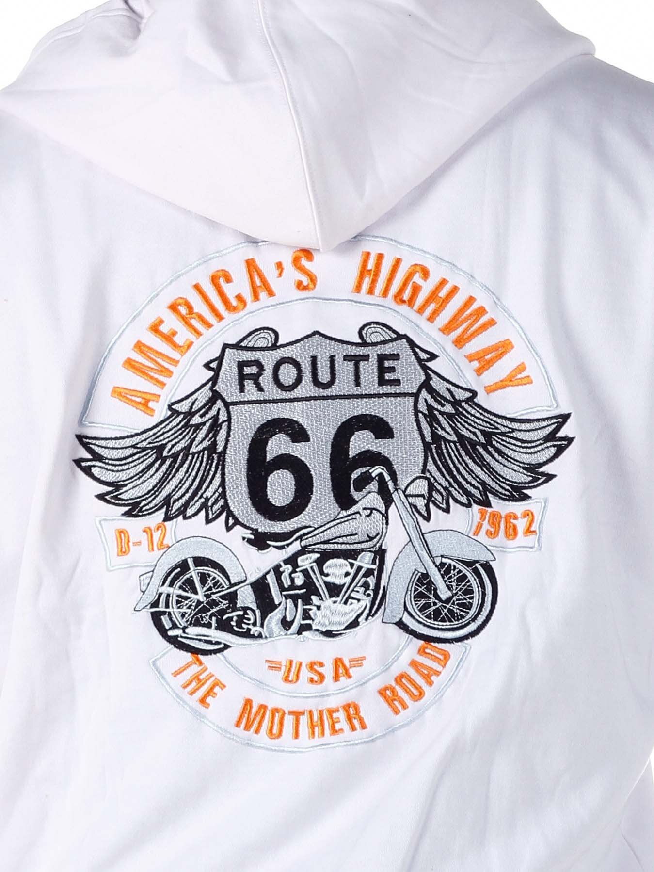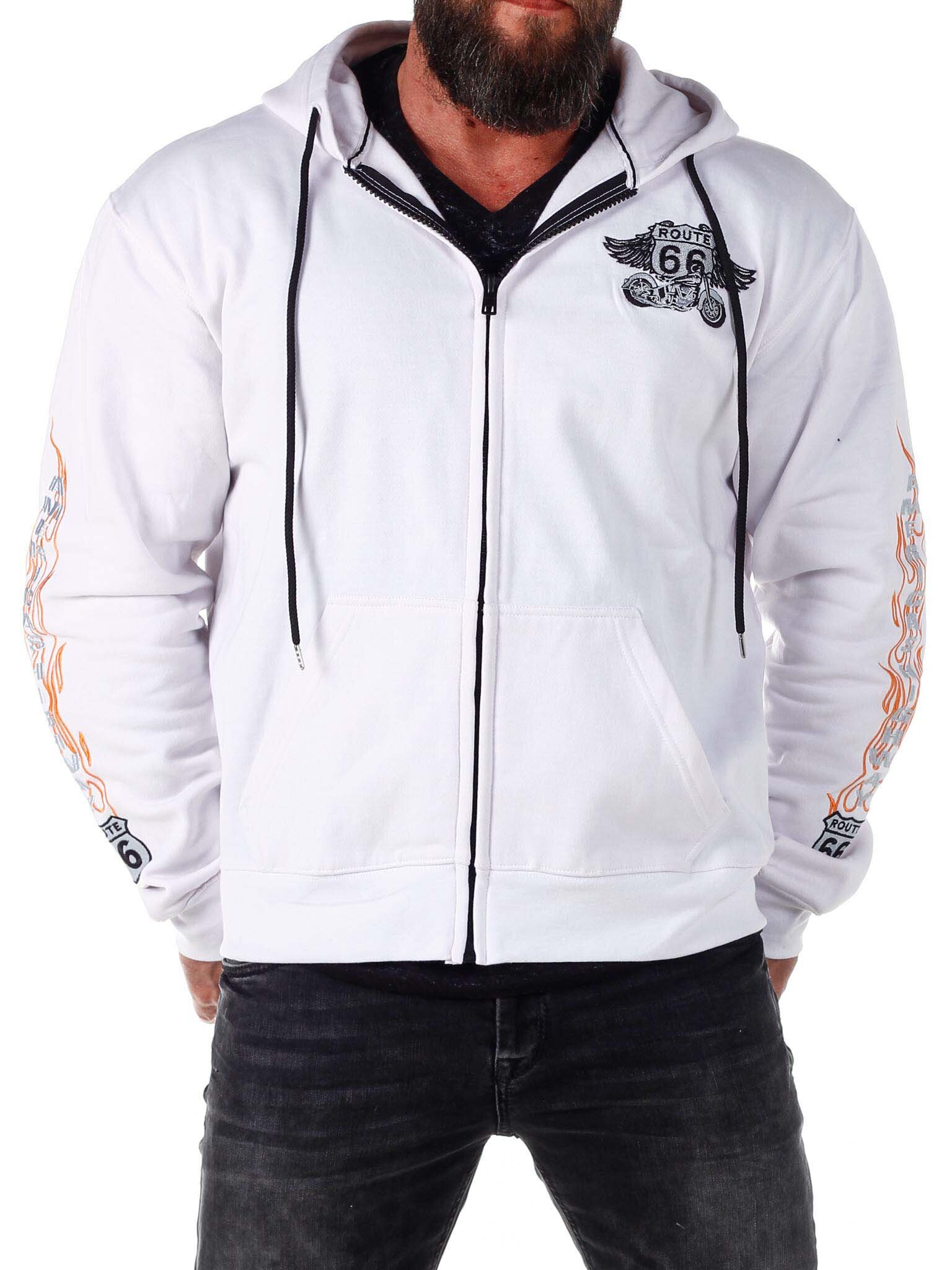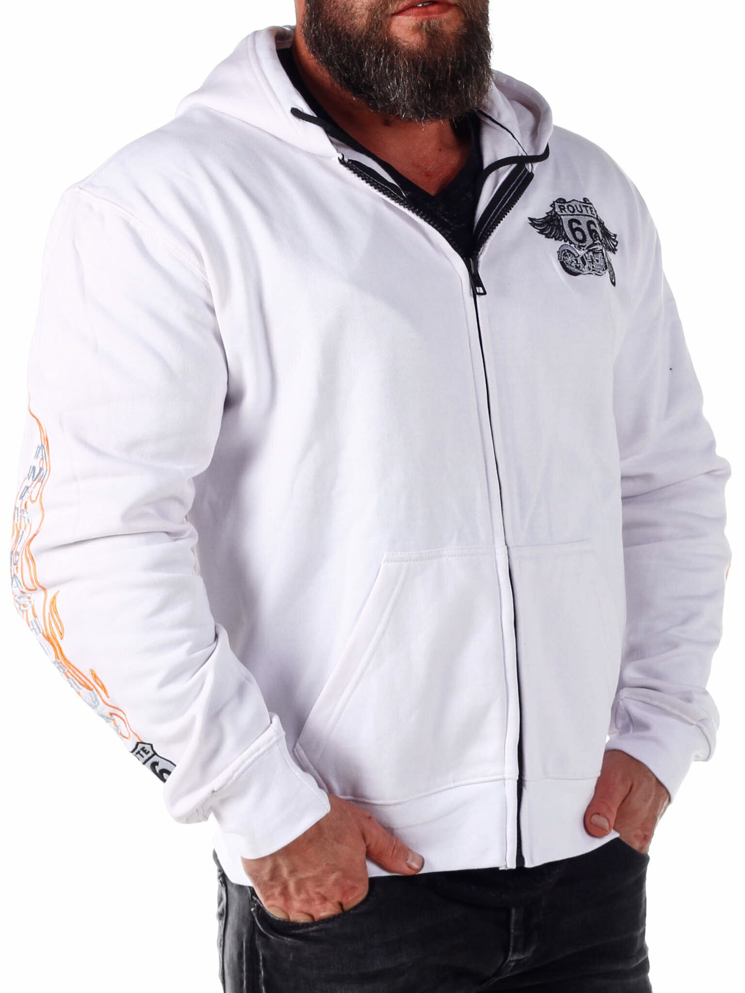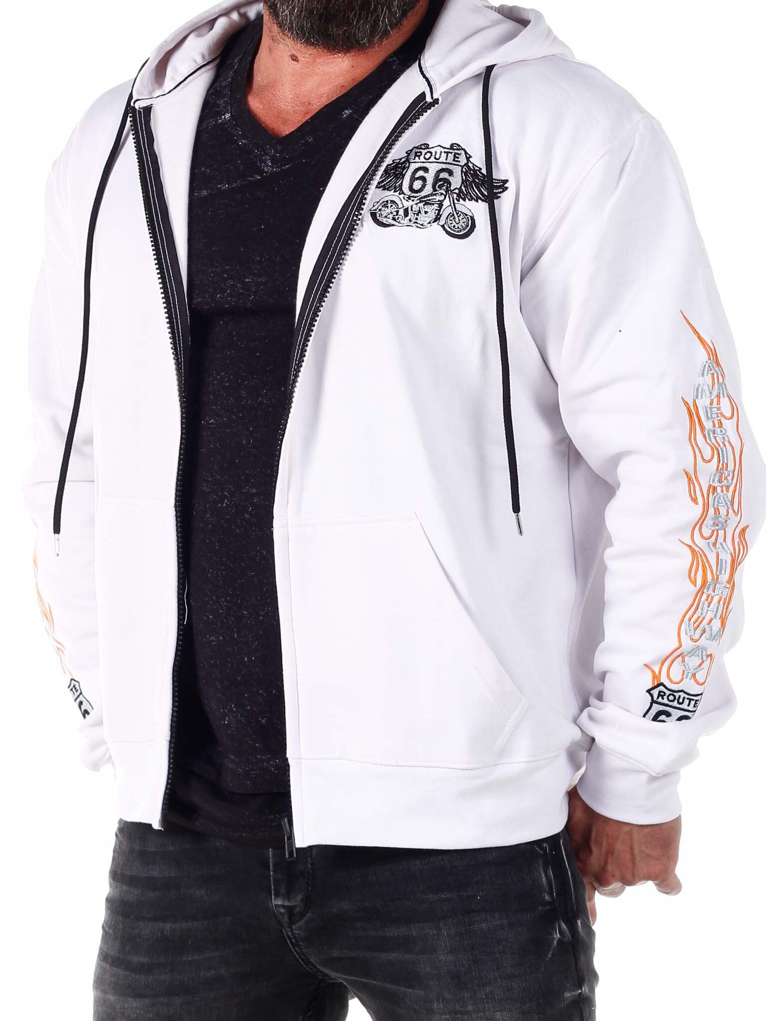 Hettegenser med glidelås og lommer på magen. Romslig og komfortabel modell med skreddersydd design i hvitt, sort og oransje. Bred mansjett nederst og ved mansjettene.