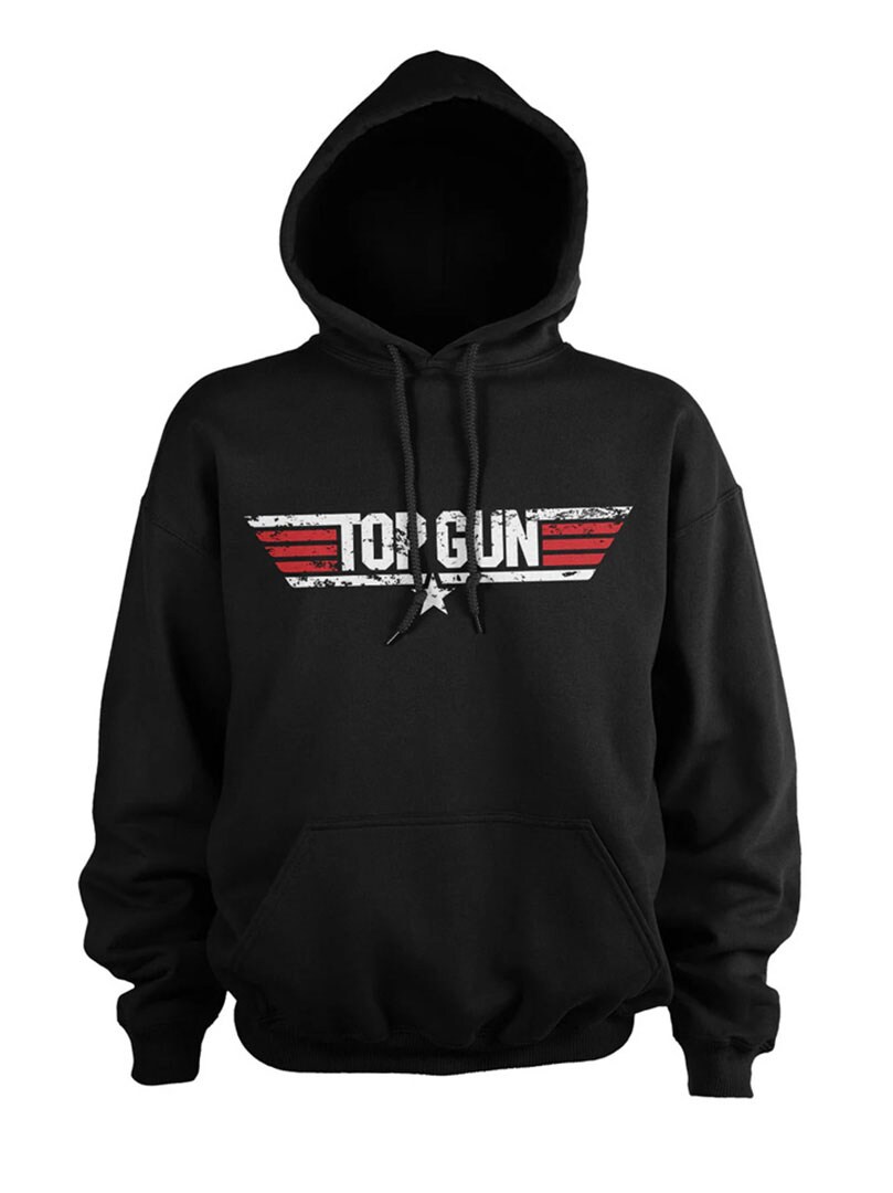 Denne svarte hettegenseren med Top Gun-motiv er et must for alle fans av klassisk actionfilm og ikonisk 80-tallsstil. Den har hette med snøring, kengurulomme og ribbestrikkede kanter.