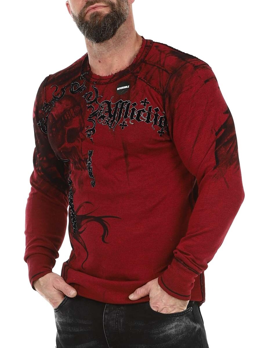 En unik langermet trøye i finstrikket materiale med to uttrykk i ett – vendbar design som lar deg velge stil etter humøret. Den ene siden har en dyp rød base med detaljerte hodeskaller, ornamenter og gotisk Affliction-logo. Den andre siden går i mørkere toner med et kraftfullt frontmotiv og matchende detaljer på ryggen. Rå sømmer og en vasket finish forsterker den ikoniske rockfølelsen. Perfekt for deg som vil ha maksimal variasjon uten å gå på kompromiss med attitude!