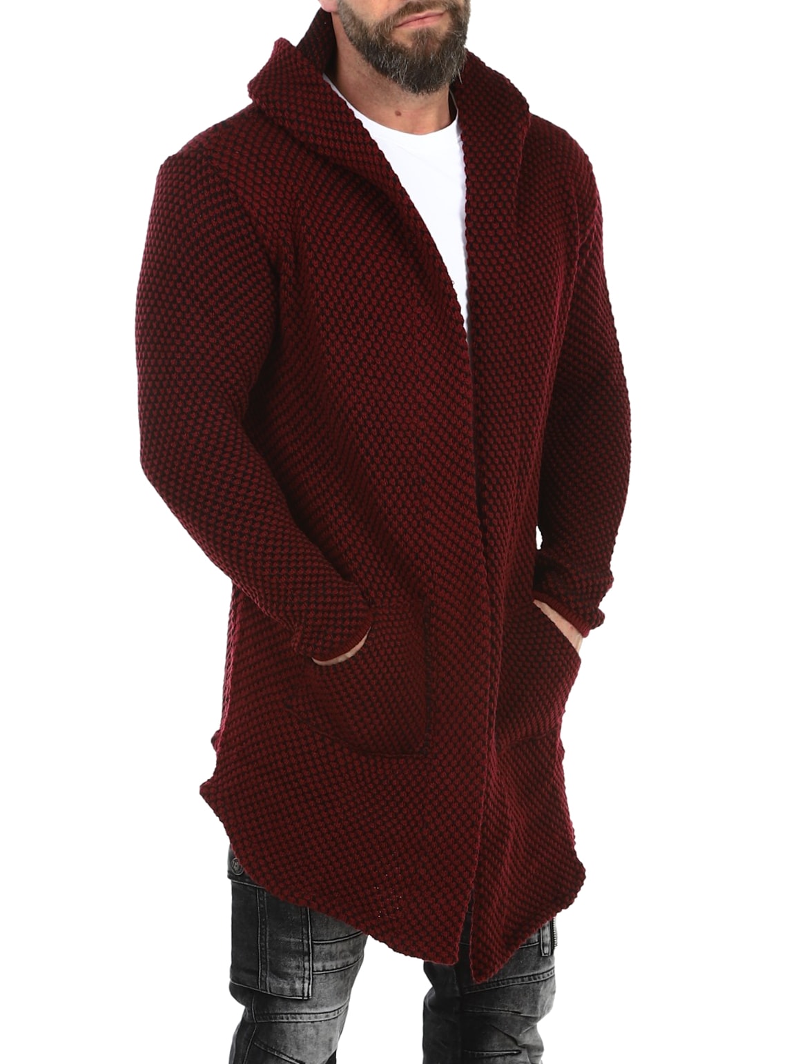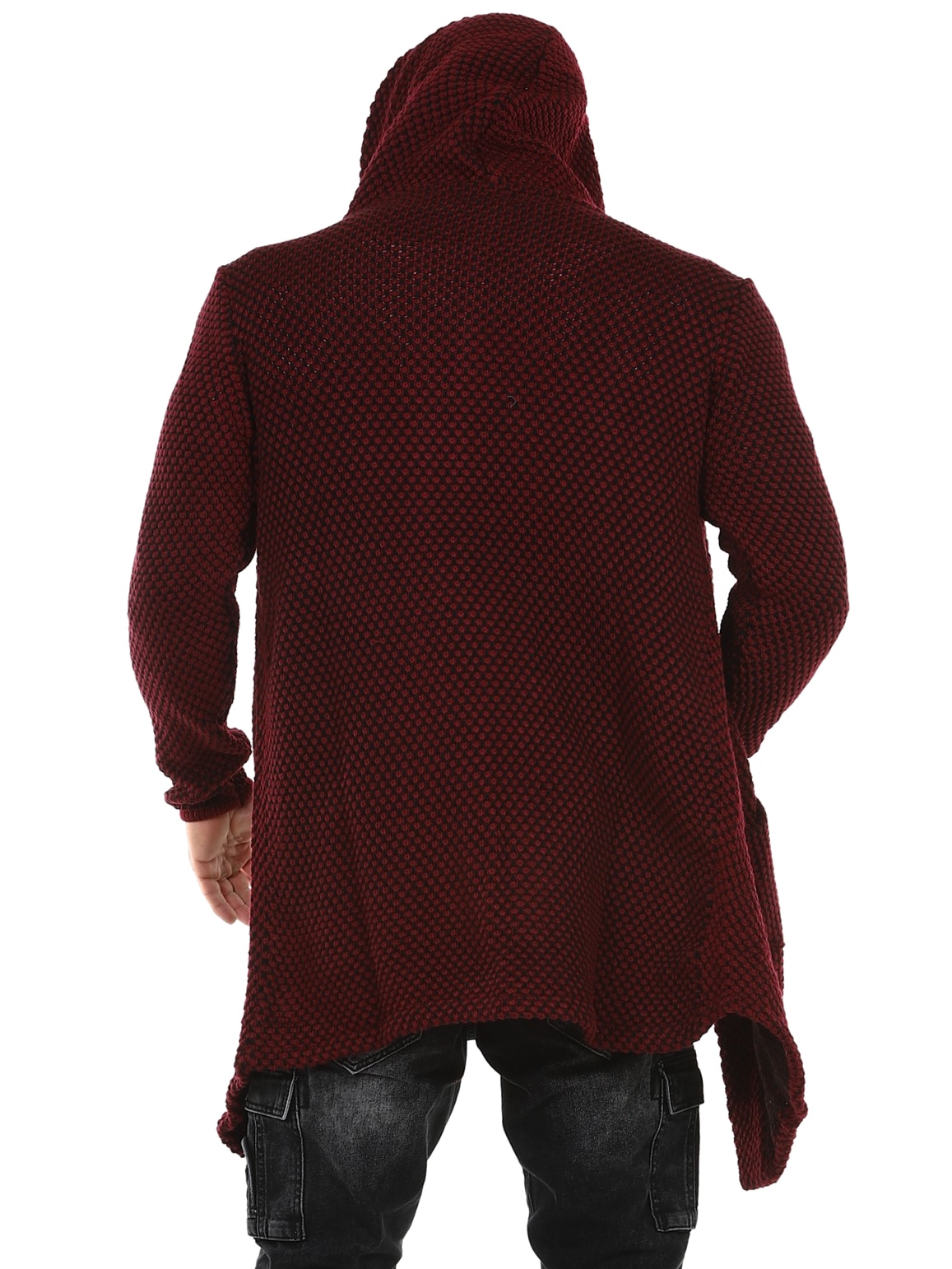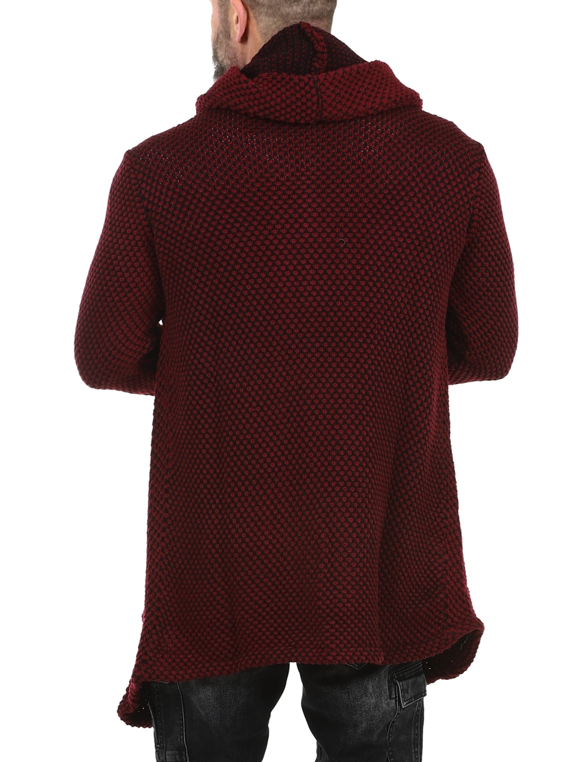 Grovstrikket jakke i svart og grått med pent mønster. Lang og stretchy modell med romslig hette. Laget i behagelig og varmt materiale.