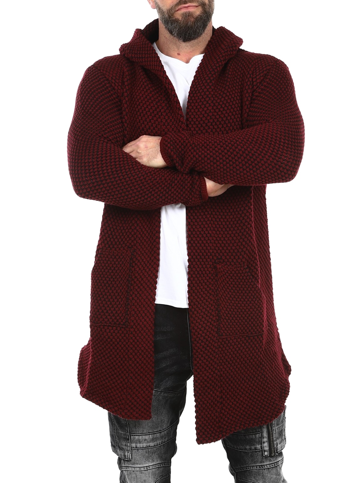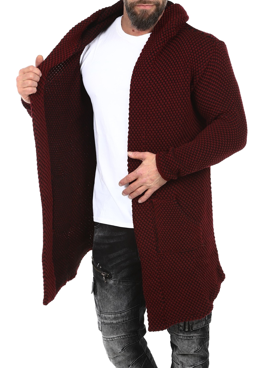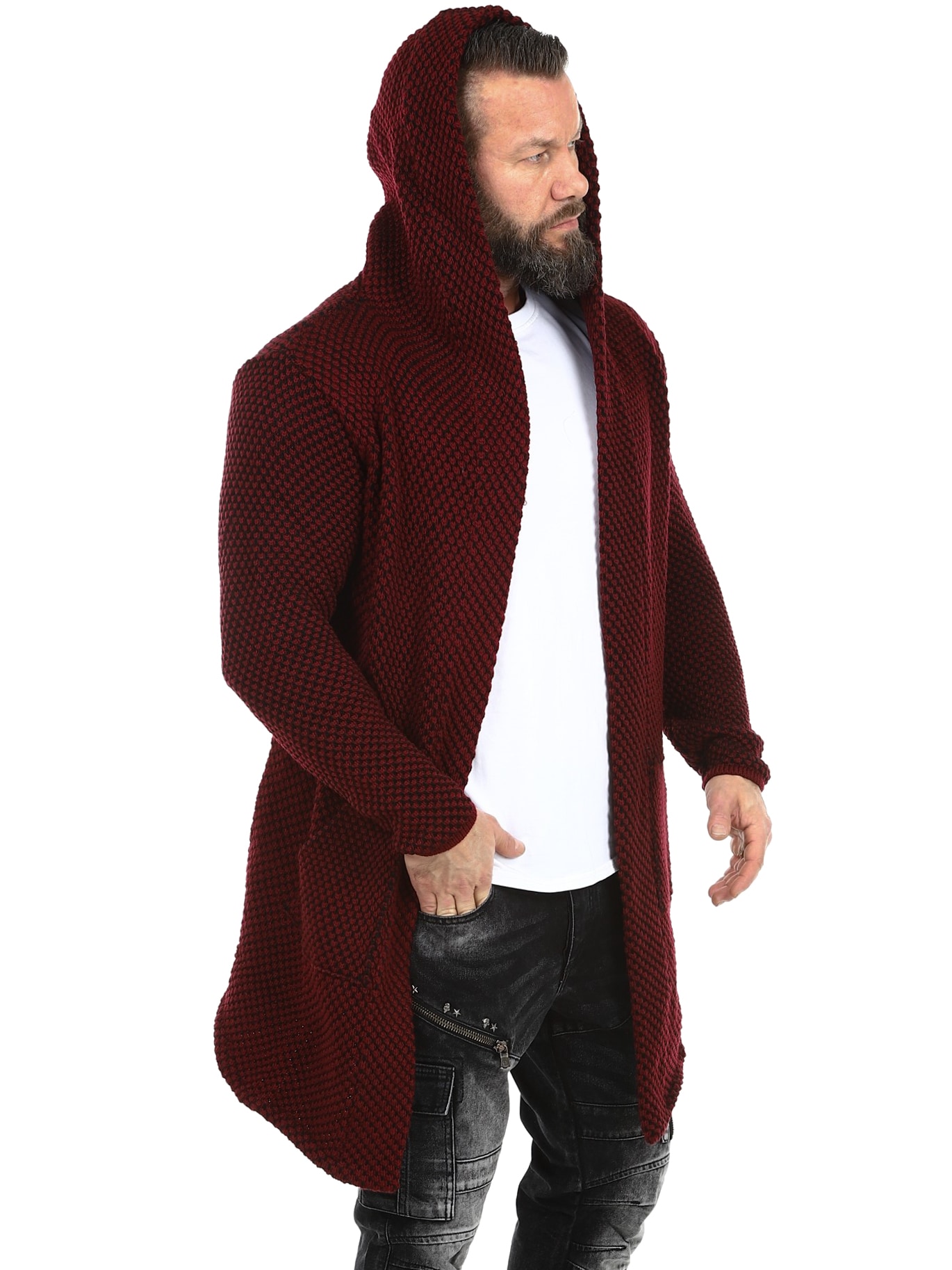 Grovstrikket jakke i svart og grått med pent mønster. Lang og stretchy modell med romslig hette. Laget i behagelig og varmt materiale.