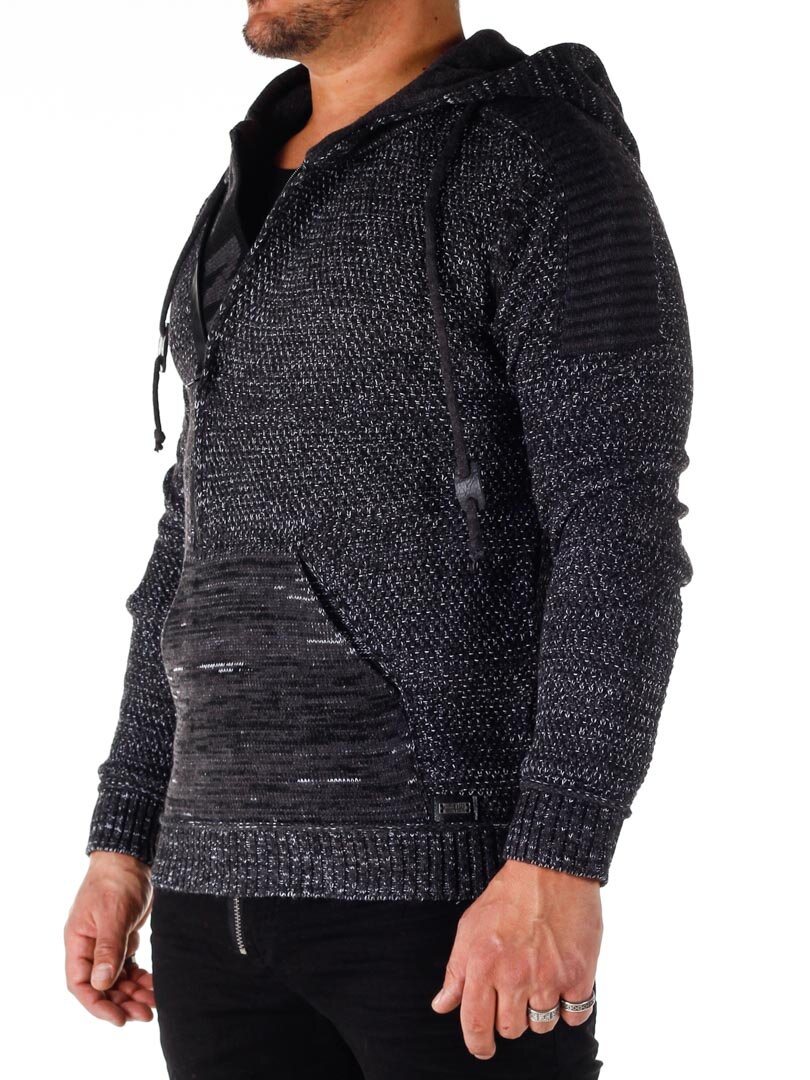 Hettegenser i strikket stretch med rips på sidene som gir et maskulint uttrykk. Unik glidelås foran som går ned over brystet og skjulte bokstaver i strikk som er synlige når glidelåsen er åpen. Tykk, komfortabel hette med snøring og hel lomme foran. Finnes i flere farger!
