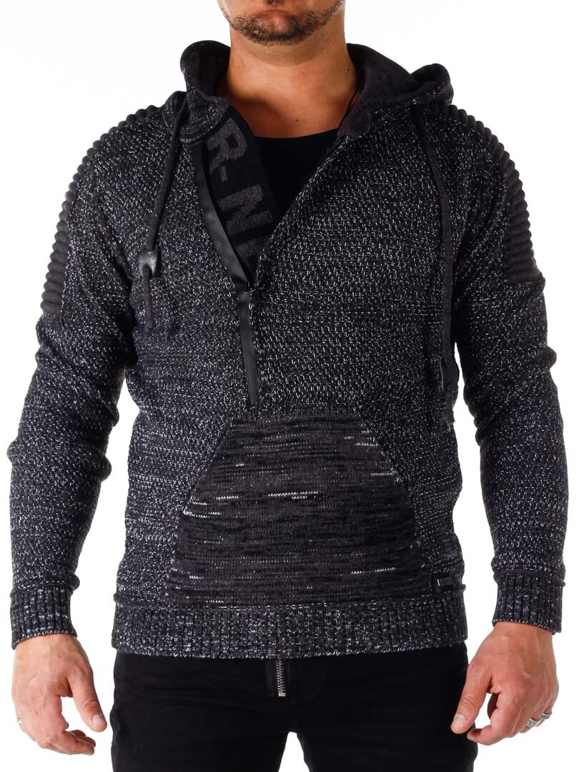 Hettegenser i strikket stretch med rifter på sidene som gir et maskulint uttrykk. Unik glidelås foran som går ned over brystet og skjulte bokstaver i strikken som er synlige når glidelåsen er åpen. Tykk, komfortabel hette med snøring og gjennomgående lomme opp til. Tilgjengelig i flere farger!