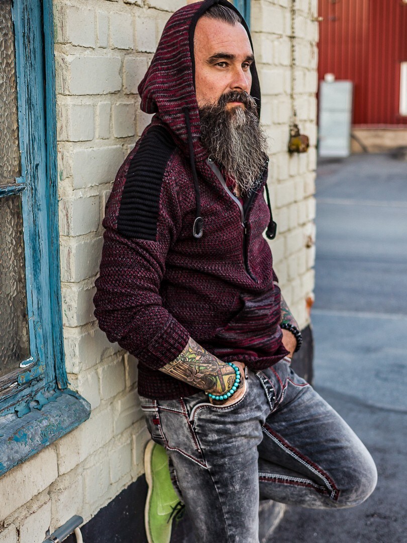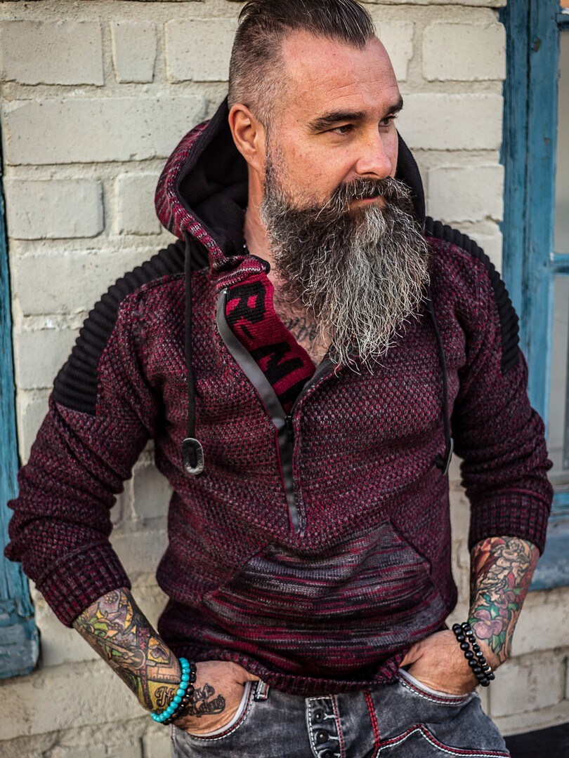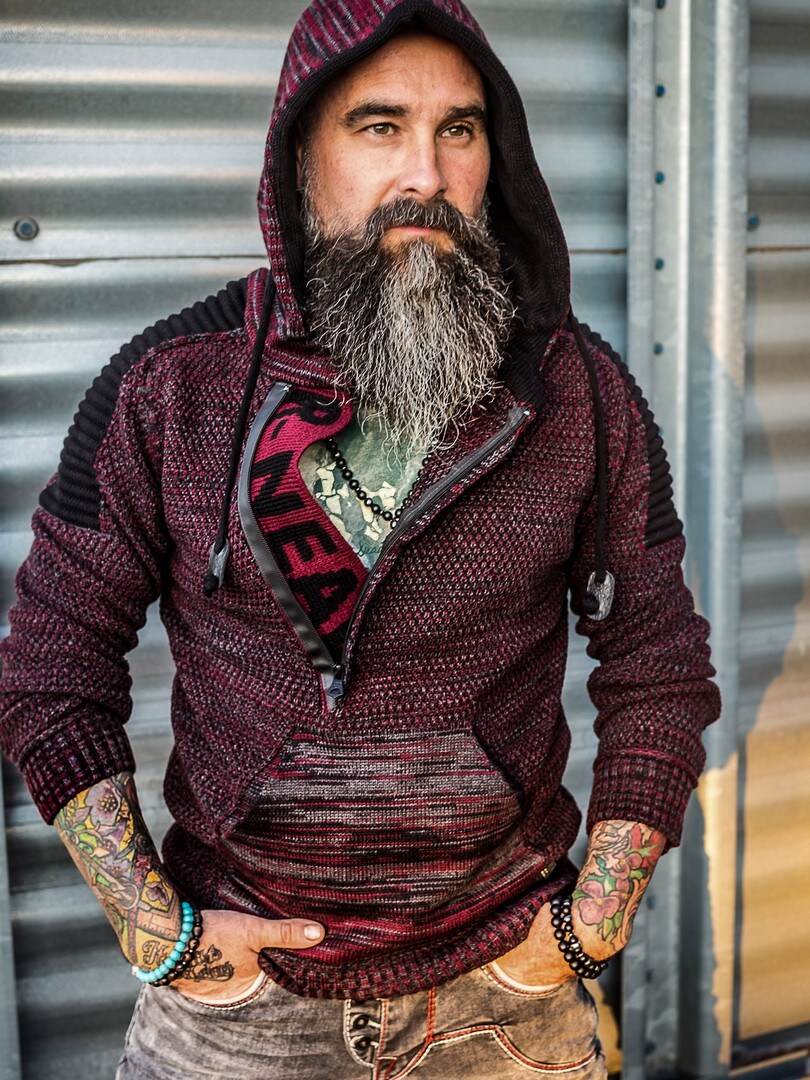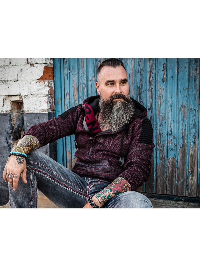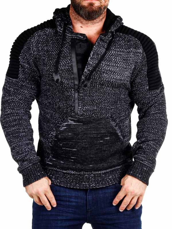 Hettegenser i strikket stretch med rifter på sidene som gir et maskulint uttrykk. Unik glidelås foran som går ned over brystet og skjulte bokstaver i strikken som er synlige når glidelåsen er åpen. Tykk, komfortabel hette med snøring og gjennomgående lomme opp til. Tilgjengelig i flere farger!