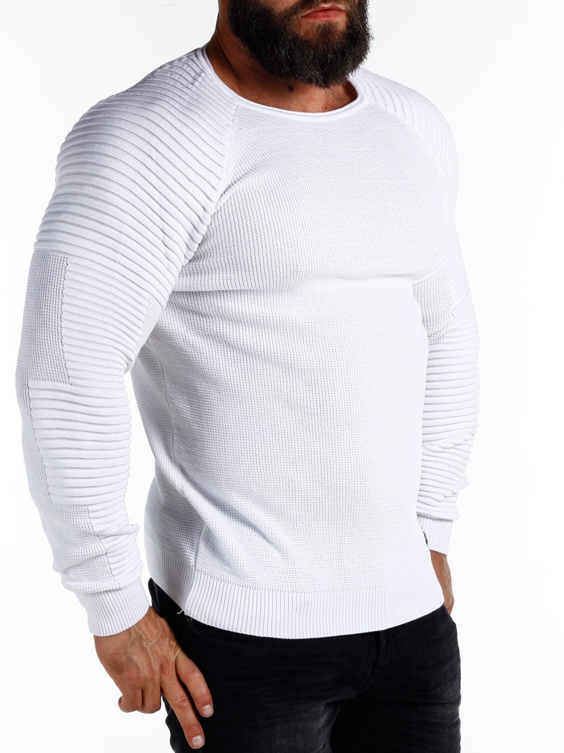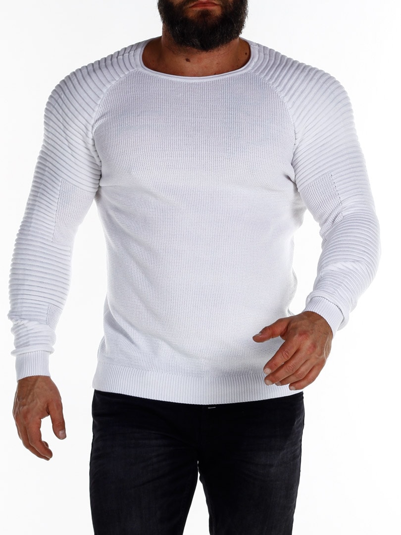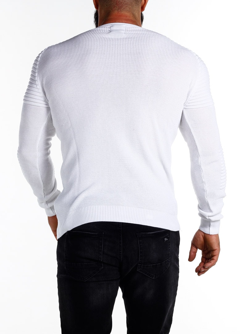 Elastisk strikkegenser med ulike mønsterstrikk og rund hals. Skuldre og ermer har et grovere mønster som gir en stilig kontrast. En liten patch i sort kunstskinn vises nederst. Finnes i flere farger!