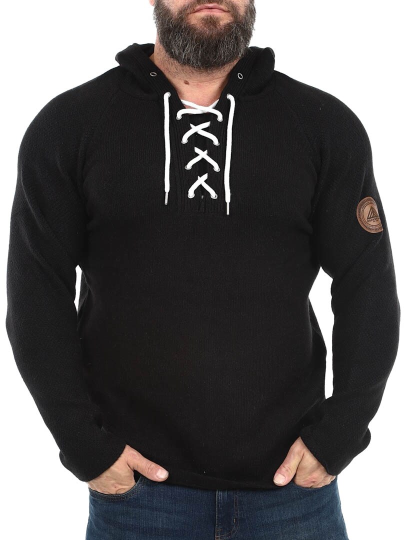 Strikket genser i en ull- og kashmirblanding som gjør den veldig behagelig og varm. Stilig designet med hette, snøring foran og imiterte skinnlapper med logo. Denne skjorten er spesiallaget for våre kunder og er kun tilgjengelig hos RockDenim!