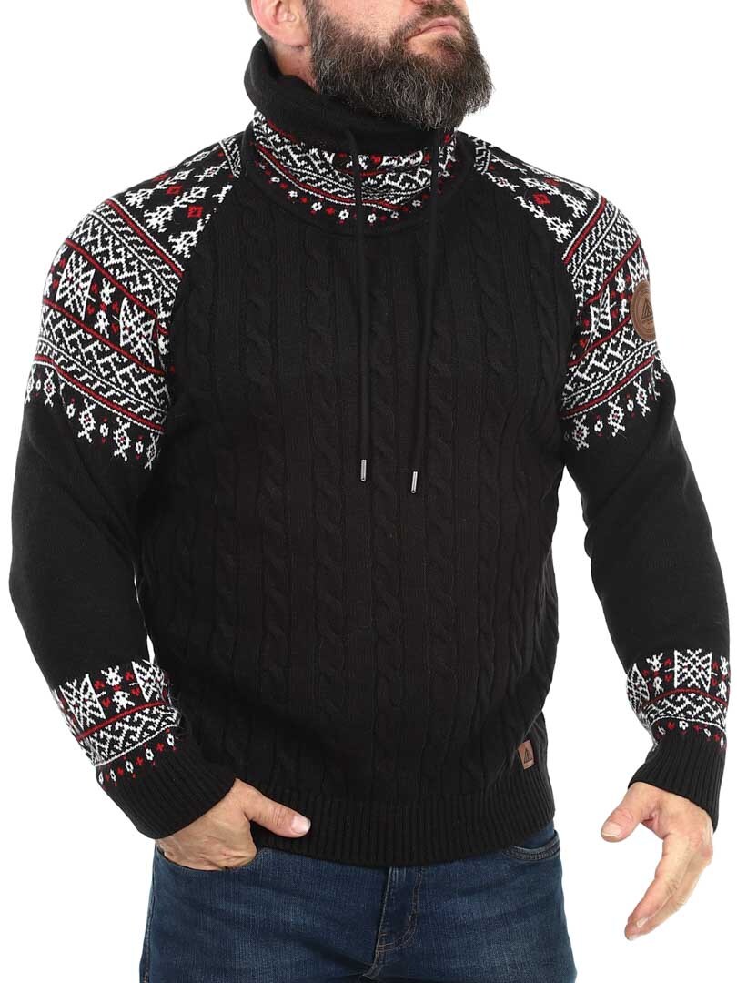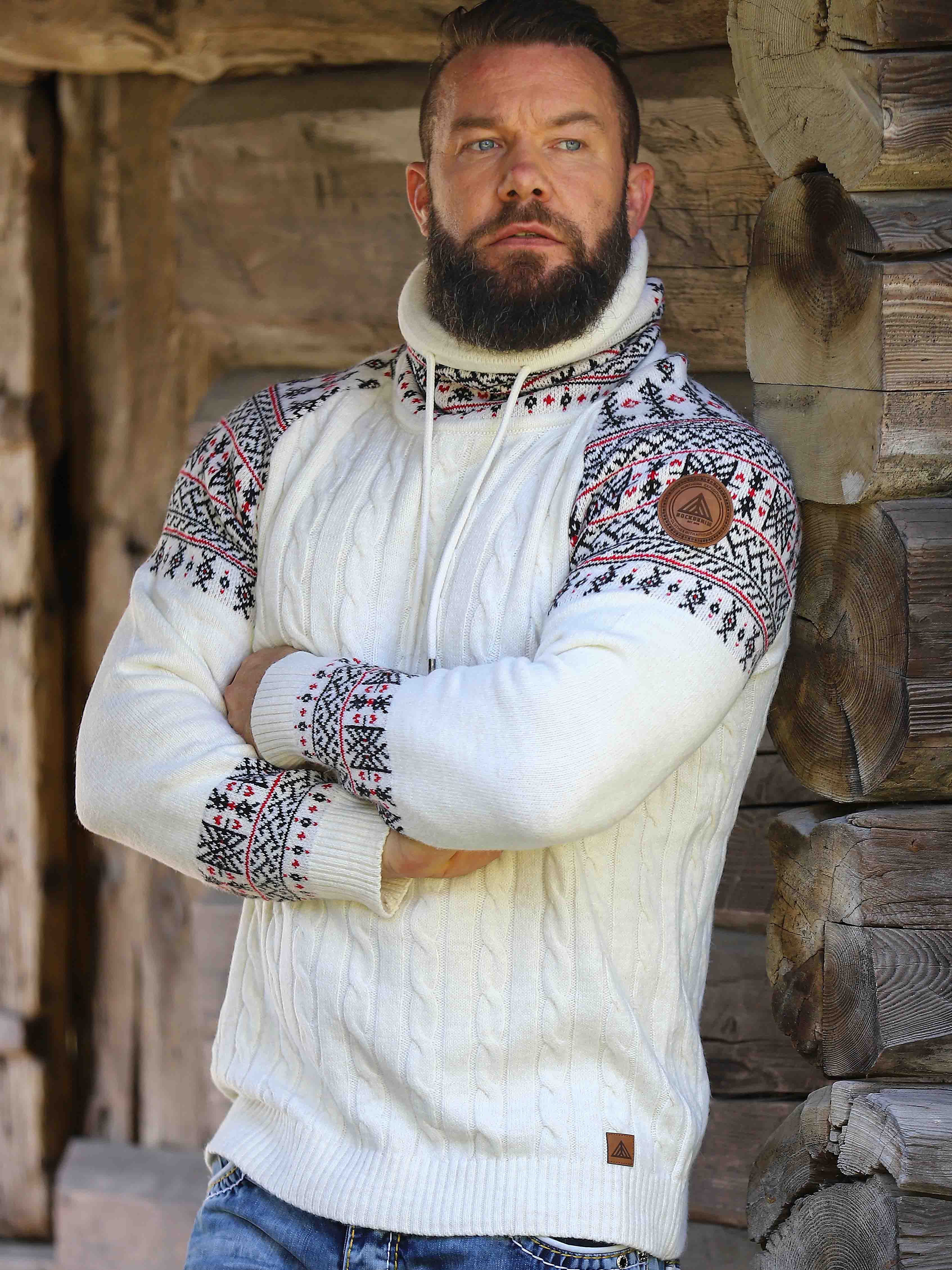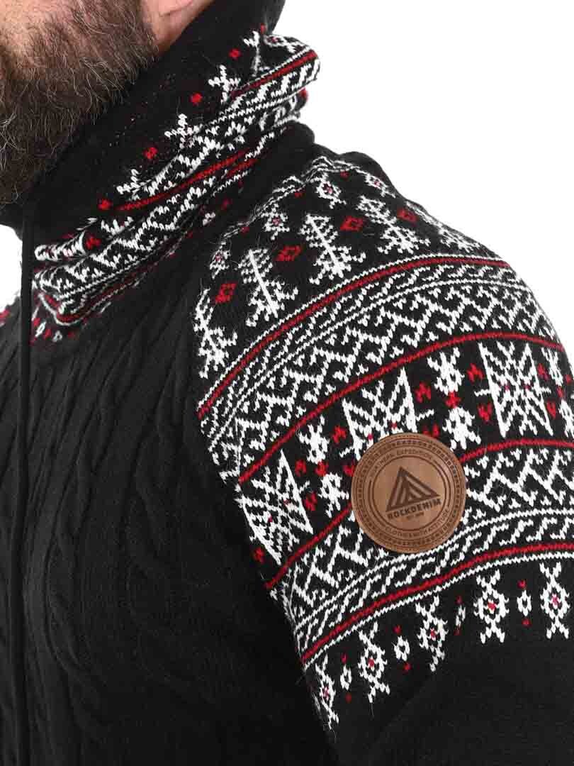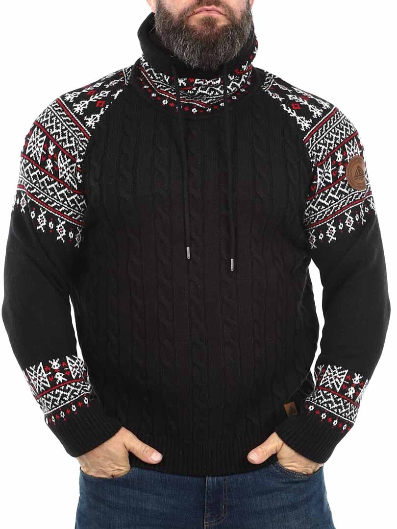 Kabelstrikket genser som er veldig behagelig og varm. Vikinginspireret strikkegenser med unikt design. Designet med høy hals som kan justeres med lisser. Ermer og hals er fremhevet med et fint mønster i kontrastfarger. Denne strikkegenseren er spesiallaget for våre kunder og er kun tilgjengelig hos RockDenim!