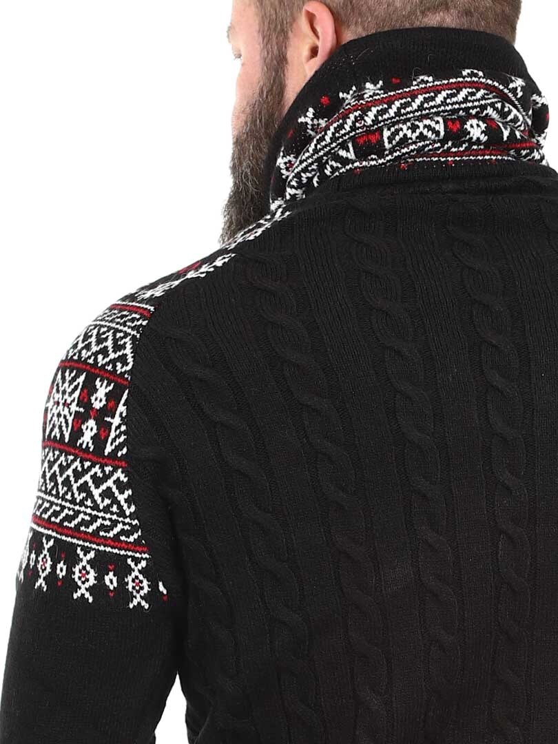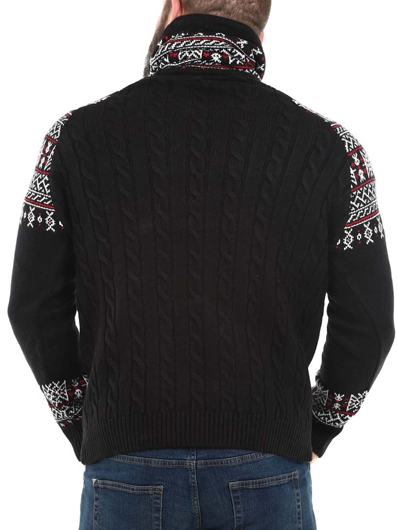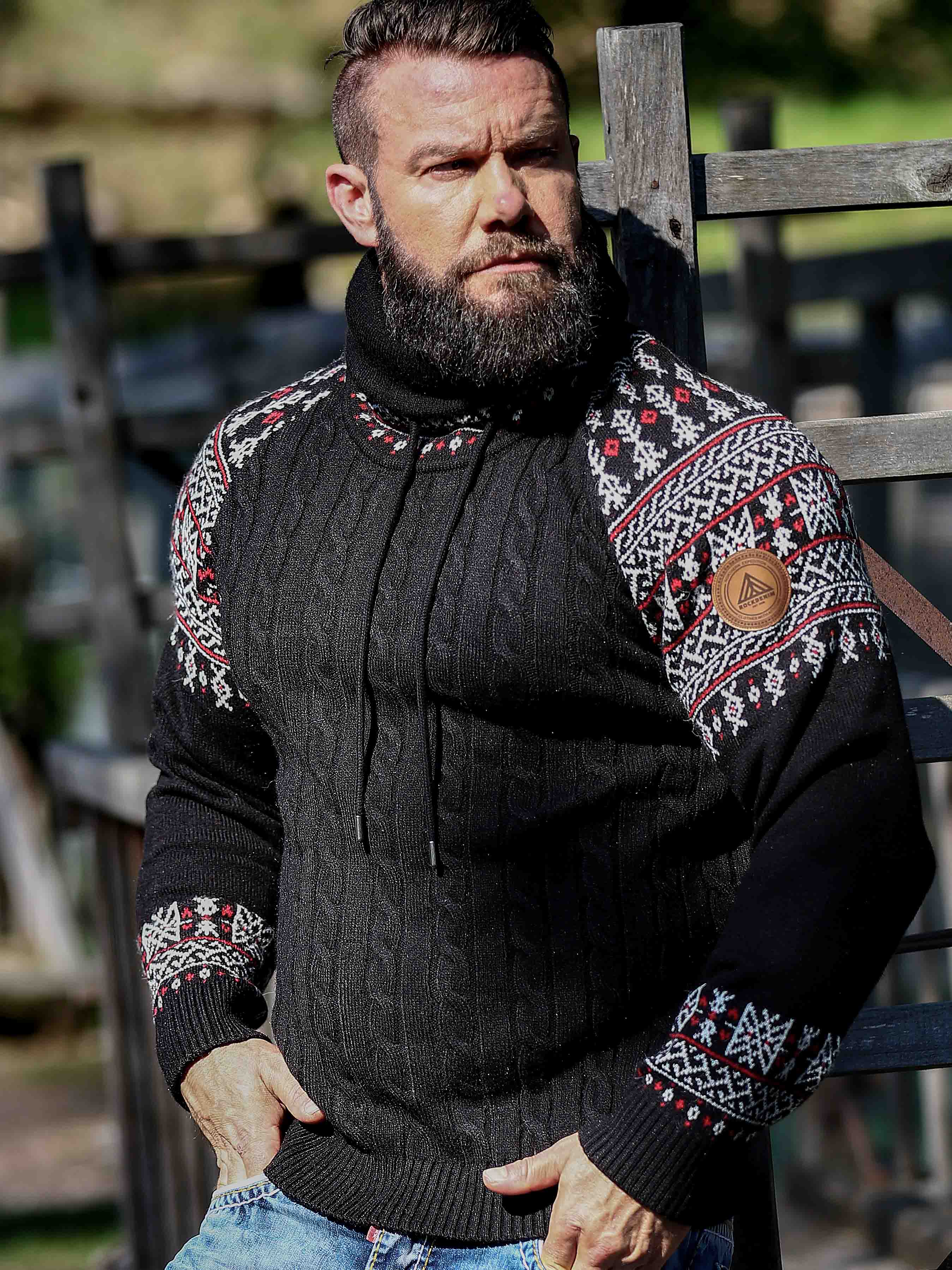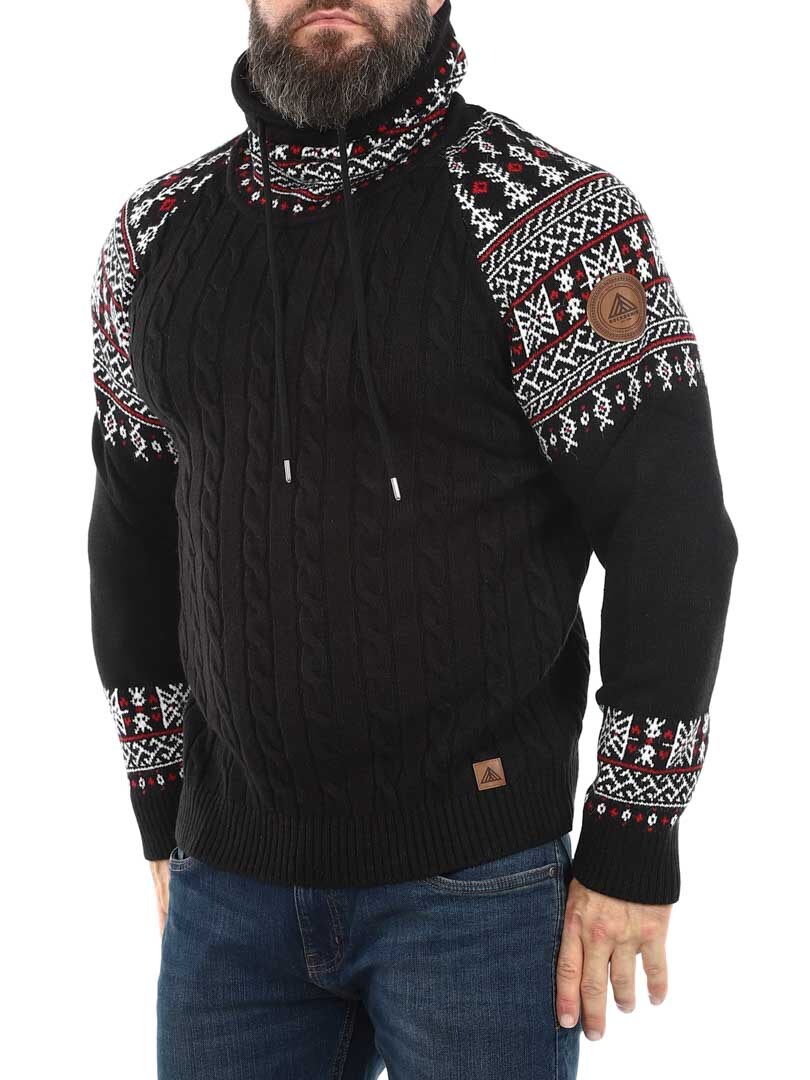 Kabelstrikket genser som er veldig behagelig og varm. Vikinginspireret strikkegenser med unikt design. Designet med høy hals som kan justeres med lisser. Ermer og hals er fremhevet med et fint mønster i kontrastfarger. Denne strikkegenseren er spesiallaget for våre kunder og er kun tilgjengelig hos RockDenim!