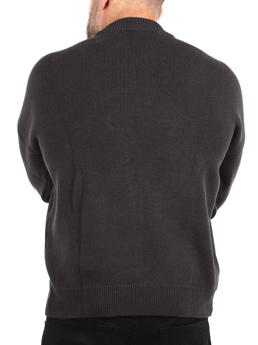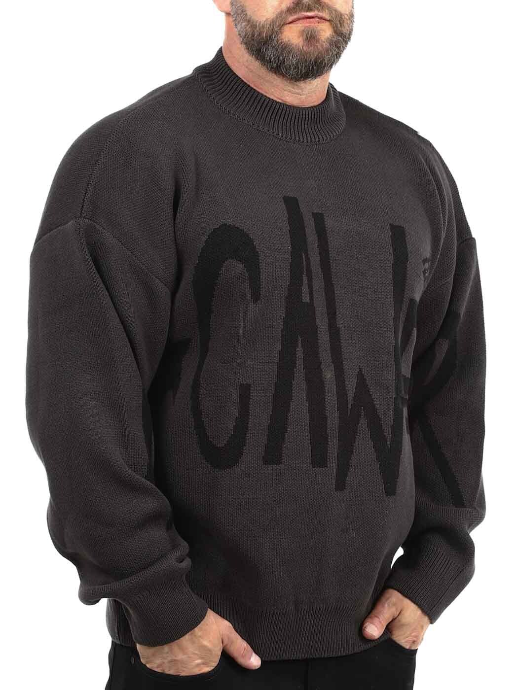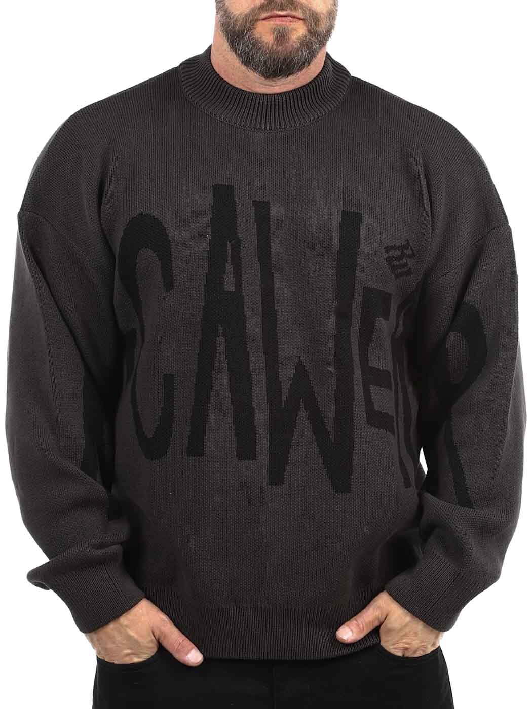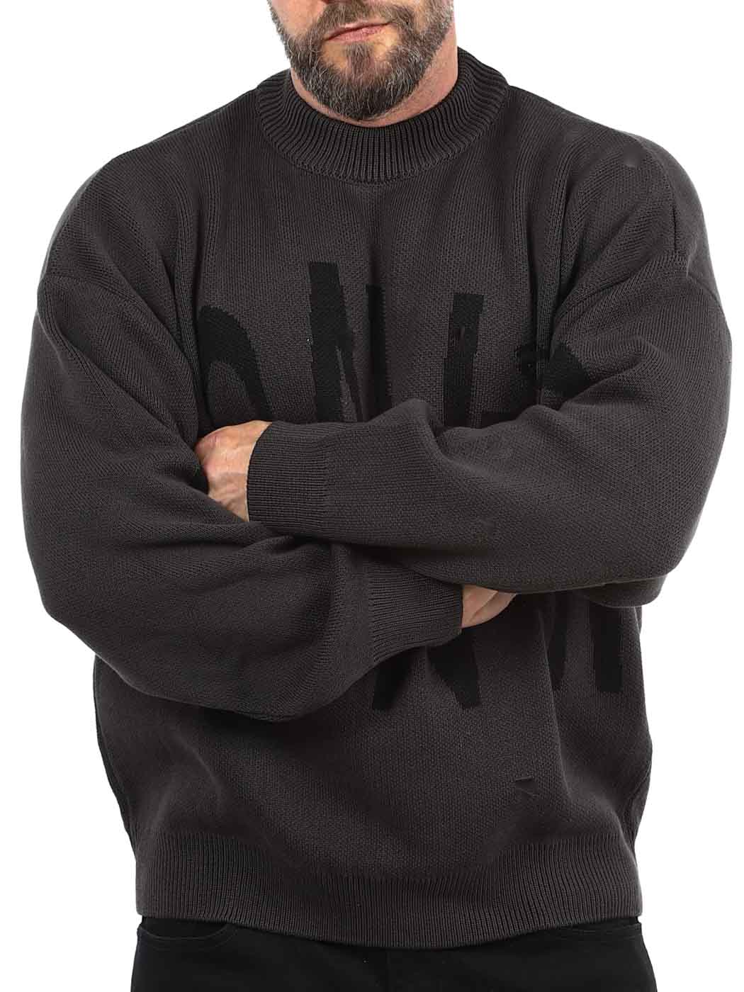 Tykk strikk i en robust grå nyanse som føles like solid som den ser ut. Designet med en svart, chunky logo foran og ribbestrikkede kanter. Perfekt for kjølige dager, eller når du bare vil ha noe som føles solid.