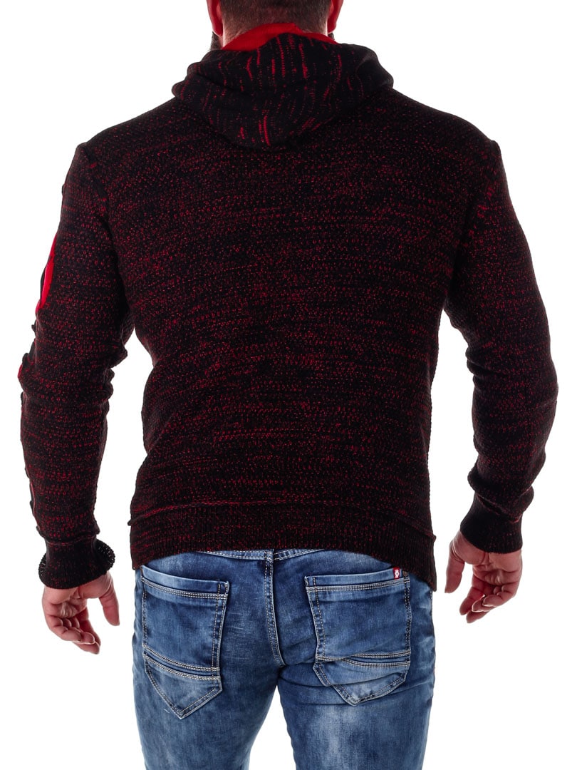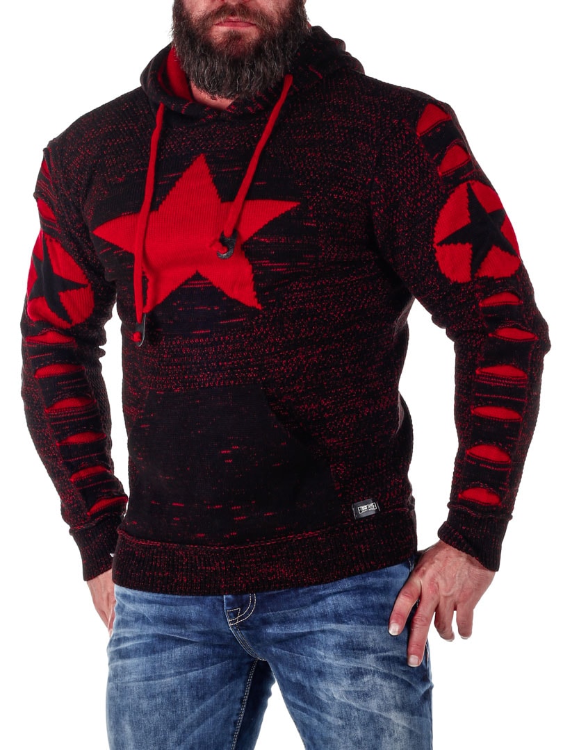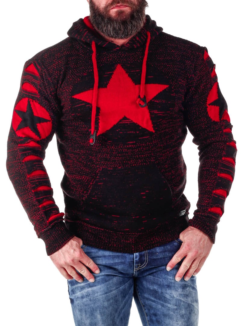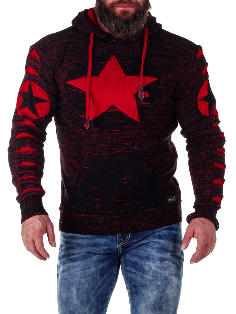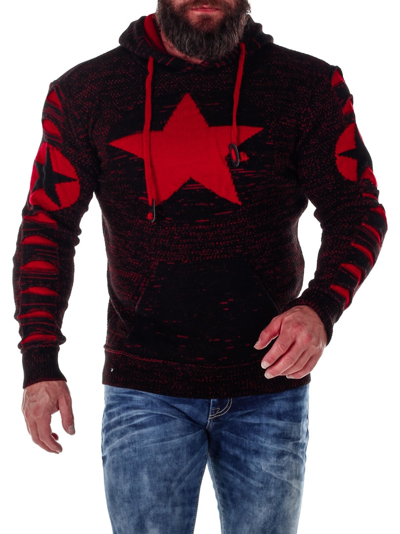 Komfortabel og varm hettegenser i strikket materiale med stor magelomme og justerbar hette. Den er mønstret med stjerner og røde rifter.