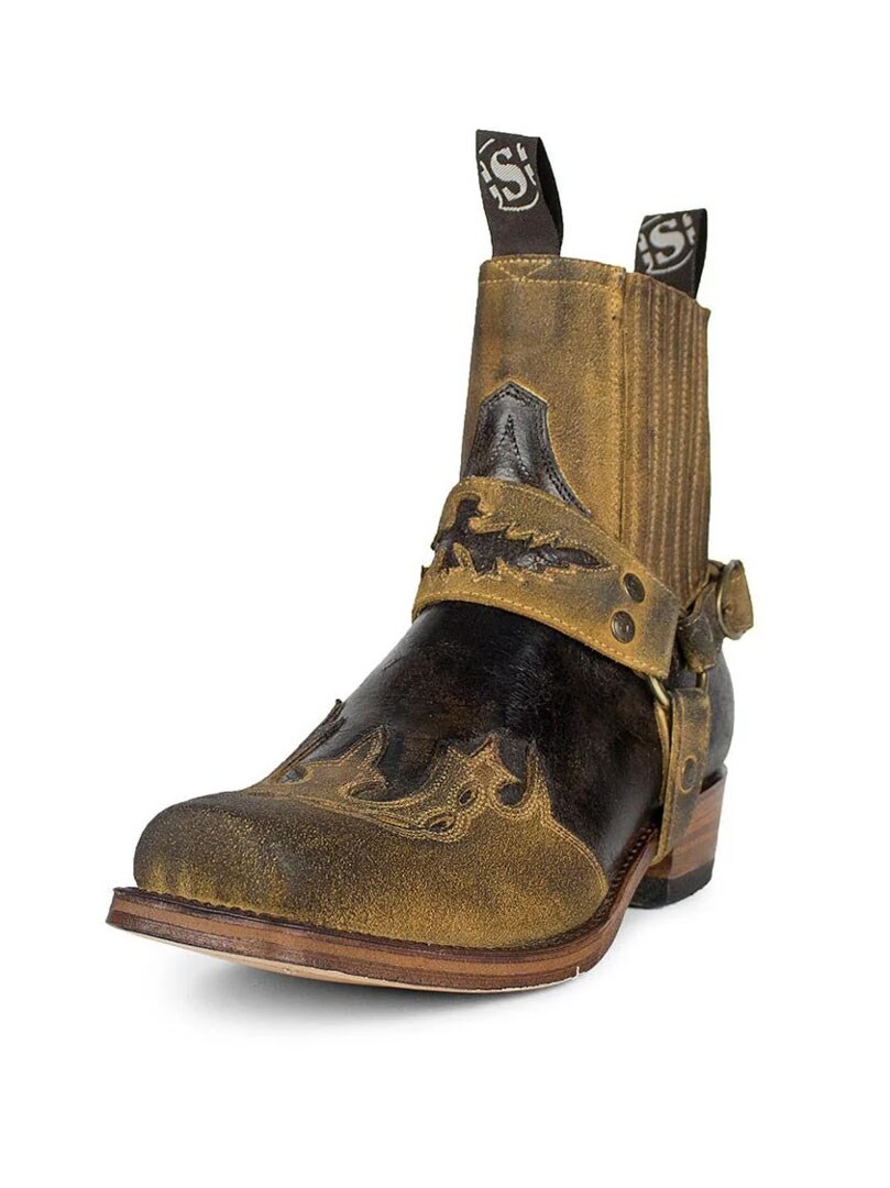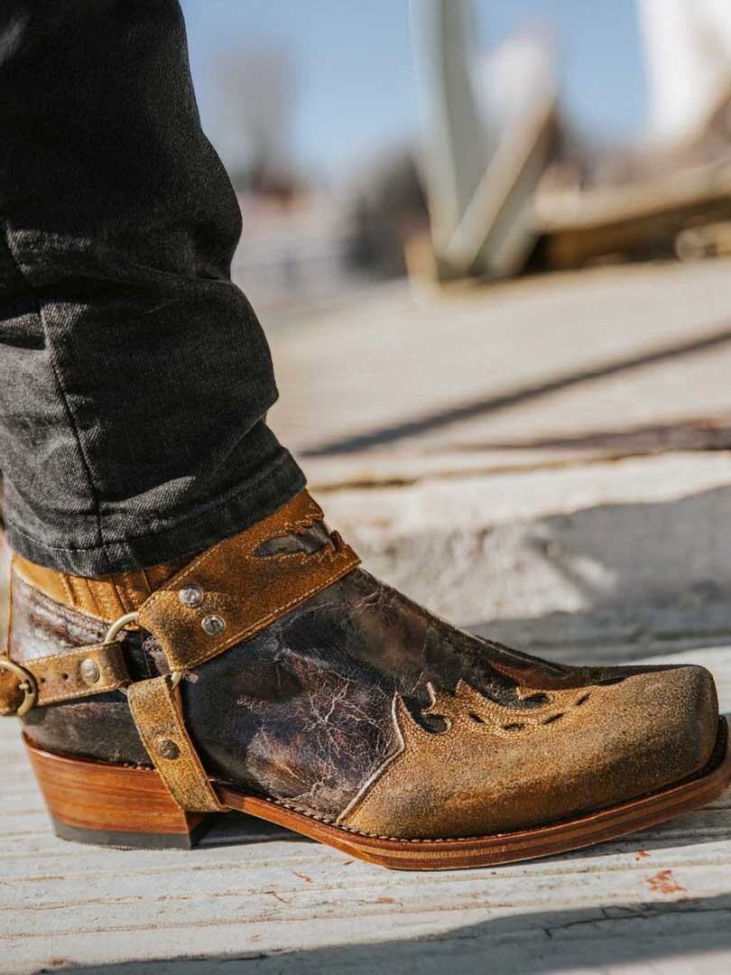 Korte westernstøvler som kombinerer klassisk cowboyestetikk med en rocka vri. De er laget av ekte skinn med broderier, dekorative harnessstropper og elastiske sidepaneler som gjør dem enkle å ta av og på. Disse håndlagde skoene er både slitesterke og har et rått, maskulint uttrykk.