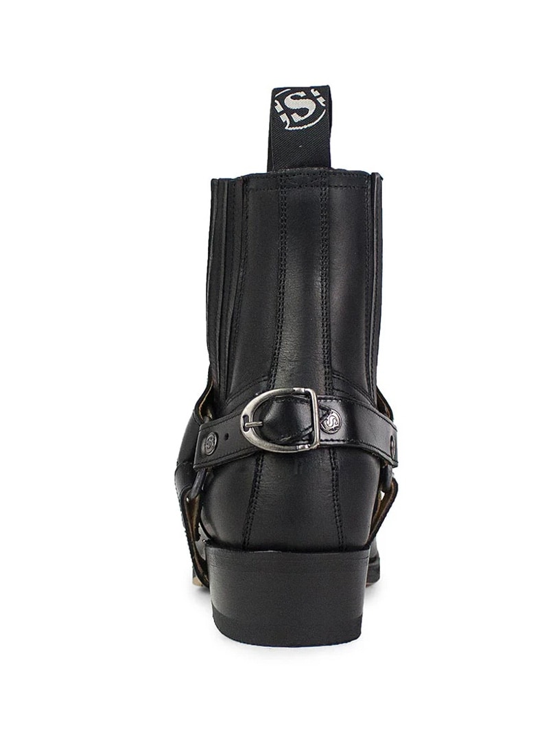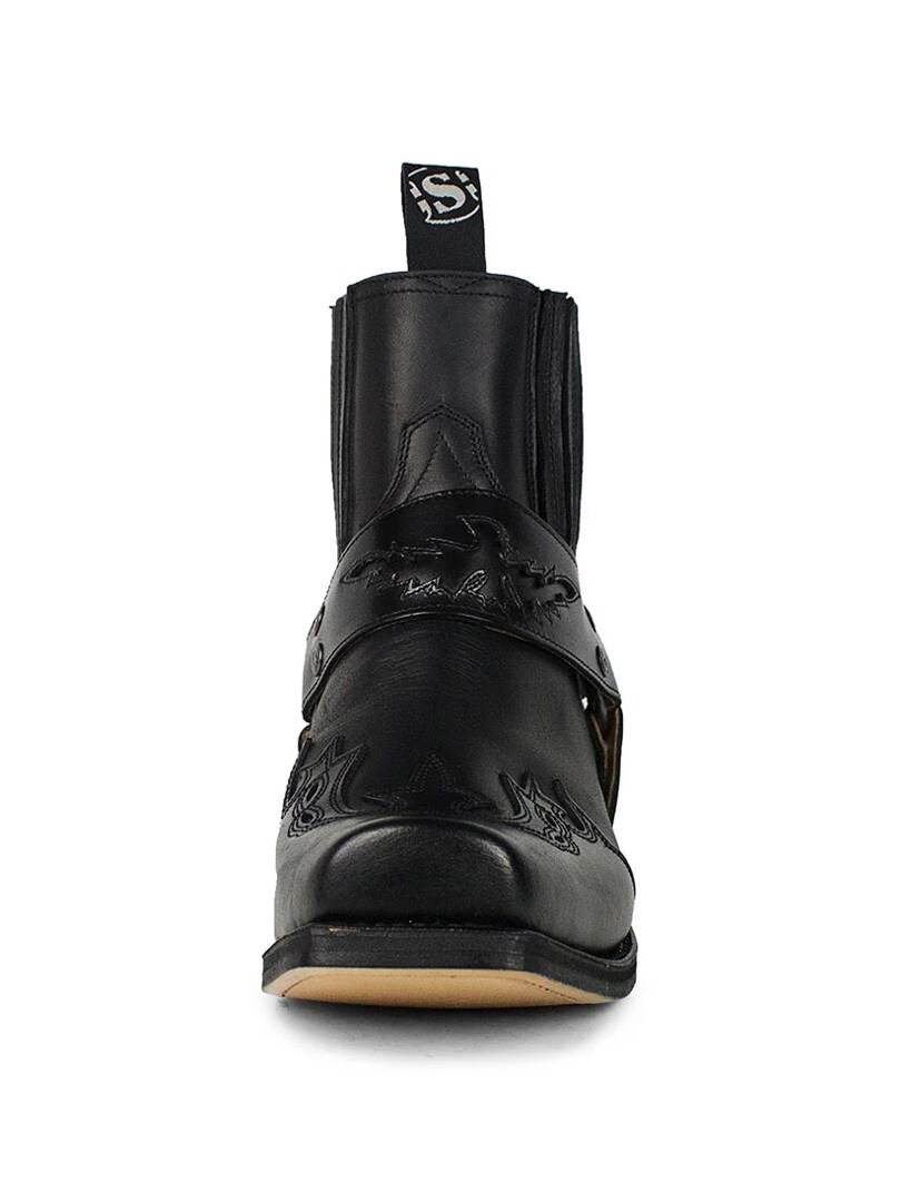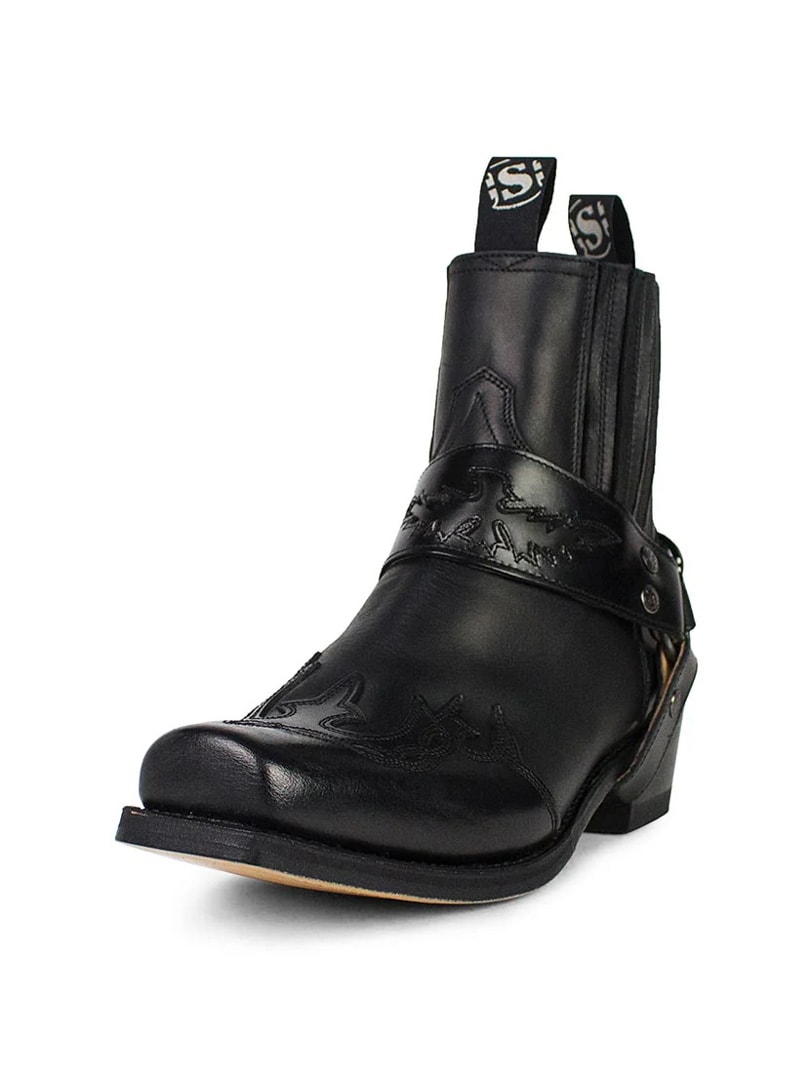 Korte westernstøvler som kombinerer klassisk cowboyestetikk med en rocka vri. De er laget av ekte skinn med broderier, dekorative harnessstropper og elastiske sidepaneler som gjør dem enkle å ta av og på. Disse håndlagde skoene er både slitesterke og har et rått, maskulint uttrykk.