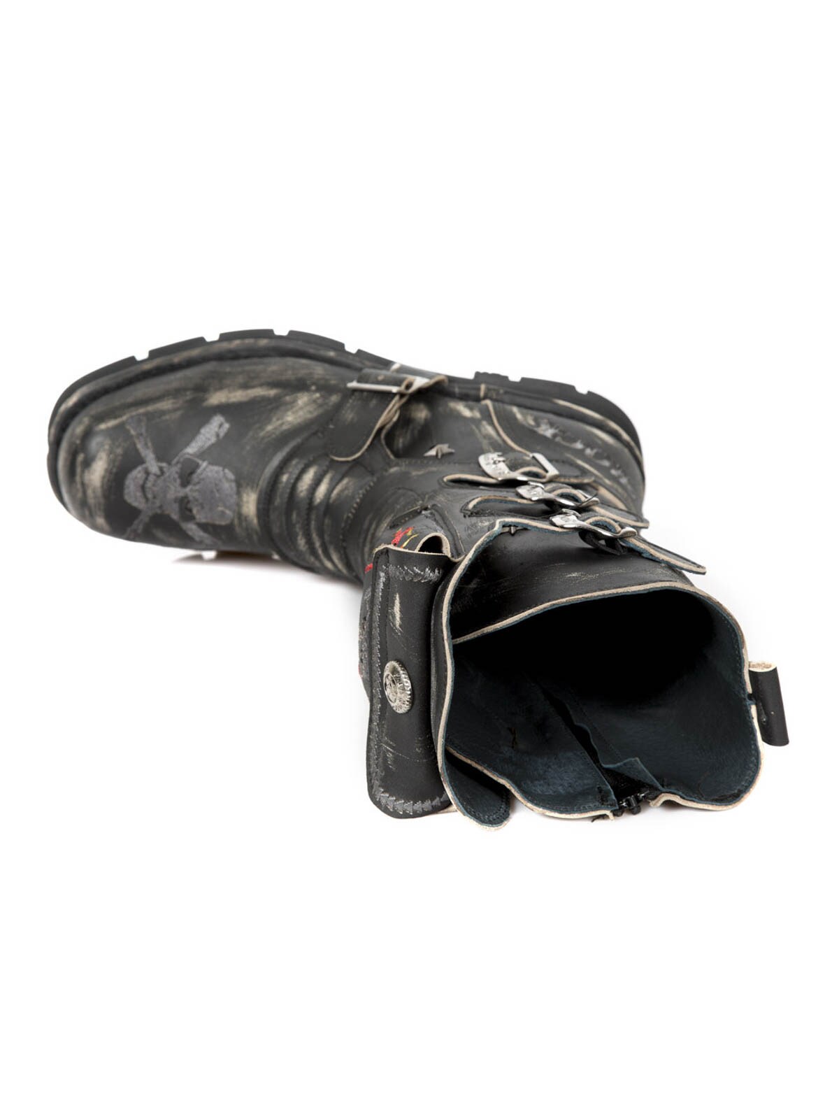 Sko med høyt skaft og mønsterbroderi. Designet med en lukkbar lomme på skaftet øverst. Lærspenner med metallås foran, samt glidelås på innsiden som gjør dem enkle å ta av og på. New Rock-skoene er håndlaget i ekte skinn og finnes i begrenset opplag, noe som gjør hver sko unik.