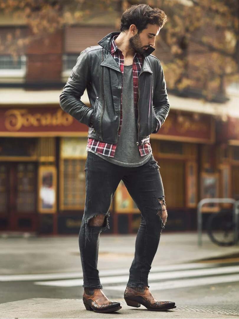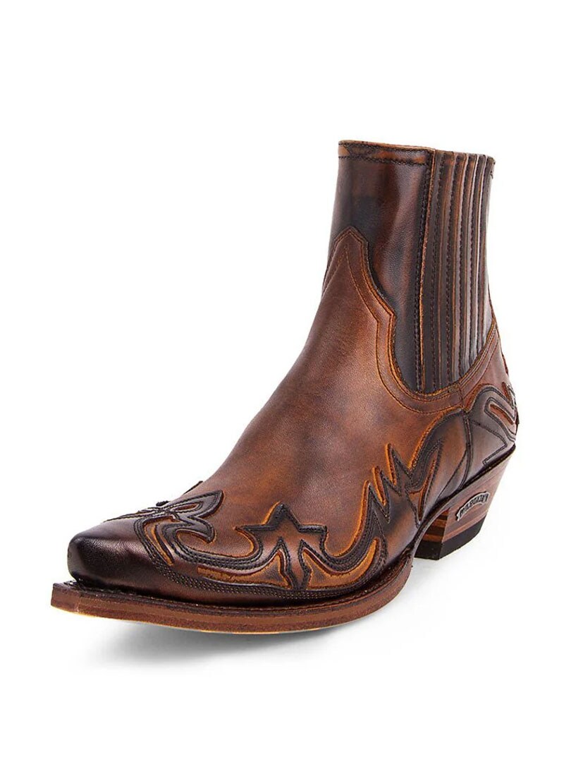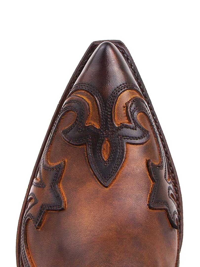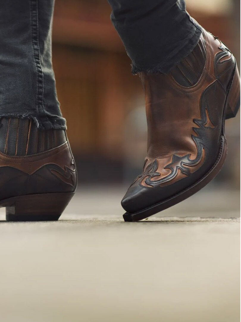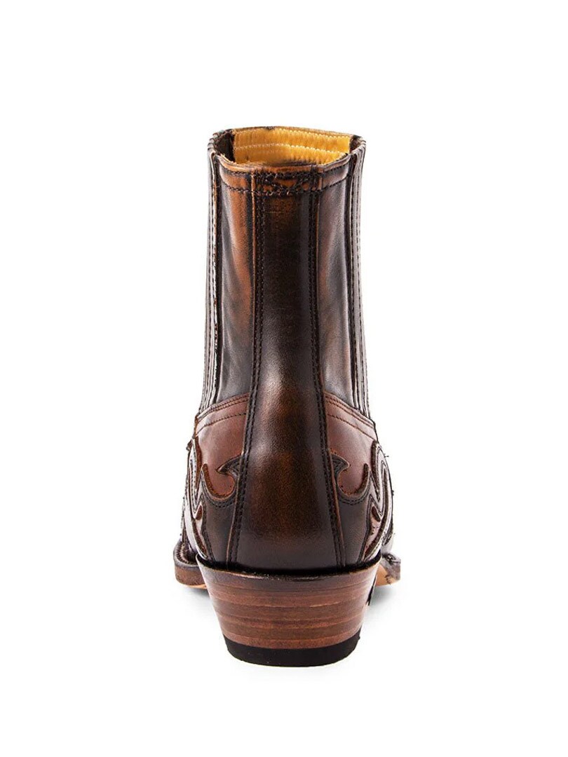 Korte westernstøvler i ekte brunt skinn med et brodert flammemønster. De elastiske sidepanelene gjør det enkelt å ta støvlene av og på, mens den spisse tåen og den vinklede hælen bevarer den tradisjonelle westernkarakteren. Perfekt for deg som ønsker et par allsidige støvler med karakter.
