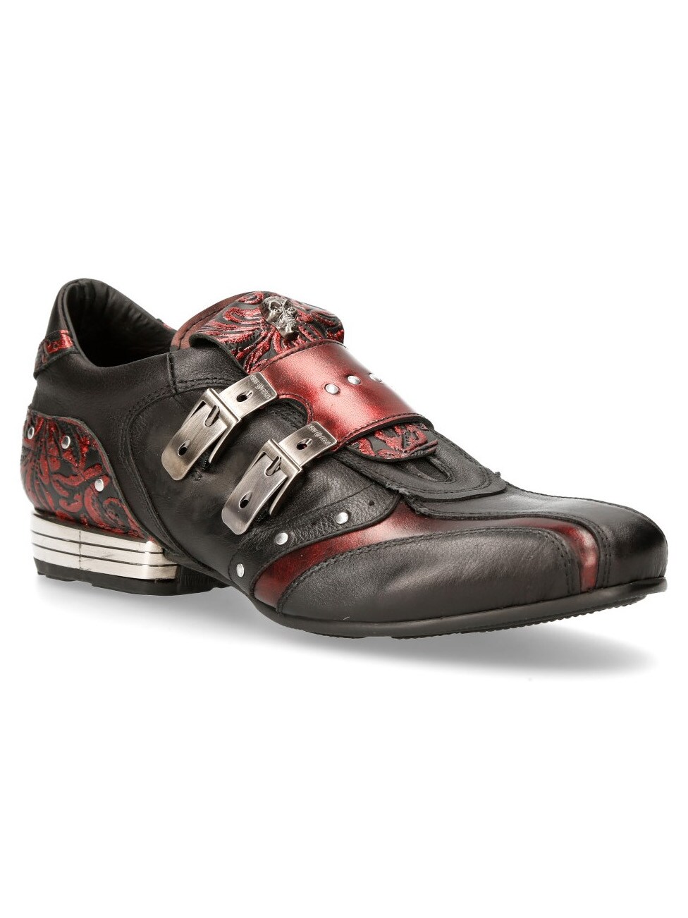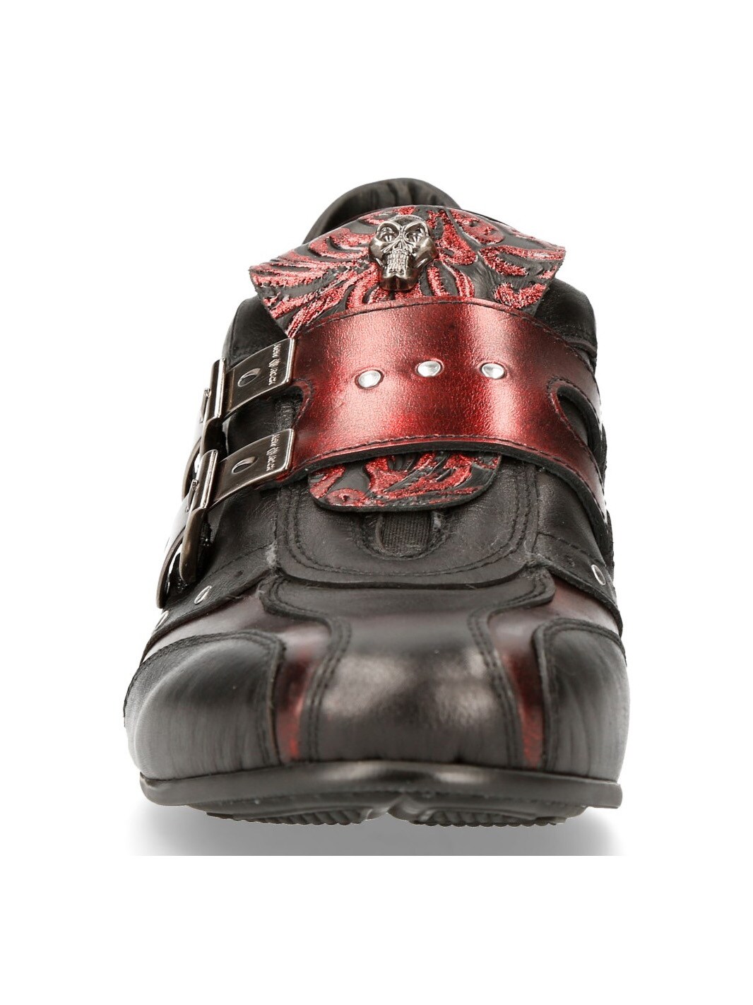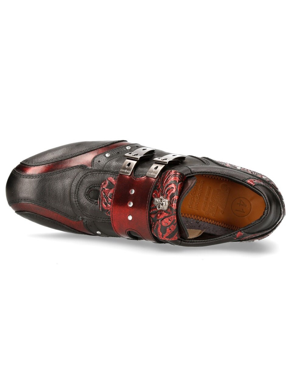 Sorte sko i ekte skinn med mønster og lavt skaft. Detaljert med røde seksjoner, nagler og en lærreim med to metallspenner. Hodeskallelapp foran på skoen. Denne unike skoen er tilgjengelig i begrenset opplag!