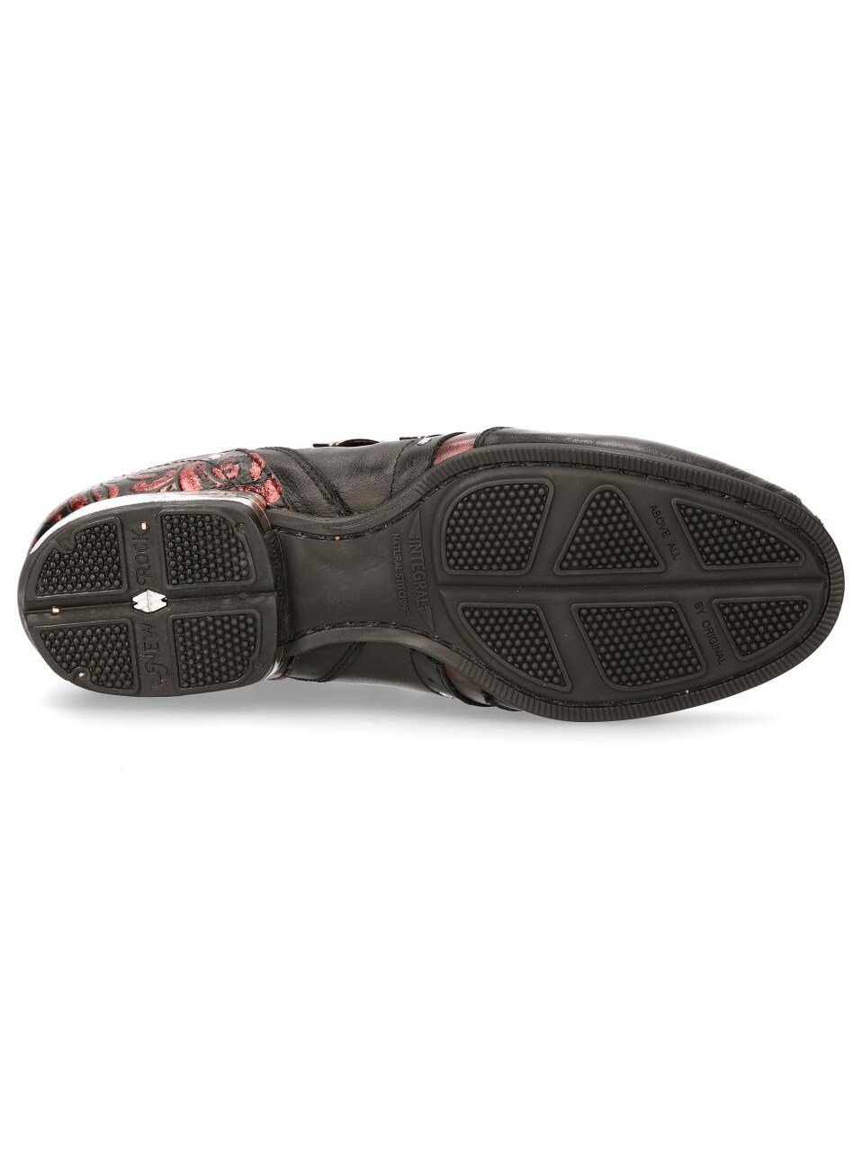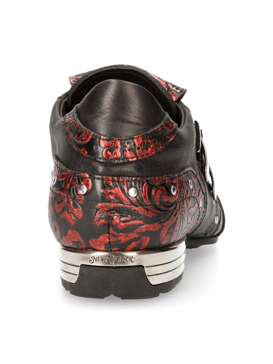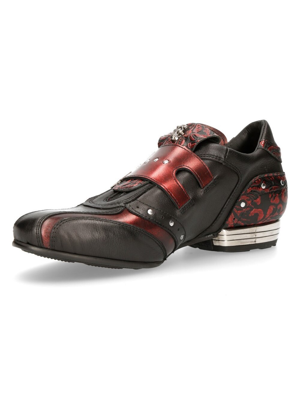 Sorte sko i ekte skinn med mønster og lavt skaft. Detaljert med røde seksjoner, nagler og en lærreim med to metallspenner. Hodeskallelapp foran på skoen. Denne unike skoen er tilgjengelig i begrenset opplag!
