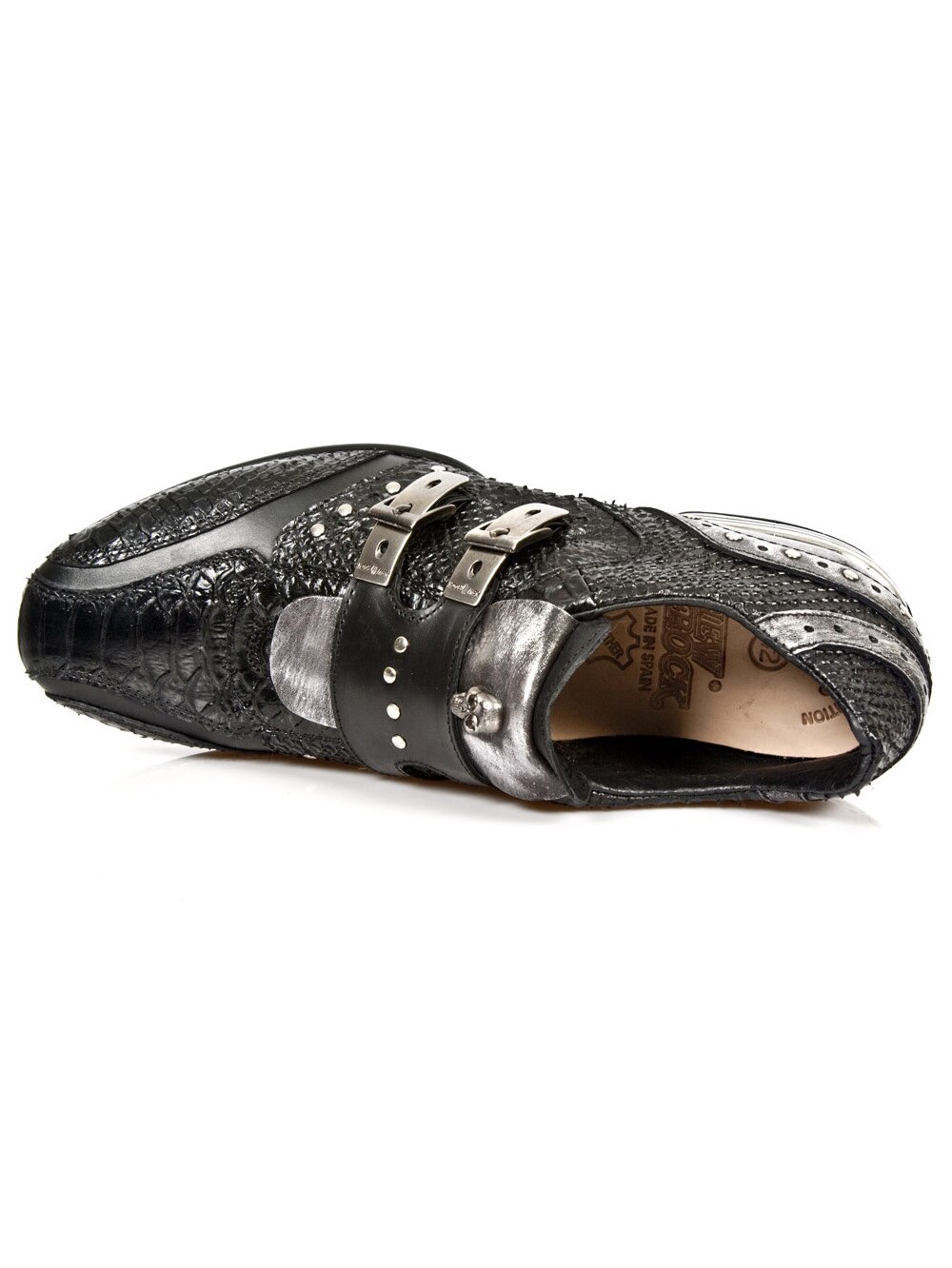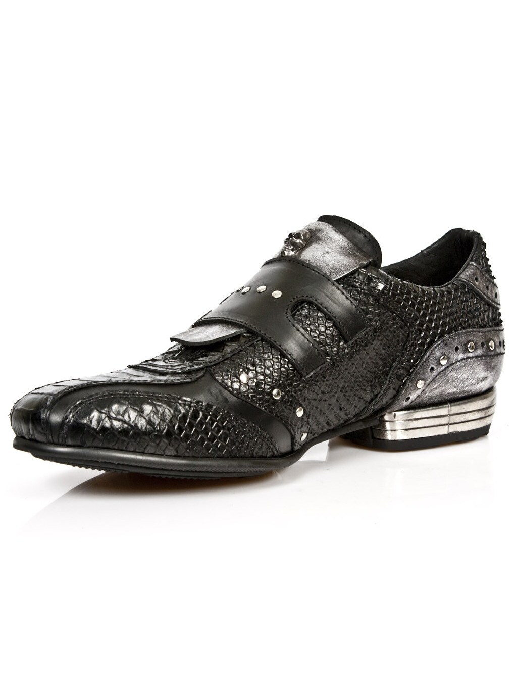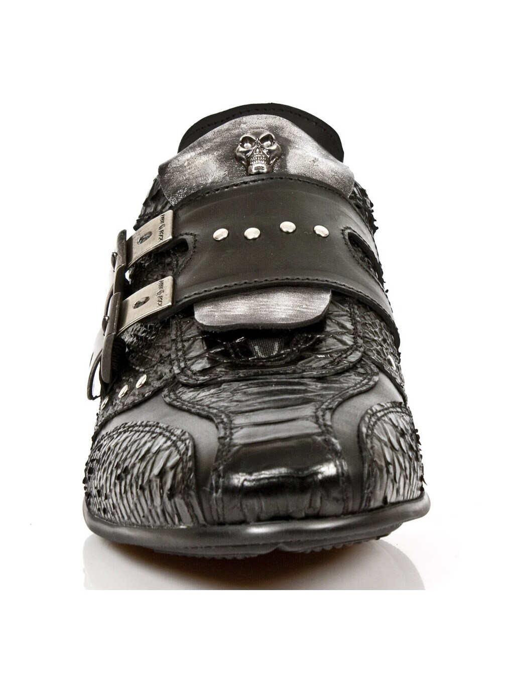 Unike sko i ekte skinn med mønster og lavt skaft. Designet med grå detaljer, nagler og en lærreim med to metallspenner. Hodeskallemotiv i metall foran på skoen. Denne unike skoen er tilgjengelig i begrenset opplag!