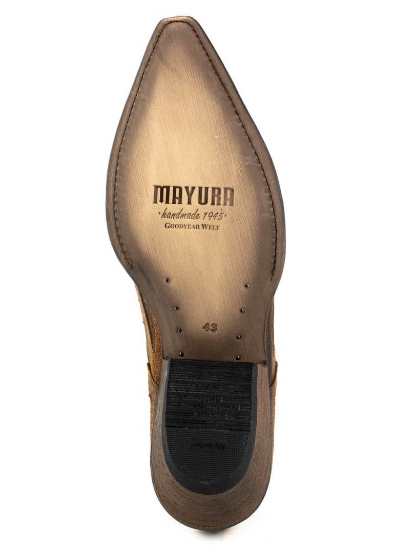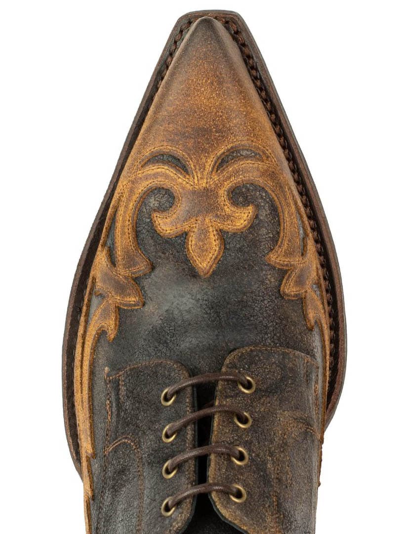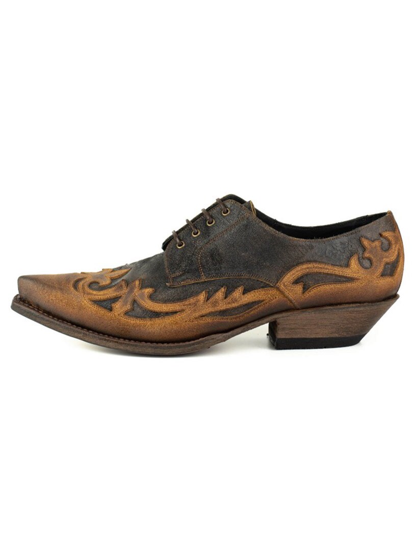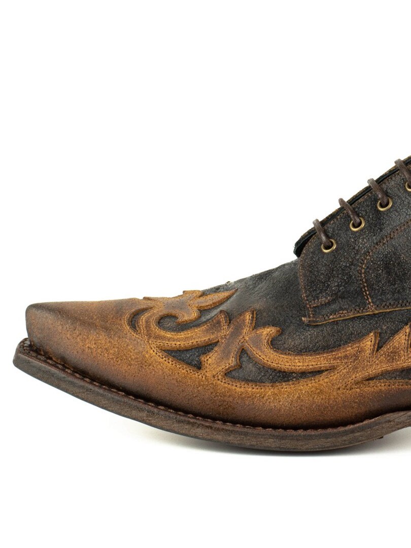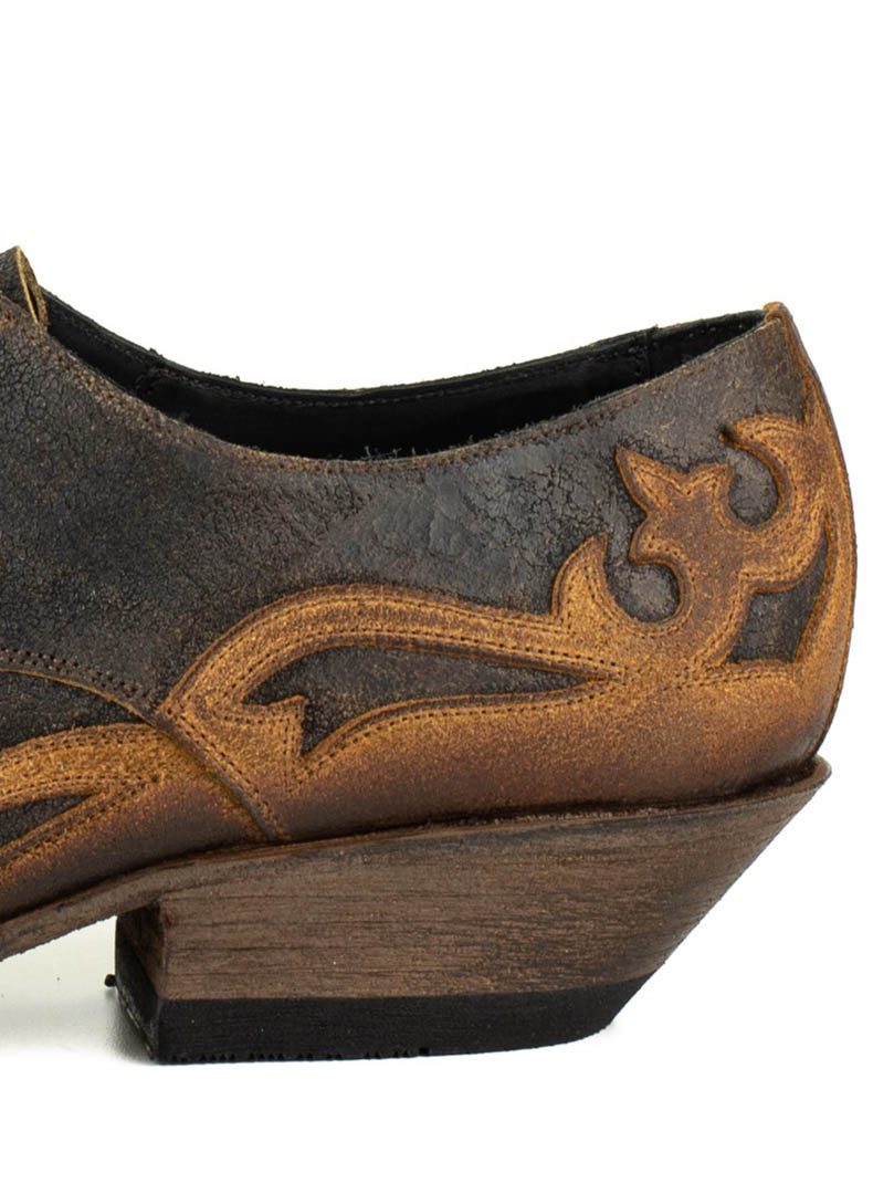 En unik sko i rustikt, aldret læder med to brune nuancer, der skaber en naturlig vintagefølelse. Den profilerede design og de udskårne detaljer giver et markant westernlook, der virkelig skiller sig ud. Sålen er lavet af spansk kalveskind, og skoen er håndlavet efter det klassiske Goodyear Welt-system – en af de mest holdbare og prestigefyldte konstruktioner inden for skoproduktion. Resultatet er en sko med imponerende levetid, stabilitet og komfort, som former sig efter foden over tid. Perfekt til dig, der vil bære noget både robust, elegant og karakterfuldt!
