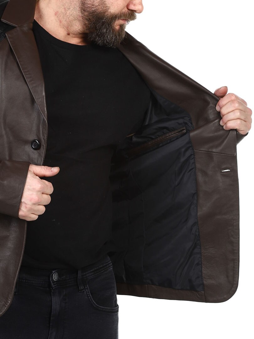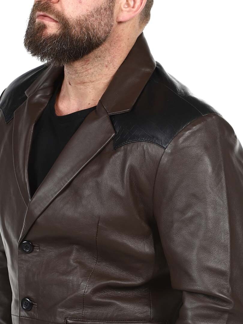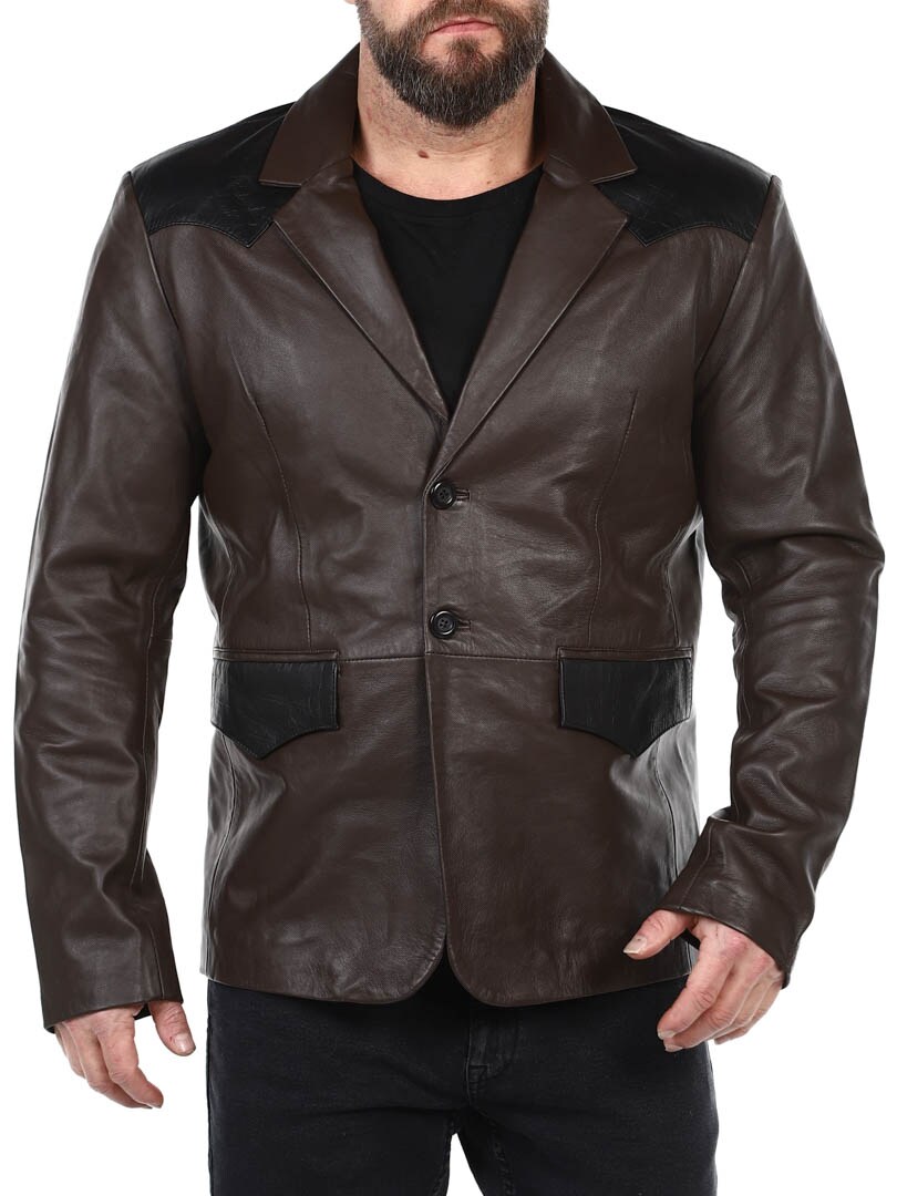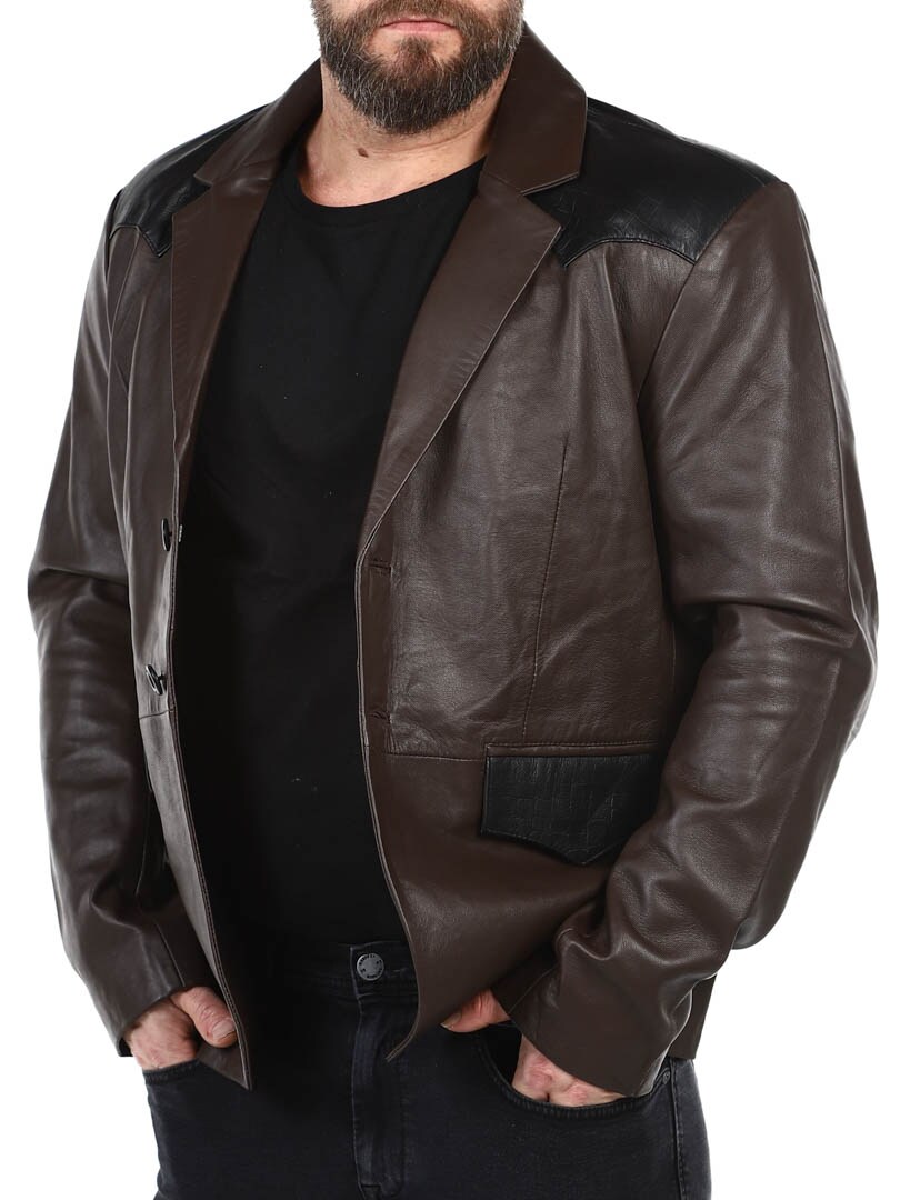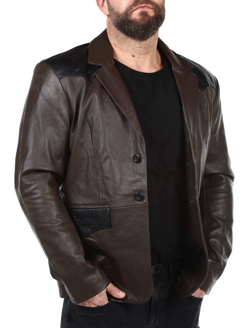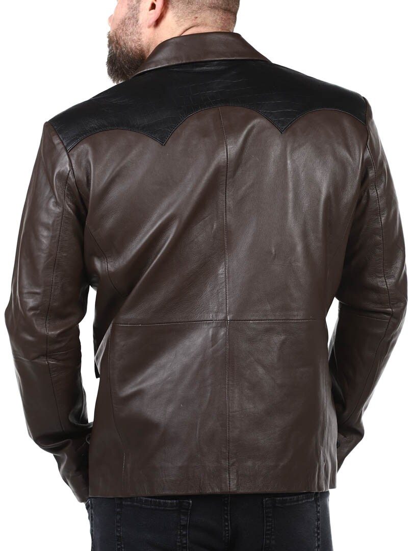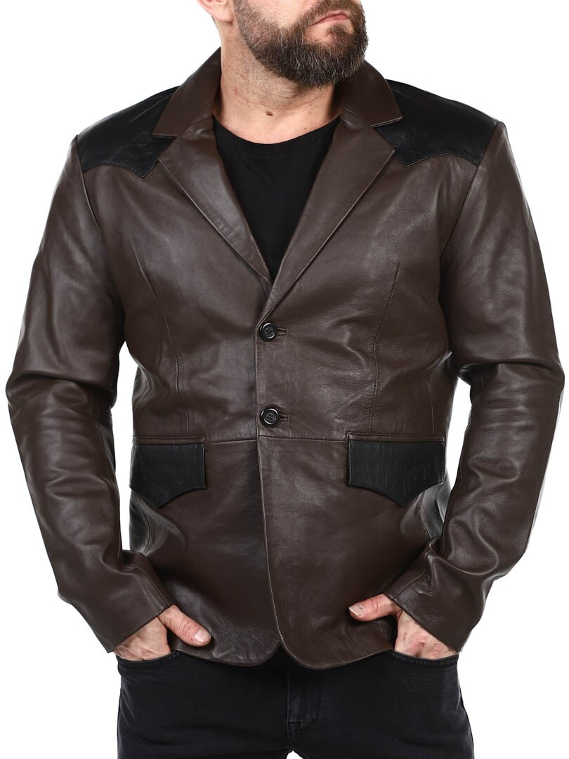 Brun blazer med skuldre og lommeklaffer i svart reptilmønster. Enkeltknappsmodell med krage og to frontlommer, samt to innerlommer. Denne jakken er laget av mykt skinn for best komfort og er kun tilgjengelig hos RockDenim!