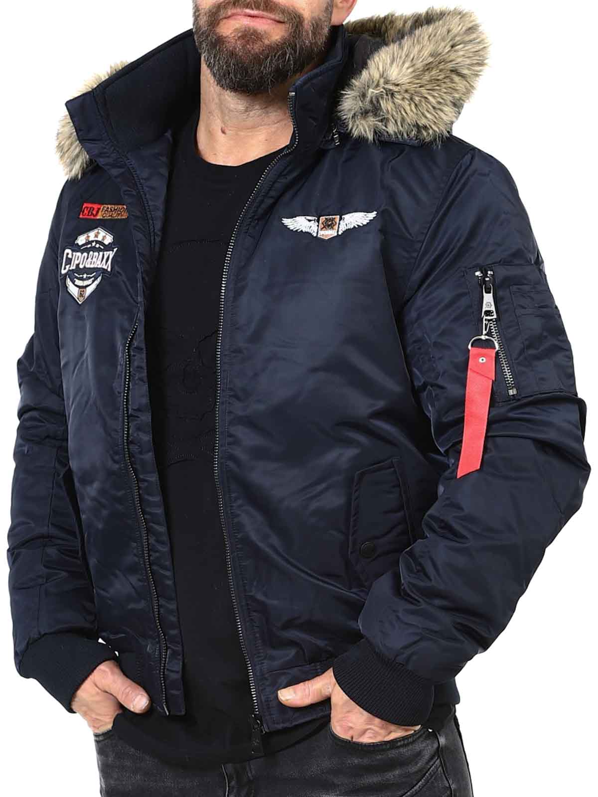 Cipo & Baxx Dravion Bomberjakke i mørkeblått er en funksjonell og iøynefallende herrejakke med pilotinspirerte detaljer og avtagbar pelskant.