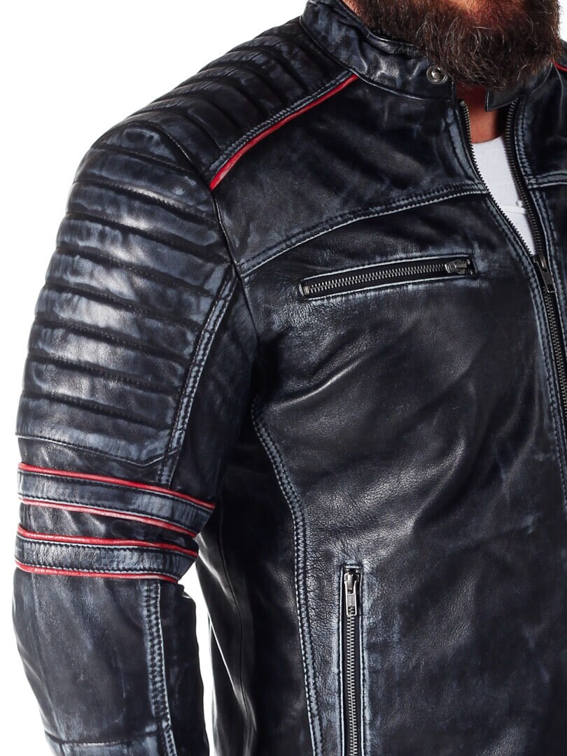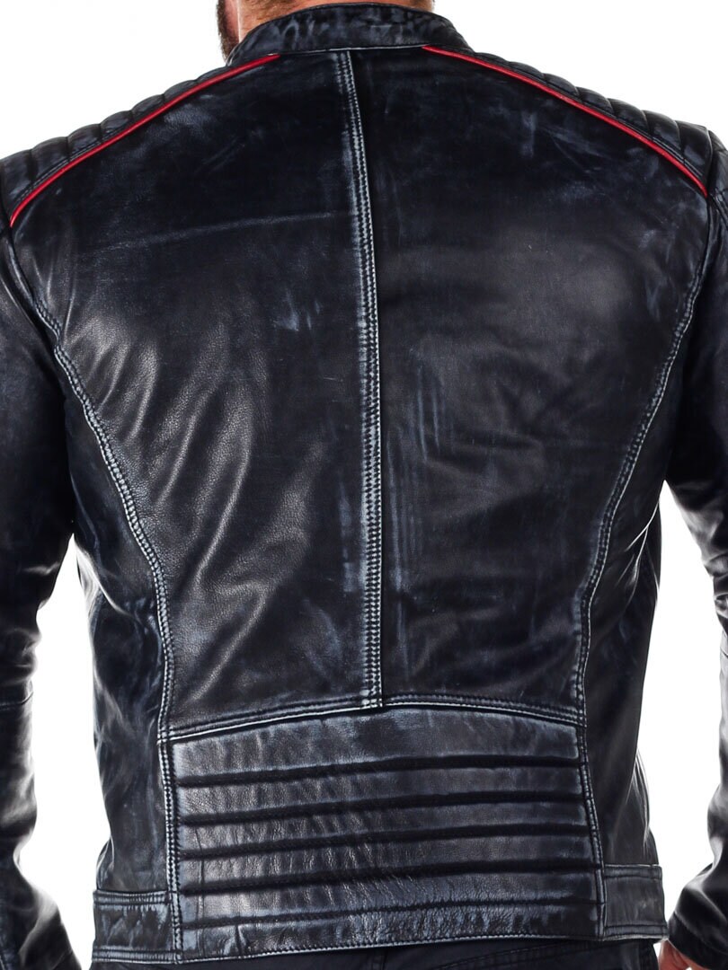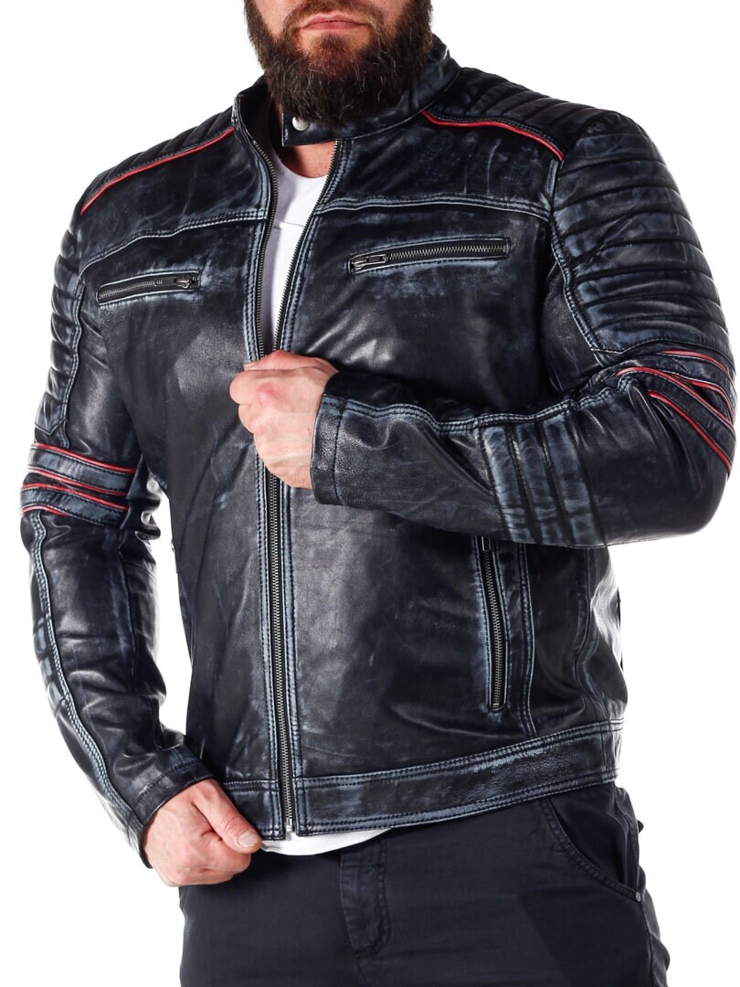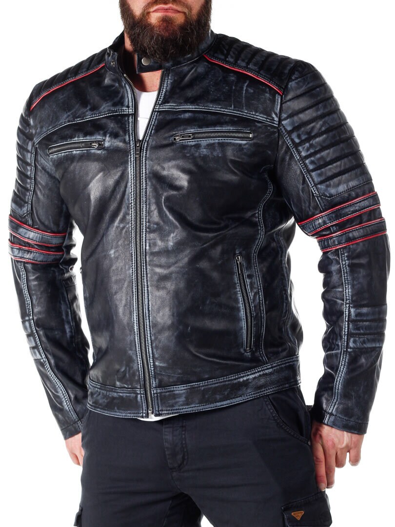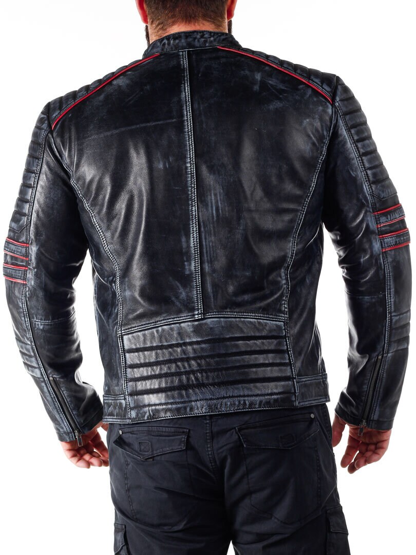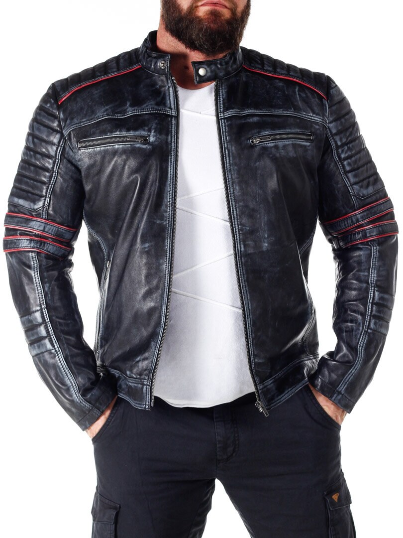Tøff jakke i ekte skinn med slitt look. Den har lav krage med knepping, polstrede deler og detaljer i kontrastfarge. Fire lukkbare frontlommer og to innerlommer.