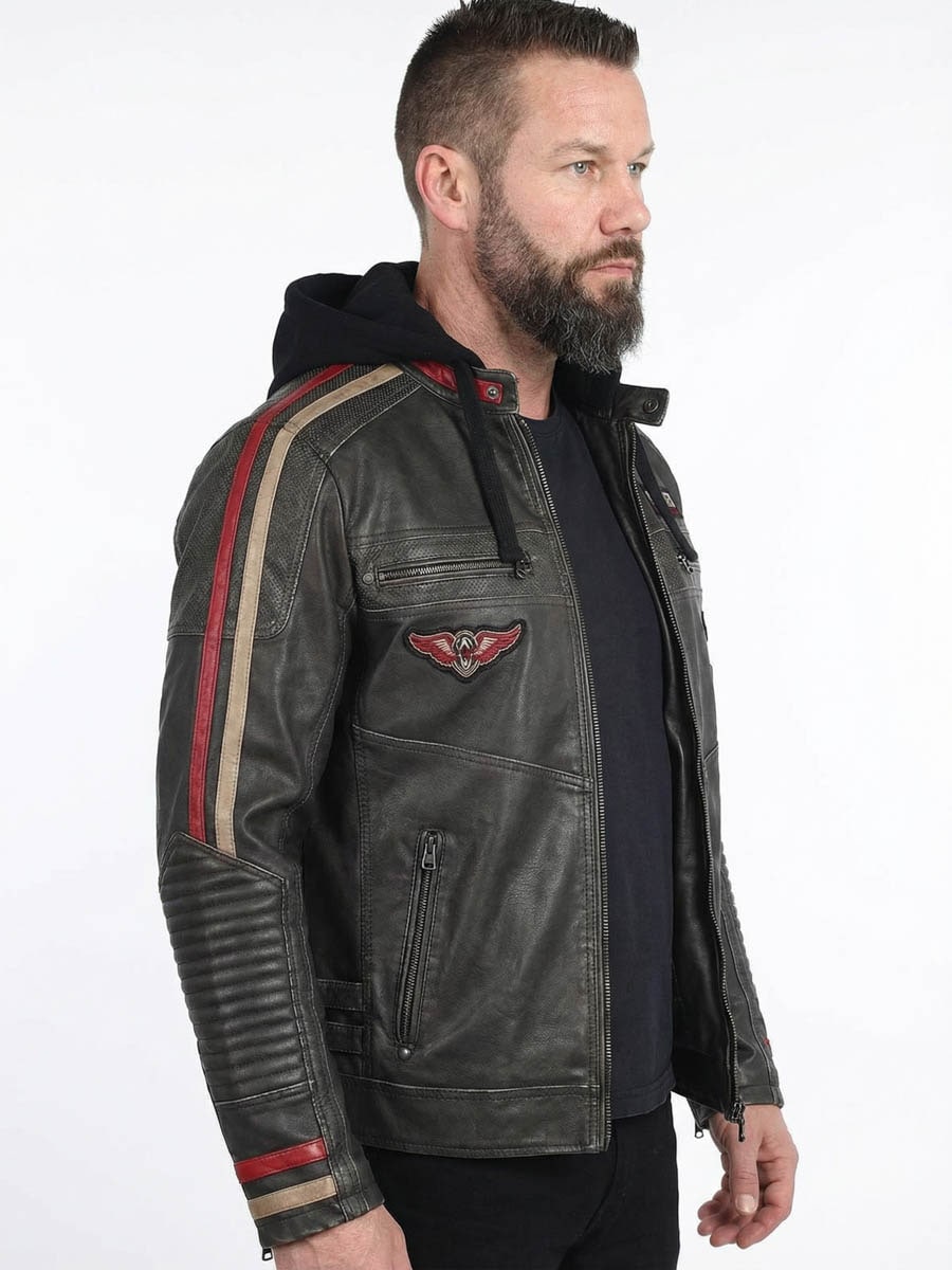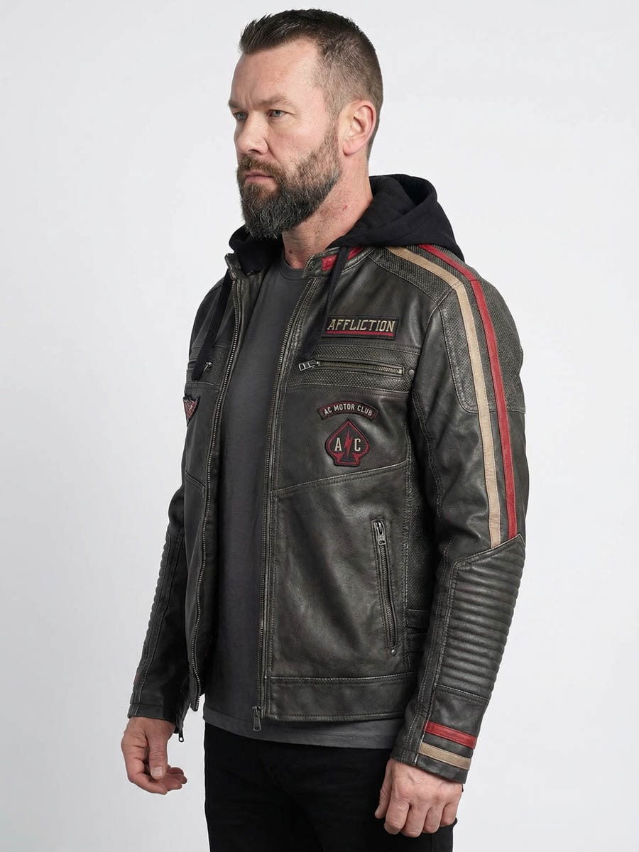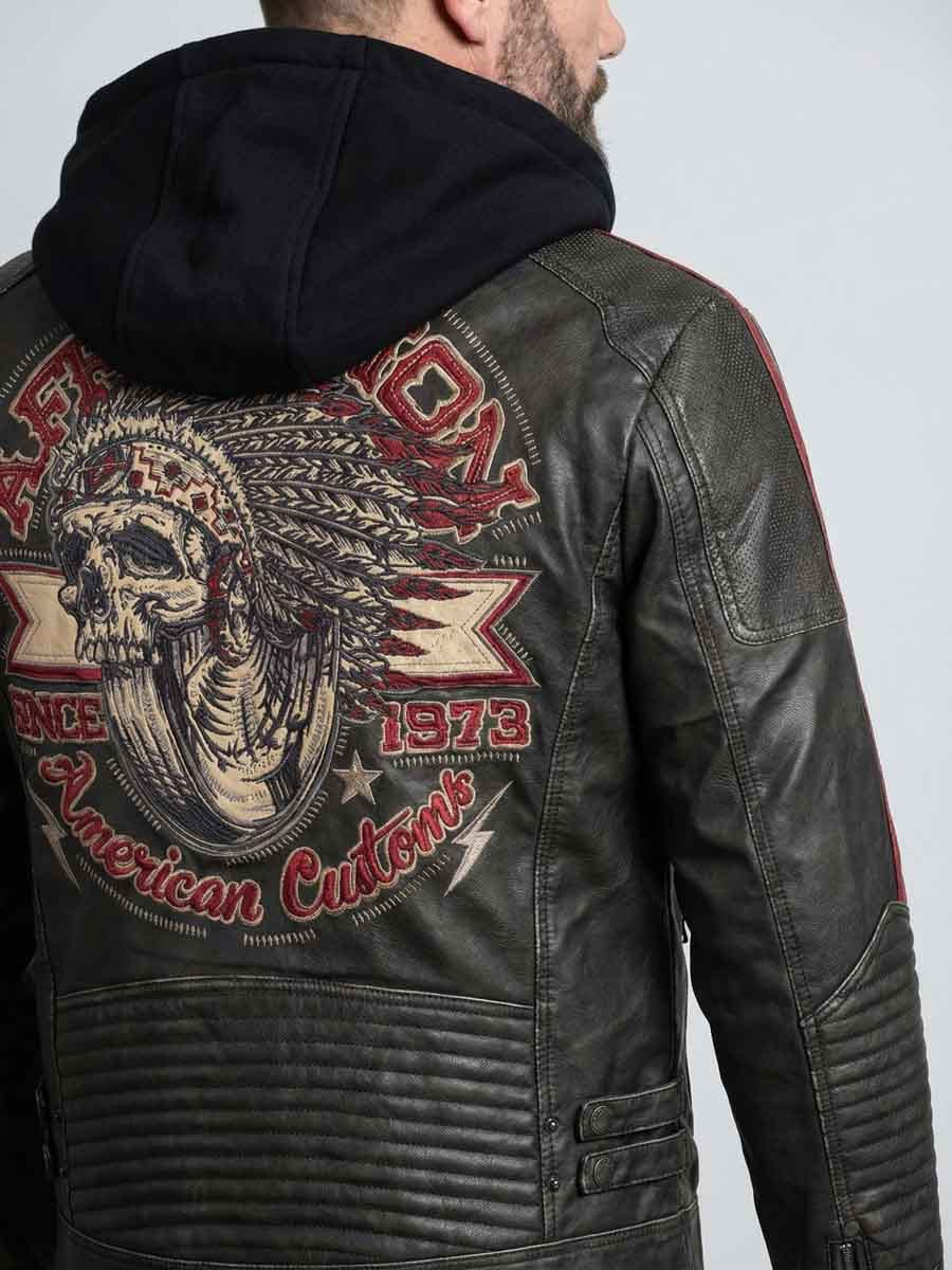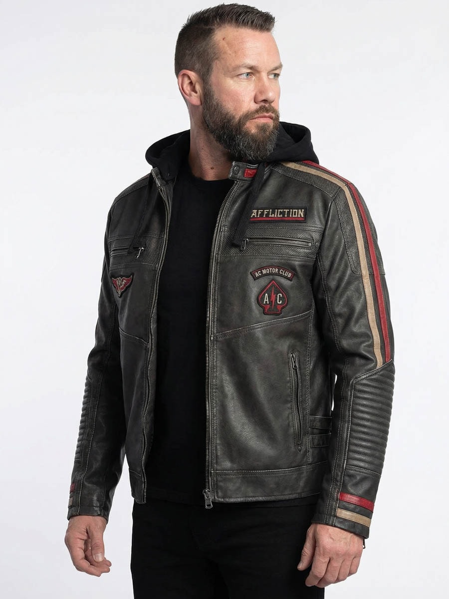 En rocka, motorsykkelinspirert jakke med kraftfull attitude og detaljer som virkelig skiller seg ut. Laget i slitesterkt PU-skinn med quiltede partier, dekorative detaljer og broderte patches. På baksiden prydes jakken av et stort, ikonisk Affliction-motiv som gir den masse karakter. Jakken er lett fôret for ekstra komfort og varme, og den myke hetten kan tas av når du vil variere stilen. Perfekt for deg som vil ha en tøff, behagelig og statement-sterk jakke til hverdags!