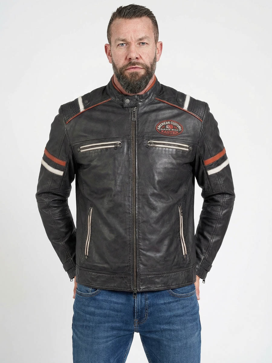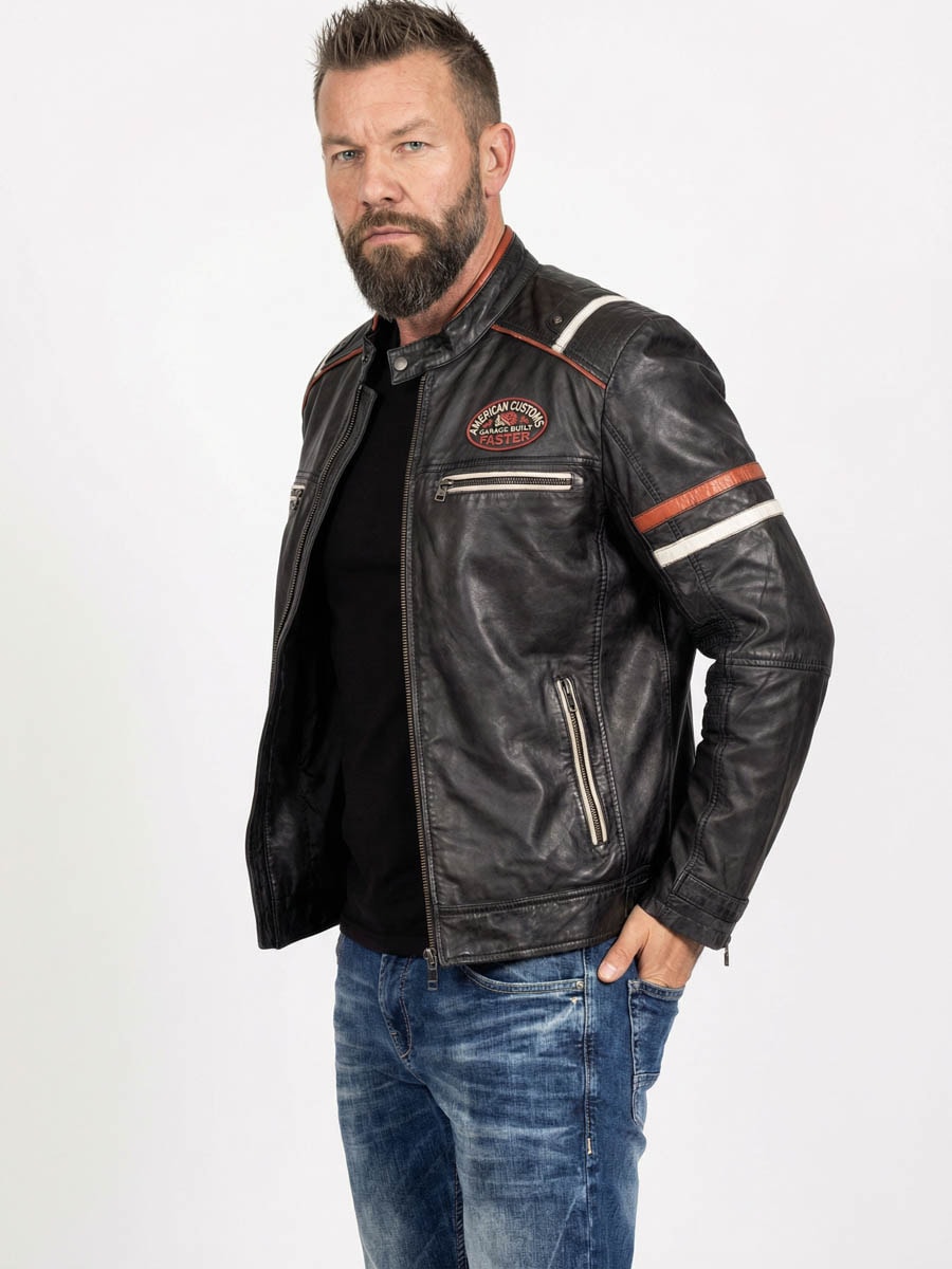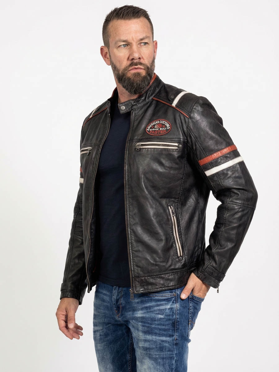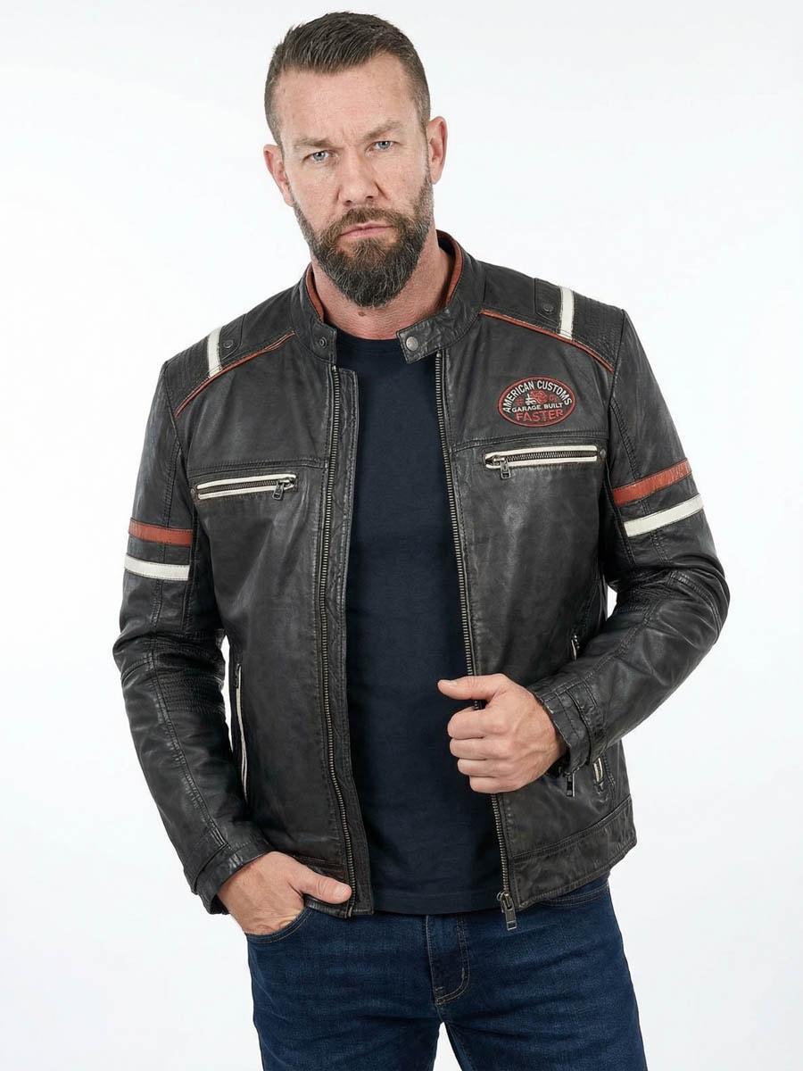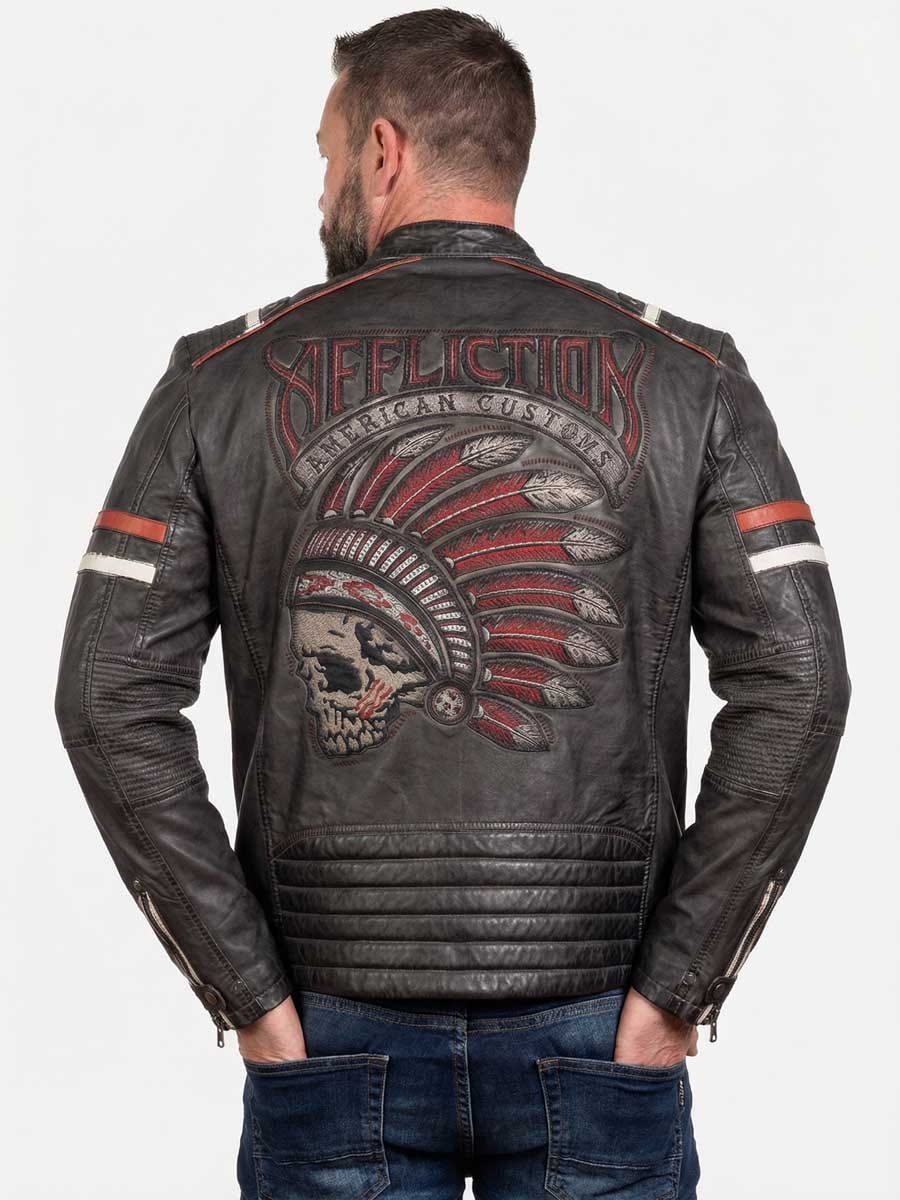 En robust og detaljert jakke i ekte skinn som bare blir finere med tiden. Den har et kraftfullt design med kontrastsĂžmmer, broderte patches og flere glidelĂ„slommer pĂ„ fronten. PĂ„ ryggen sitter et stort, imponerende brodert motiv som gir jakken den ikoniske Affliction-looken. Perfekt for deg som vil ha kvalitet og en tĂžff stil – enten du kjĂžrer motorsykkel eller bare liker fĂžlelsen!