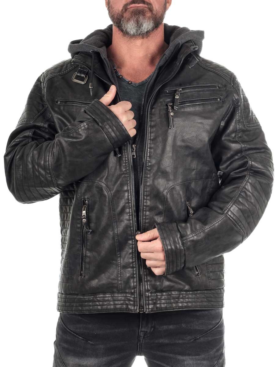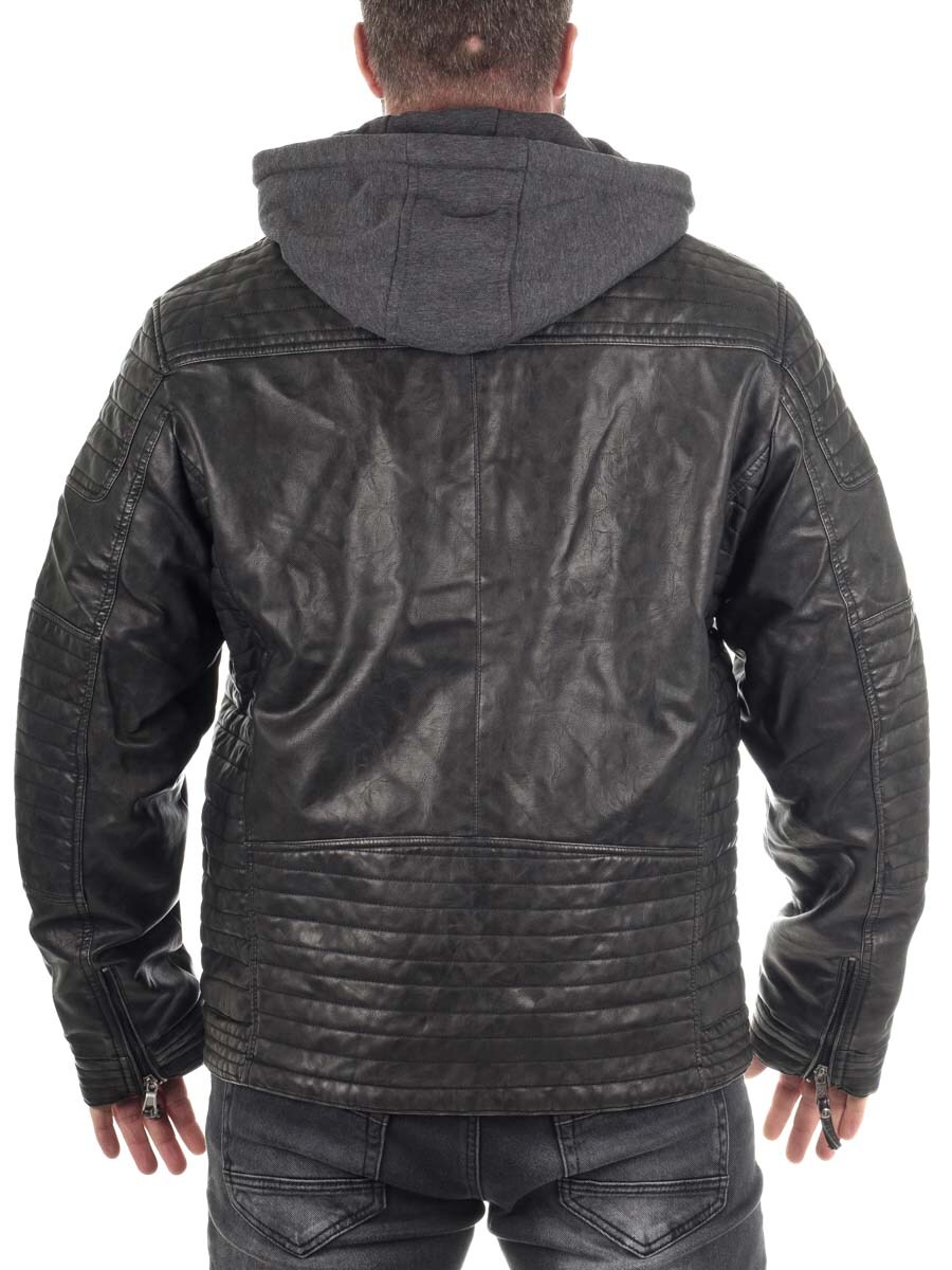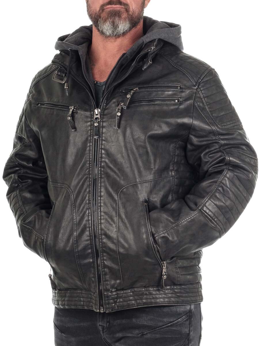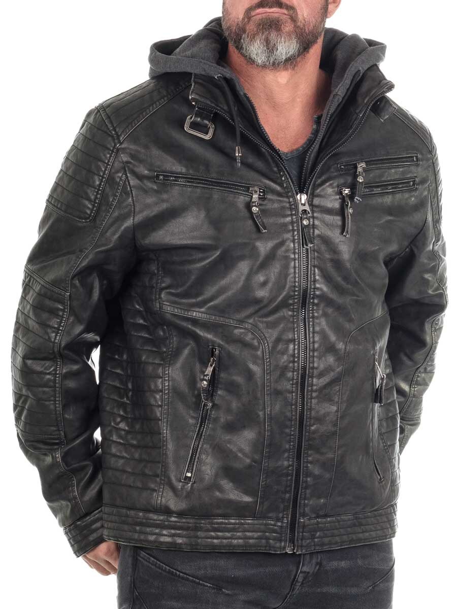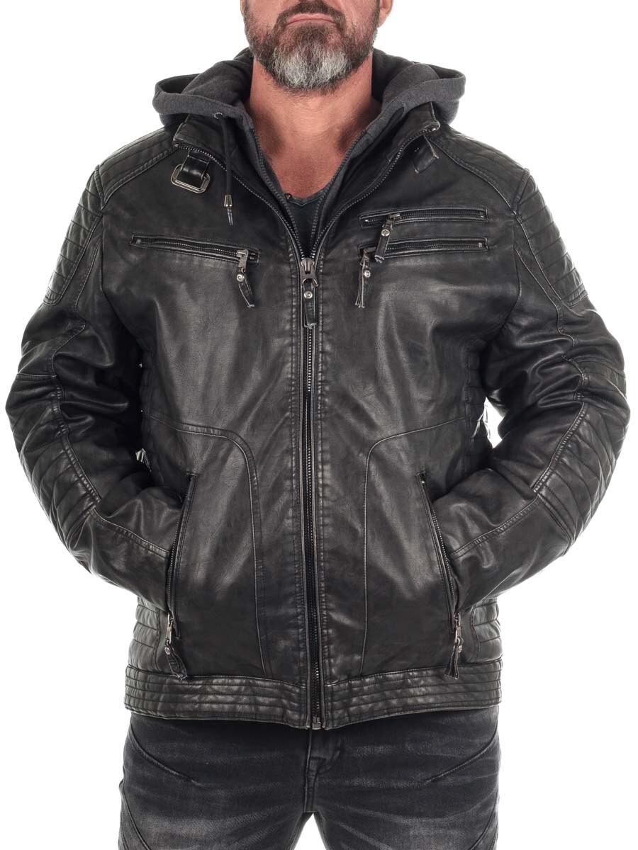 Lett fôret jakke i imitert skinn med bikerinspirert stil. Det slitesterke og lettstelte PU-yttermaterialet tåler vær og vind, samtidig som den holder stilen uansett anledning. Jakken har en avtakbar sweatshirt-del med hette, slik at du enkelt kan bytte mellom en ren bikerlook eller en mer sporty streetstil. Utstyrt med flere praktiske glidelåslommer.